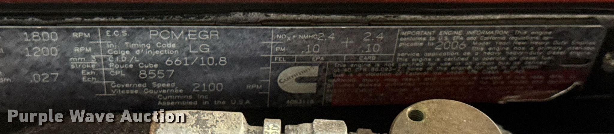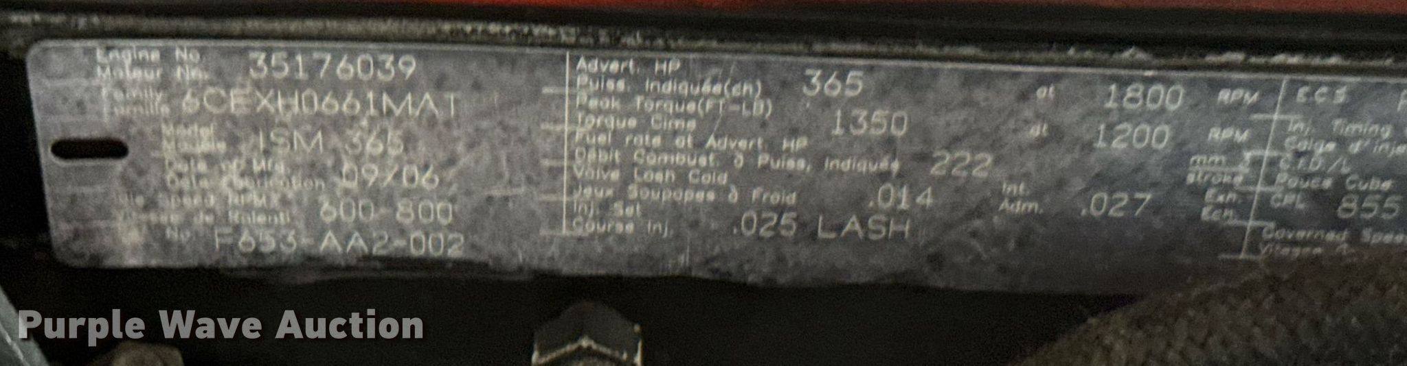 Purple Wave is selling a used Engine in Kansas. This item is a Cummins ISM 365 engine with the following: Serial: 35176039