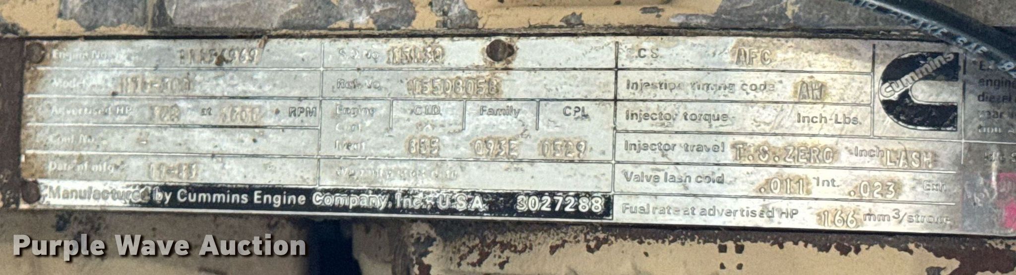 Purple Wave is selling a used Engine in Kansas. This item is a Cummins NTC-300 engine with the following: Serial: 11134969