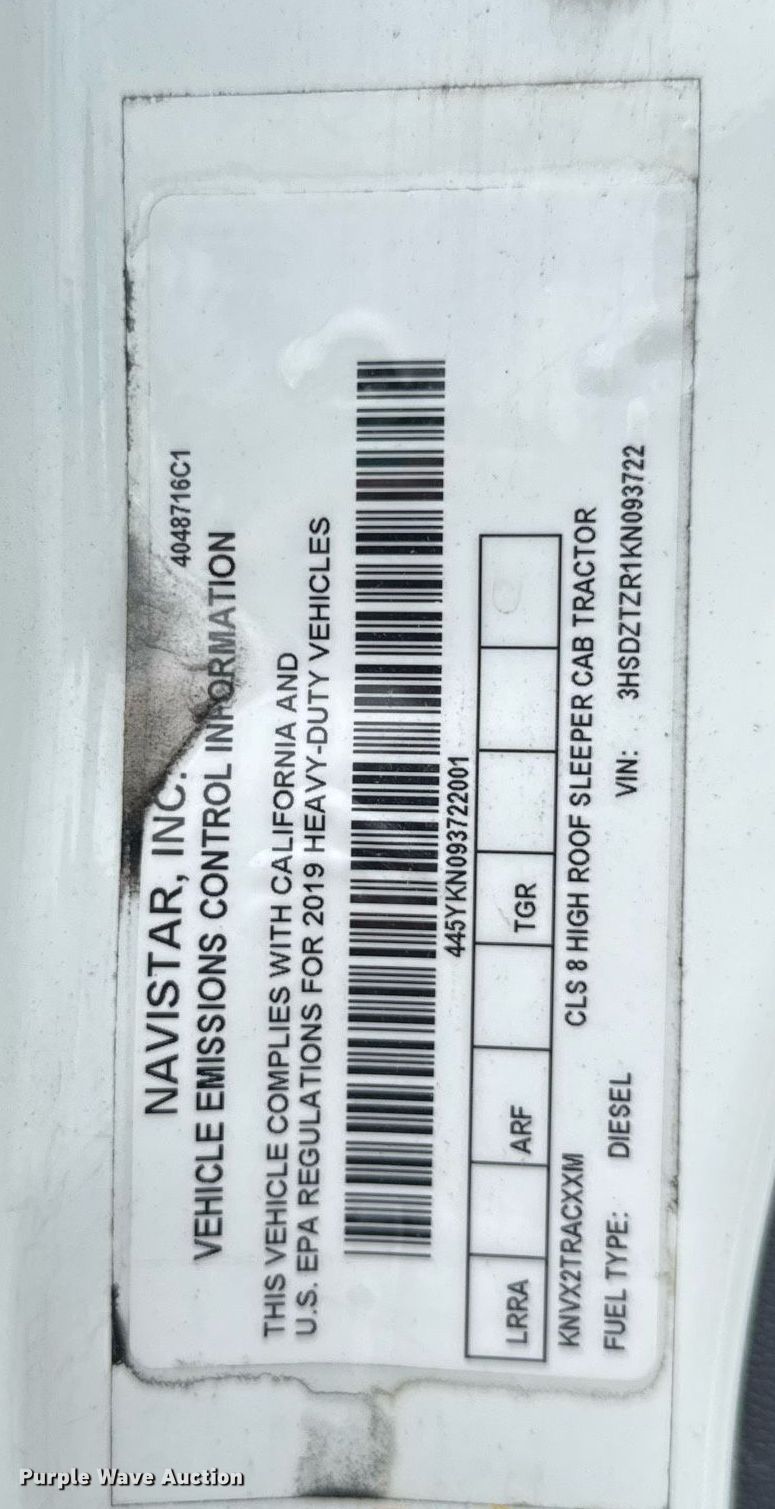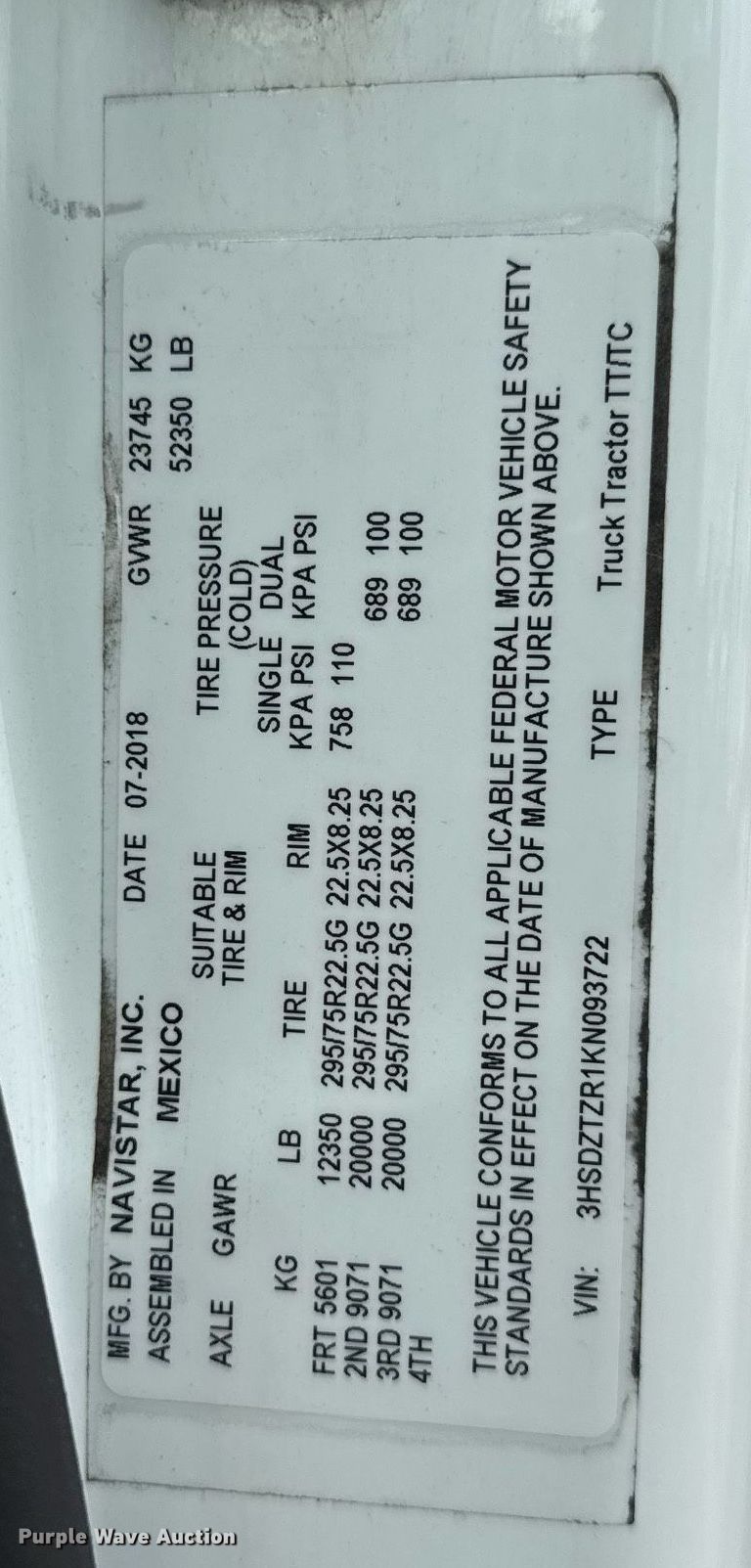 2019 International LT625 semi truck. Miles: 449,833 on odometer, Hours: 15,508 on meter, VIN: 3HSDZTZR1KN093722. Engine International A26, Displacement: 12.4L, Cylinders: 6, Fuel type: Diesel, Engine brake. Transmission Automated manual. Chassis Axles: Tandem, Differential lock: Inter-axle, Suspension: Air Dump valves, Brakes: Air, GVWR: 52,350 lbs. Interior AC, Heat, Heated mirrors, Power windows, Power locks, Cruise control, Air ride cab, Sleeper Sleeper length: 70", Beds: Single, Rear climate control. Features Deck plate: Aluminum, Fifth wheel type: Air operated, Sliding, Fuel tank: Dual. Tires Size: 295/75R22.5. Pennsylvania title. Title distribution may be delayed up to 14 days from verification of funds. Oasis Logistics. York, SC 29745