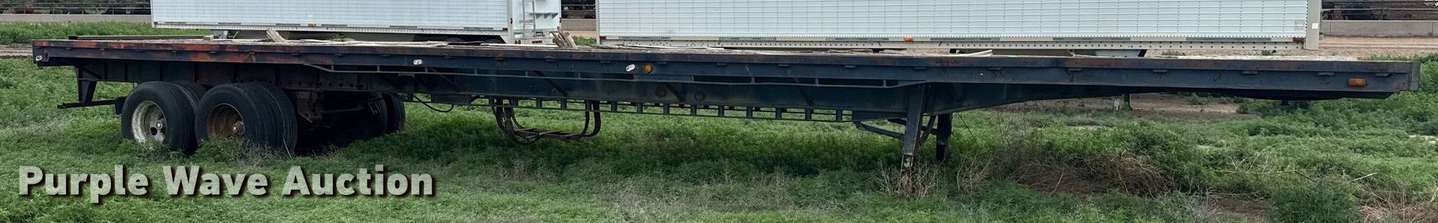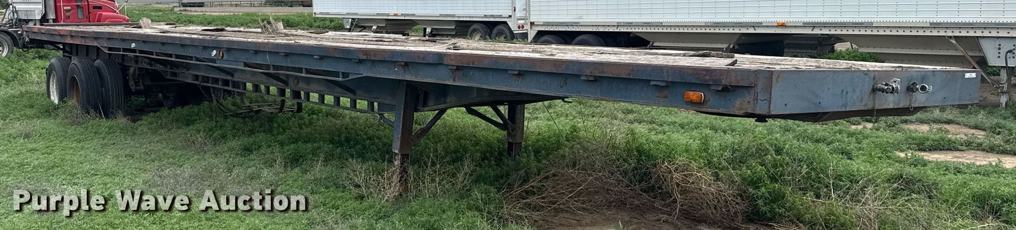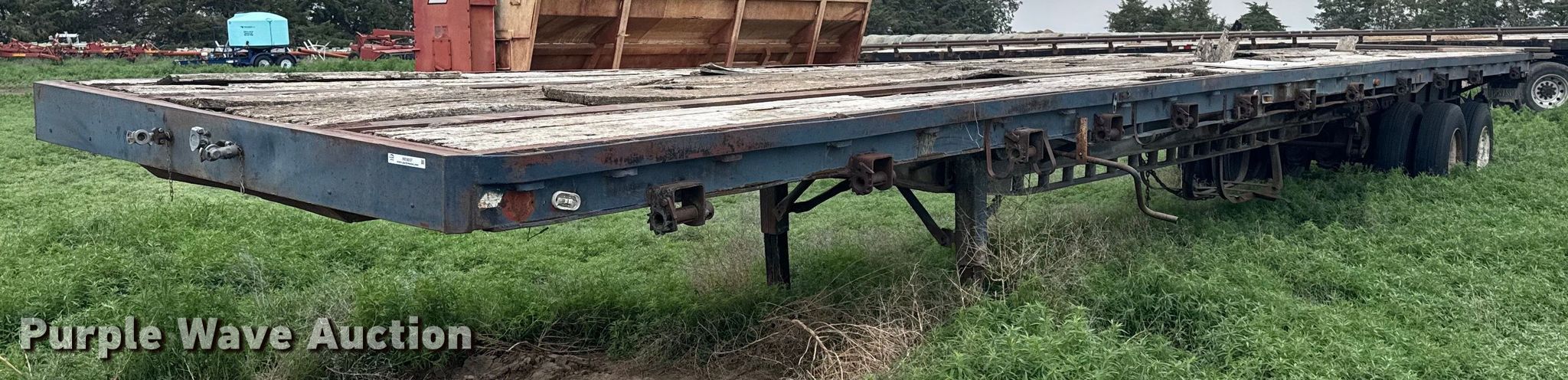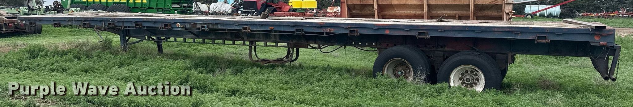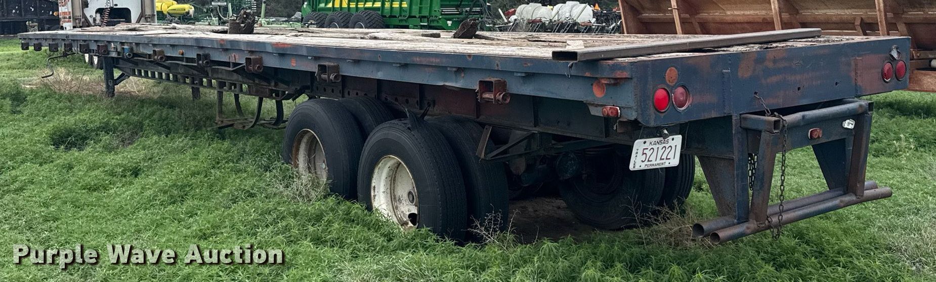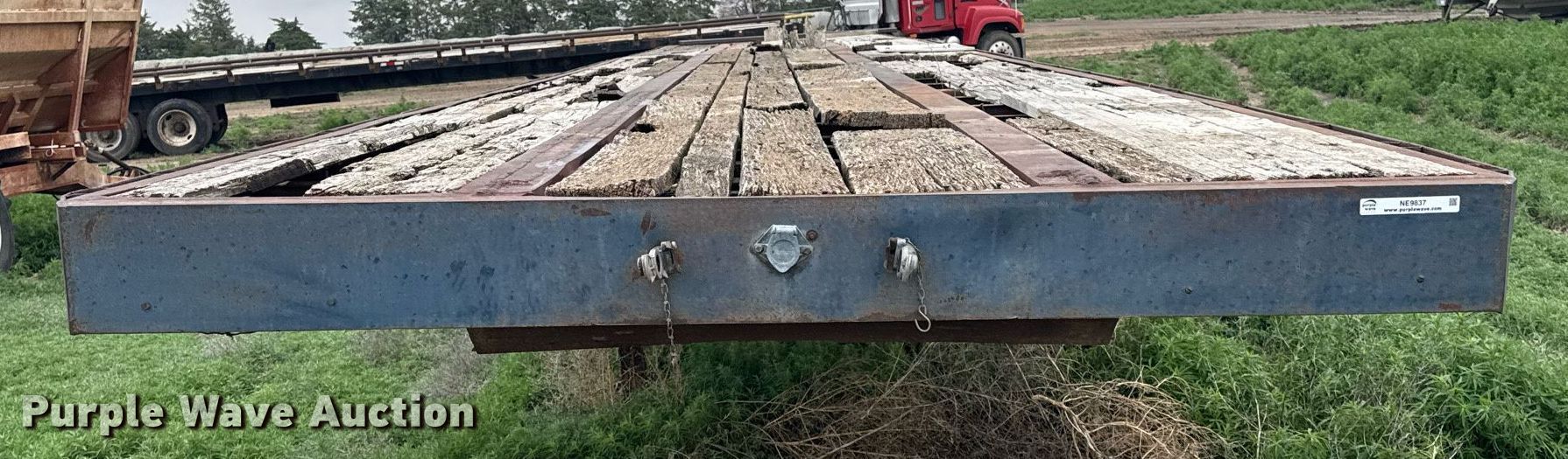 1966 Nabo Platform flatbed trailer. VIN: 11534FB. Dimensions Overall: 49' L x 96' W, Deck: 47' 10" L x 89" W, Deck height: 53". Features Deck type: Wood. Chassis Landing gear: Dual, Suspension: Spring, Brakes: Air, Axles: Tandem. Tires Steel wheels, Size: 11R22.5. Notes Deck boards damaged, Tire blown Tire will be replaced prior to auction. Kansas title. Title distribution may be delayed up to 14 days from verification of funds. Rexford, KS 67753