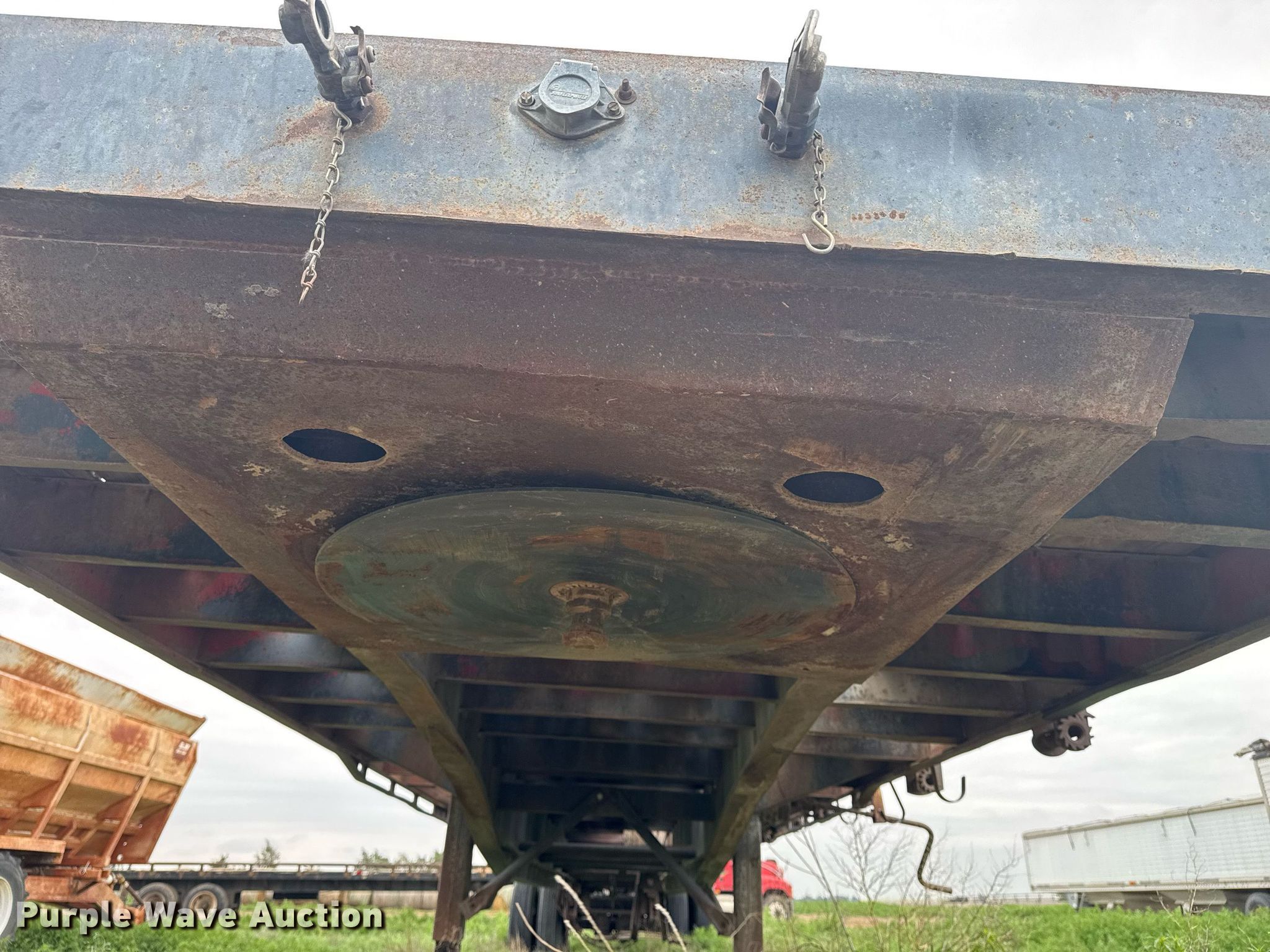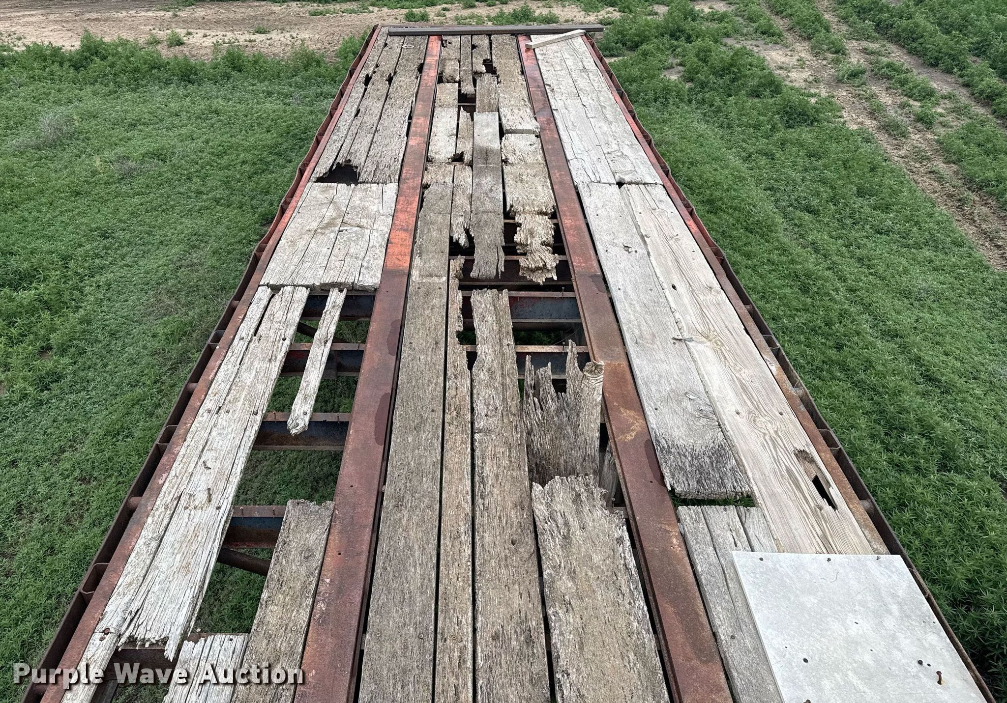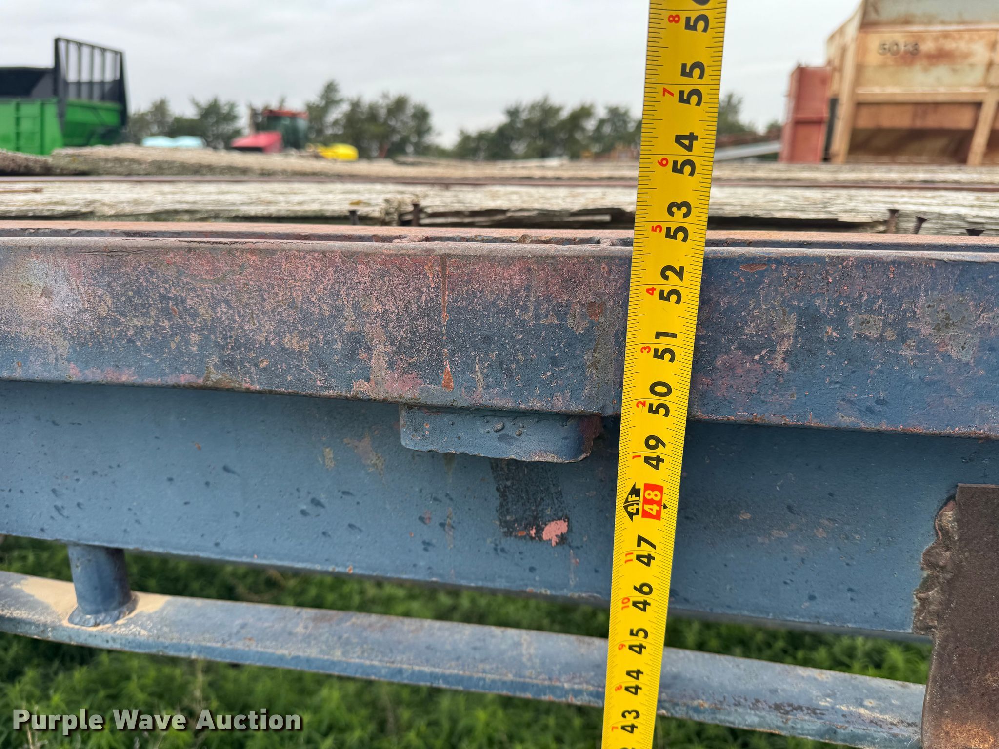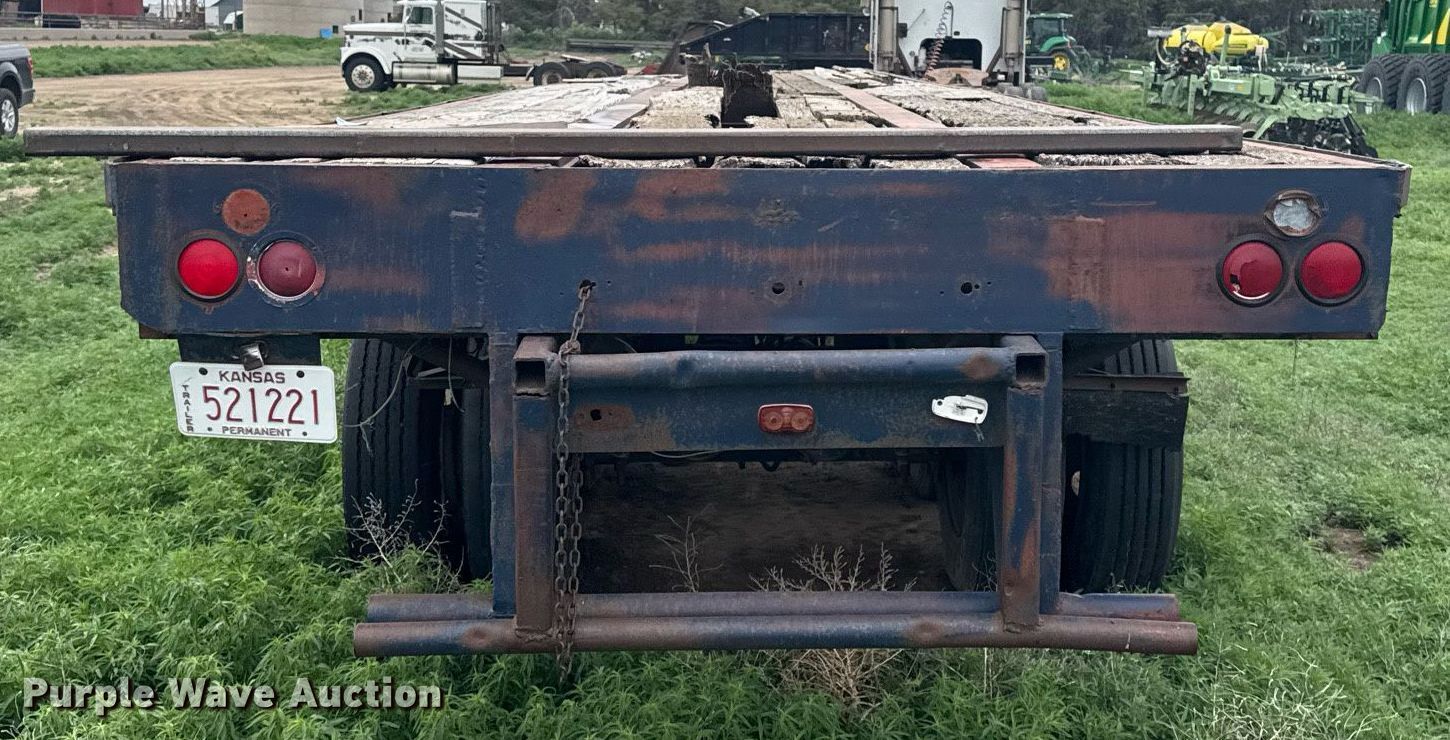 1966 Nabo Platform flatbed trailer. VIN: 11534FB. Dimensions Overall: 49' L x 96' W, Deck: 47' 10" L x 89" W, Deck height: 53". Features Deck type: Wood. Chassis Landing gear: Dual, Suspension: Spring, Brakes: Air, Axles: Tandem. Tires Steel wheels, Size: 11R22.5. Notes Deck boards damaged, Tire blown Tire will be replaced prior to auction. Kansas title. Title distribution may be delayed up to 14 days from verification of funds. Rexford, KS 67753