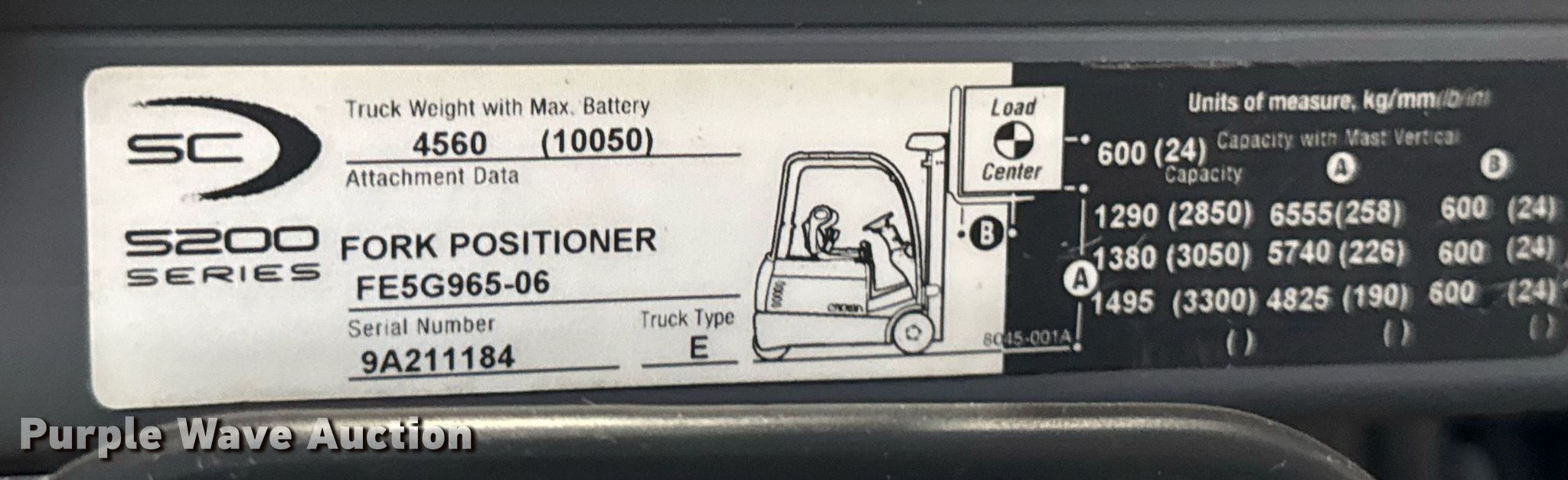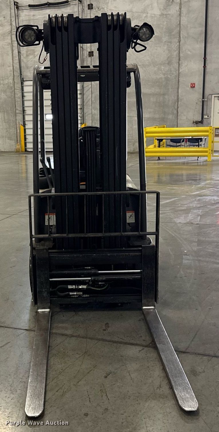 2014 Crown SC5245-40 forklift. Hours: 8,102 on meter, Serial: 9A211184, Unit #: SFS2263. Electric Motor Volts: 36. Transmission Electric drive. Operators station OROPS. Features Maximum lift capacity: 3,300 lbs, Maximum lift height: 258", Collapsed mast height: 89", Mast stages: 4, Side shift, Mast tilt, Fork positioner, Fork length: 54". Tires Front: 18x7x12.125, Rear: 15x5x11.25, Solid. Ferguson. Bolingbrook, IL 60490