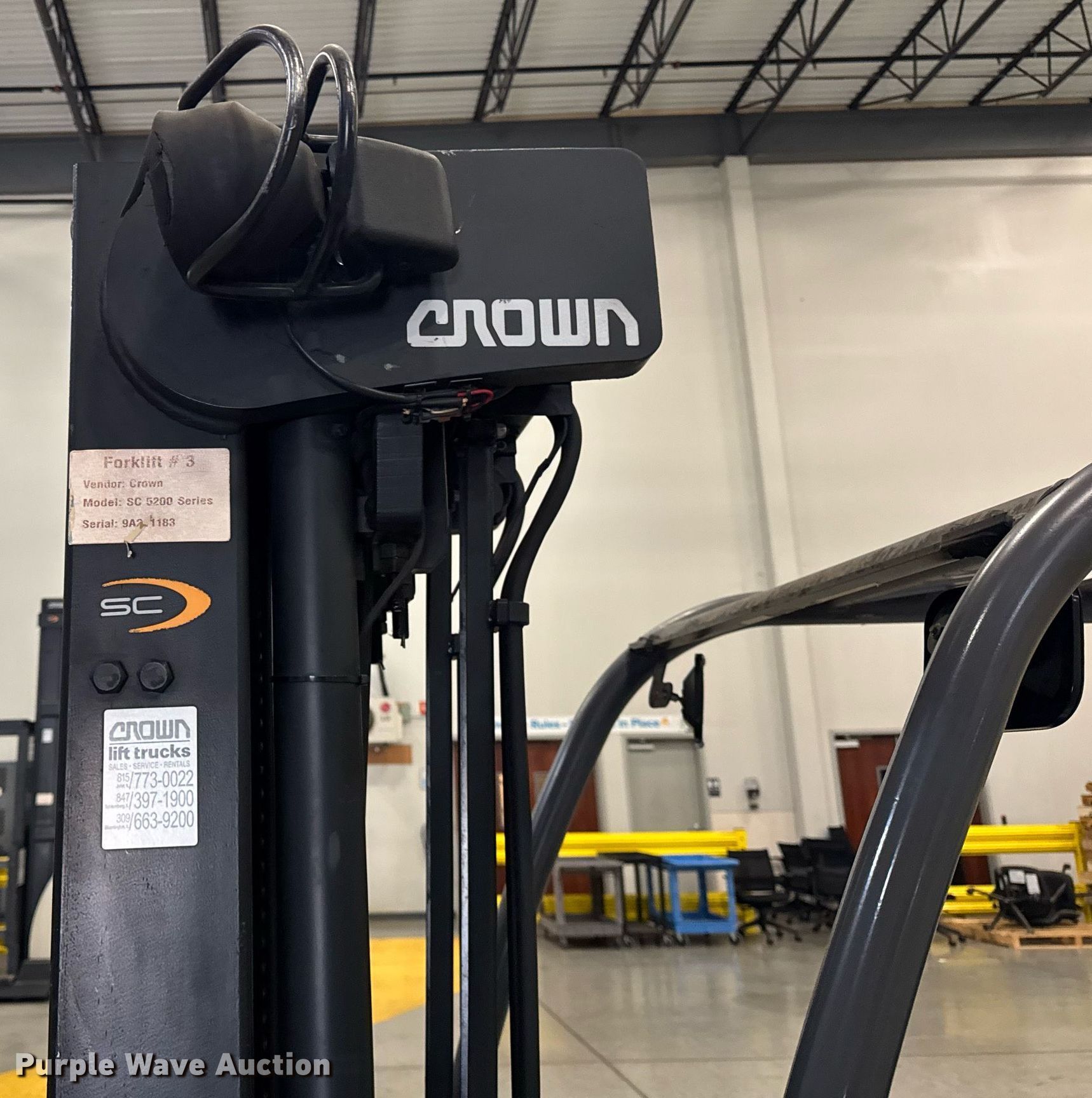 Purple Wave is selling a used Warehouse Forklift in Illinois. This item is a 2014 Crown SC5245-40 forklift with the following: Hours: 7,627 on meter, Serial: 9A211183, Unit #: SFS2256