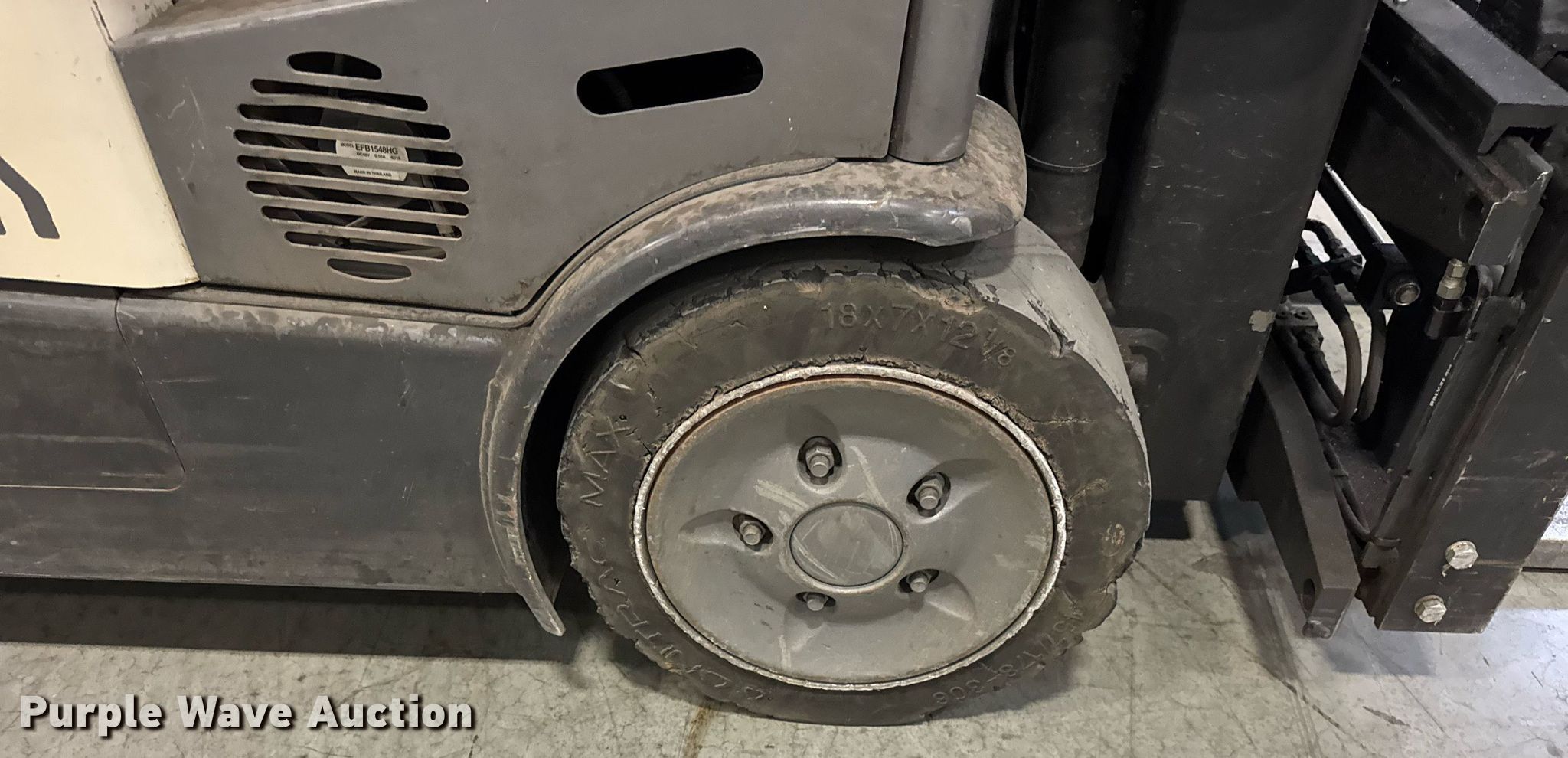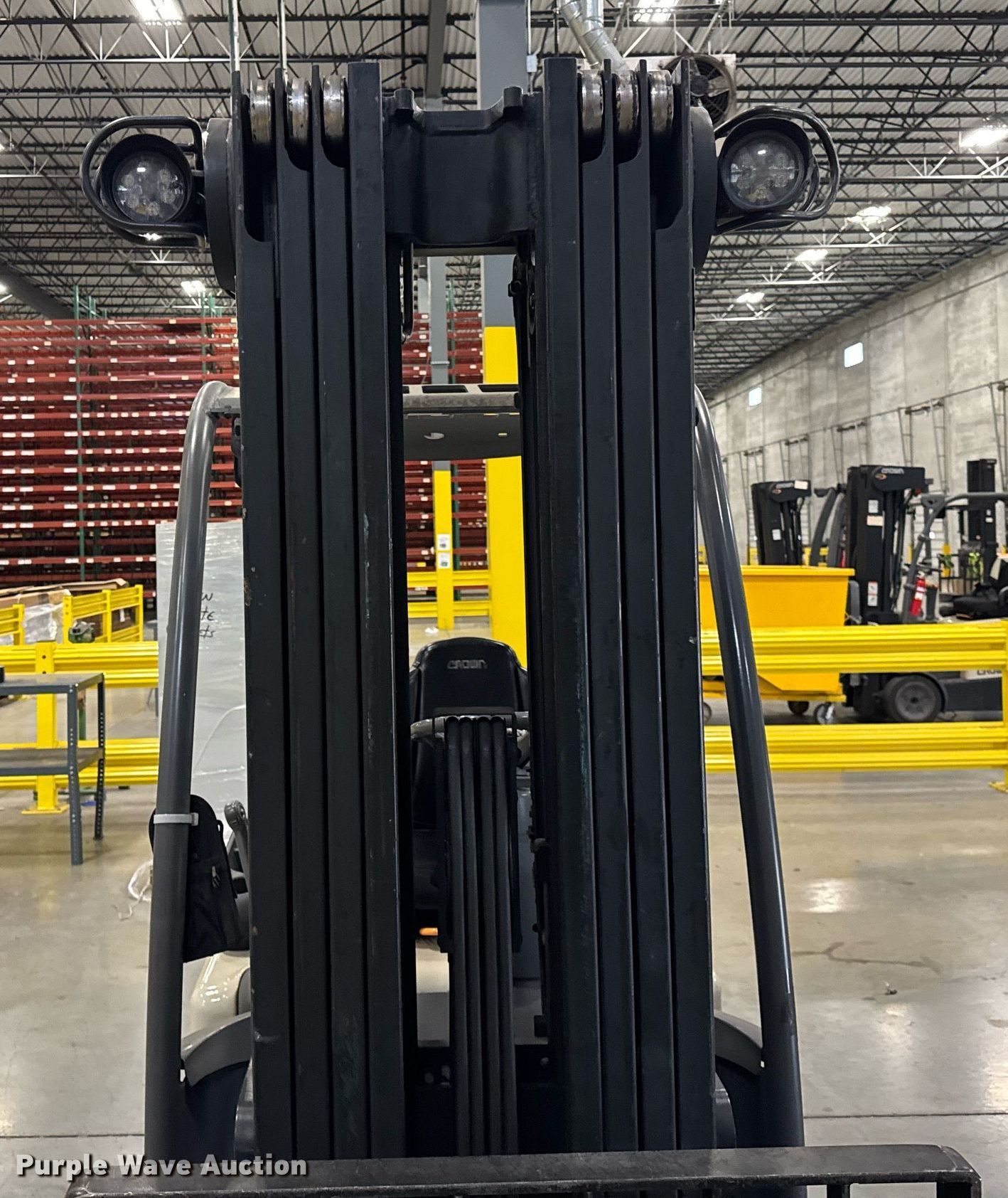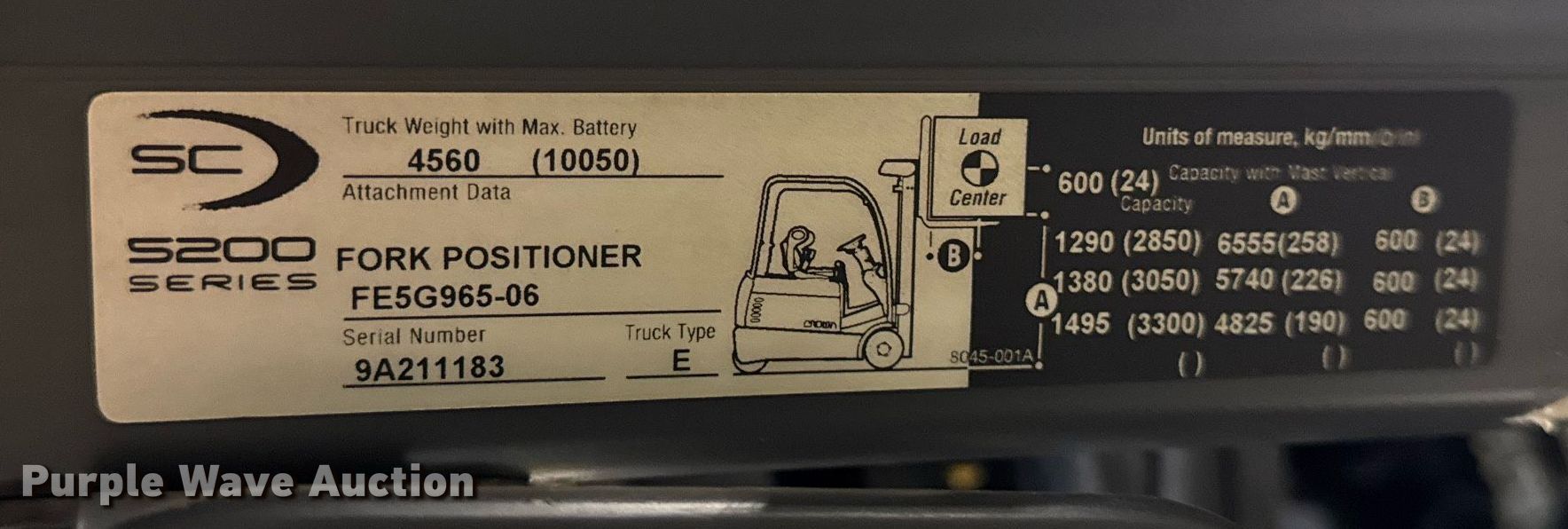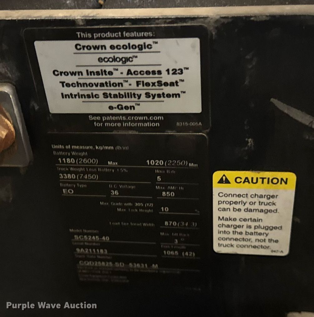 2014 Crown SC5245-40 forklift. Hours: 7,627 on meter, Serial: 9A211183, Unit #: SFS2256. Electric Motor Volts: 36. Transmission Electric drive. Operators station OROPS. Features Maximum lift capacity: 3,300 lbs, Maximum lift height: 258", Collapsed mast height: 89", Mast stages: 4, Side shift, Mast tilt, Fork positioner, Fork length: 54". Tires Front: 18x7x12.125, Rear: 15x5x11.25, Solid. Ferguson. Bolingbrook, IL 60490