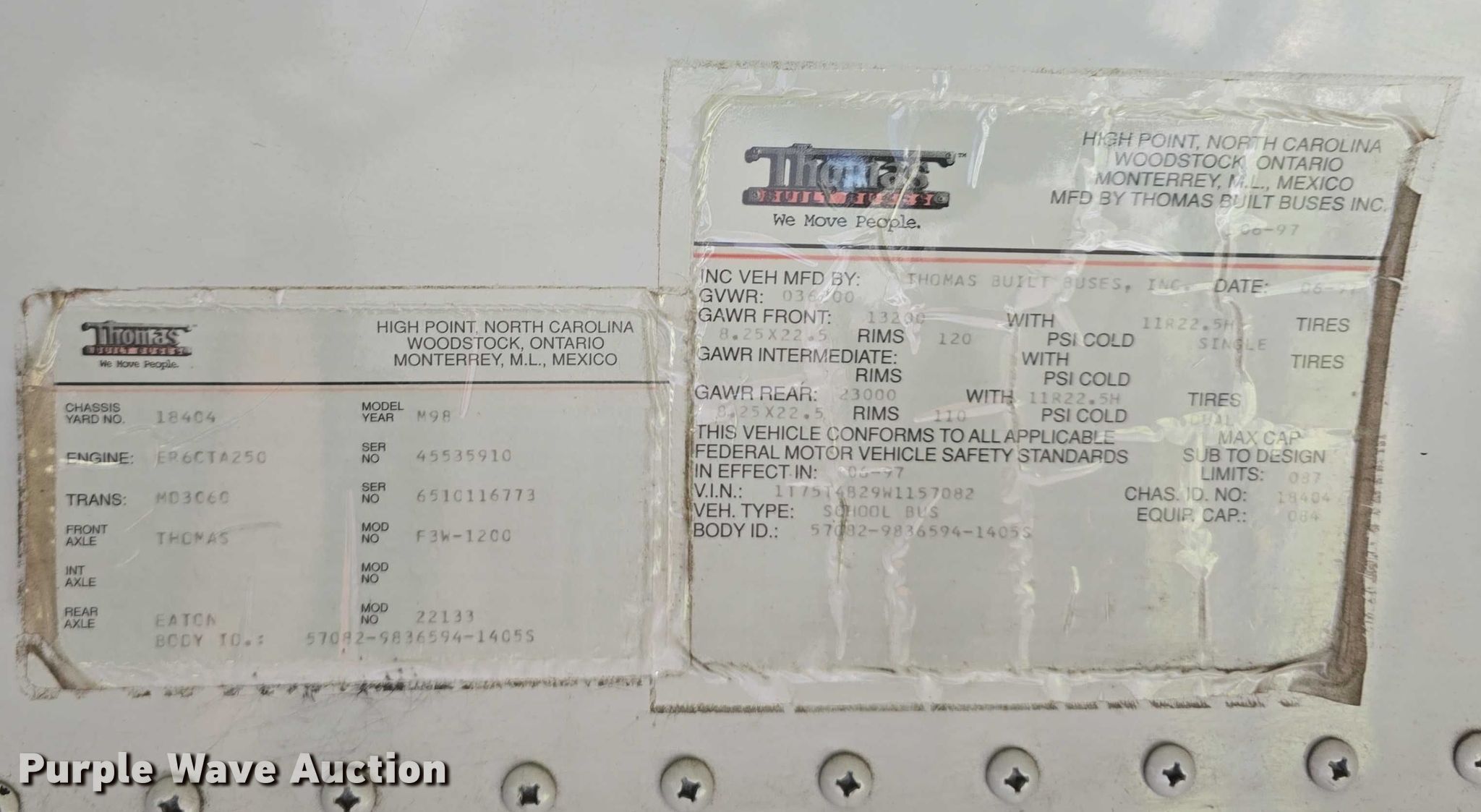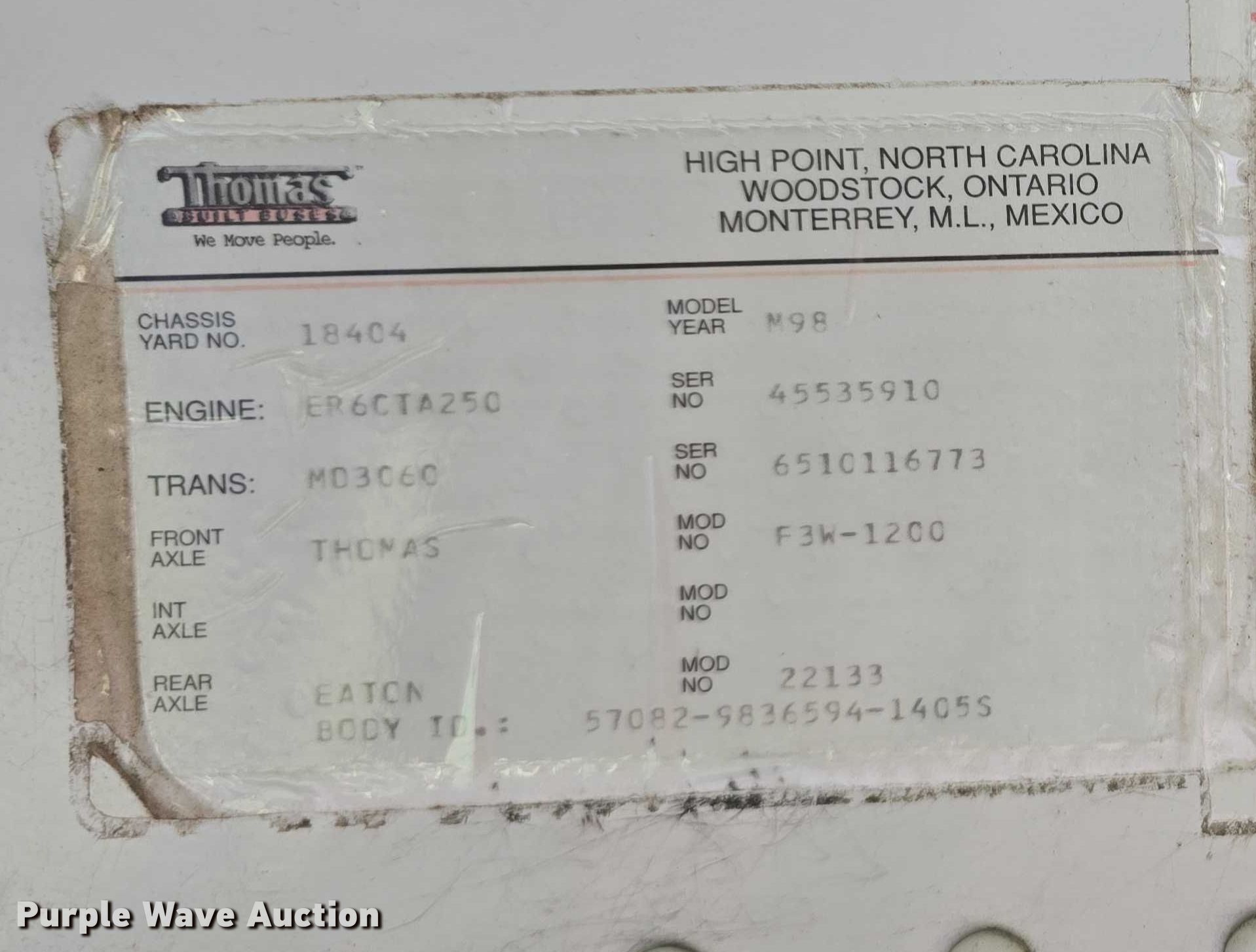 Take a look at this used 1998 Thomas Built Saf-T-Liner ER school bus being sold on July 16th, 2025 in the SOLD! July 16 Vehicles and Equipment Auction made by Thomas Built. Take a look at all of the item information below or take a look at similar auctions for Transit Vehicles.