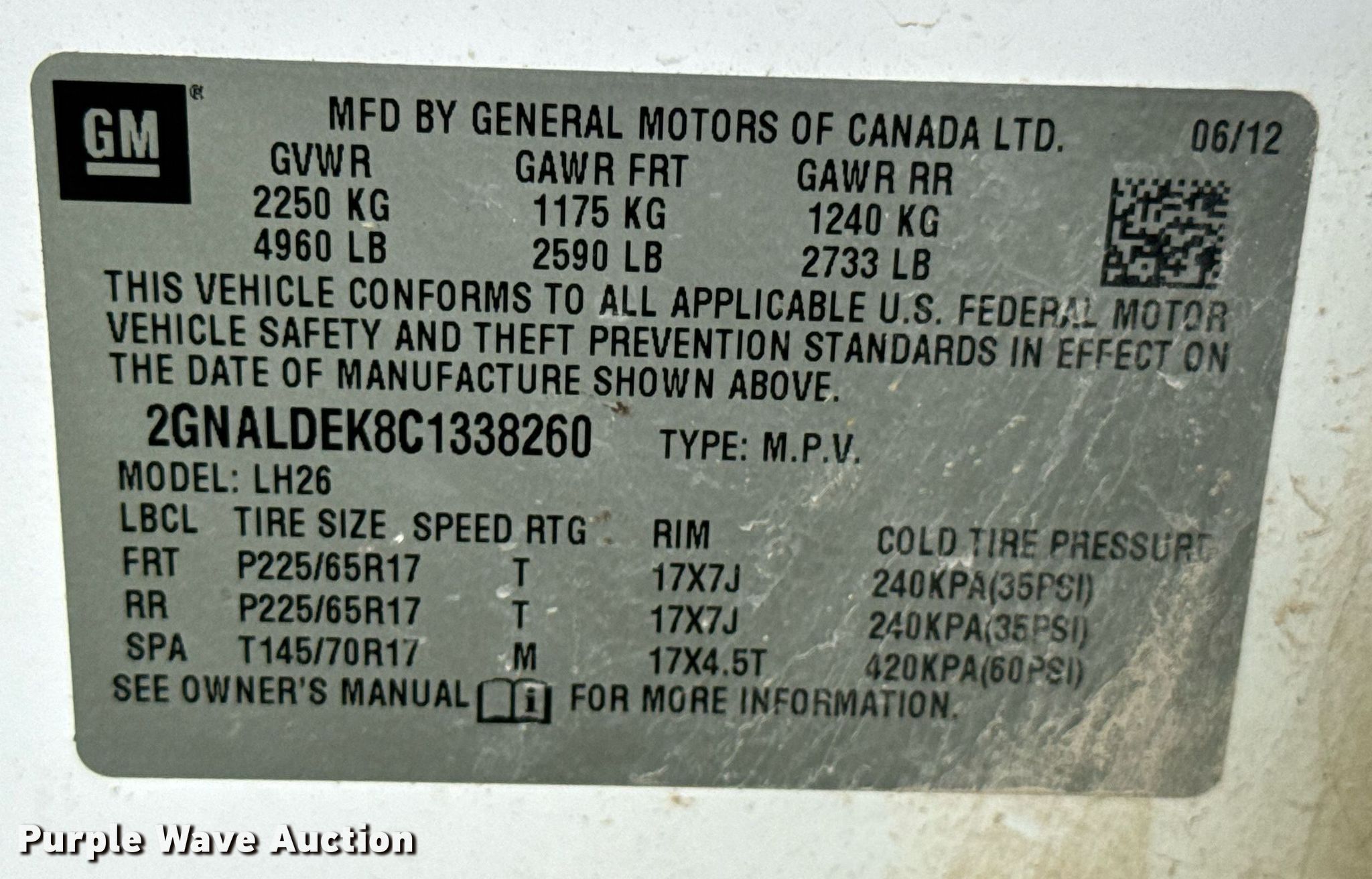Purple Wave is selling a used Passenger Vehicle in Kansas. This item is a 2012 Chevrolet Equinox LT SUV with the following: Miles: 100,021 on odometer, VIN: 2GNALDEK8C1338260