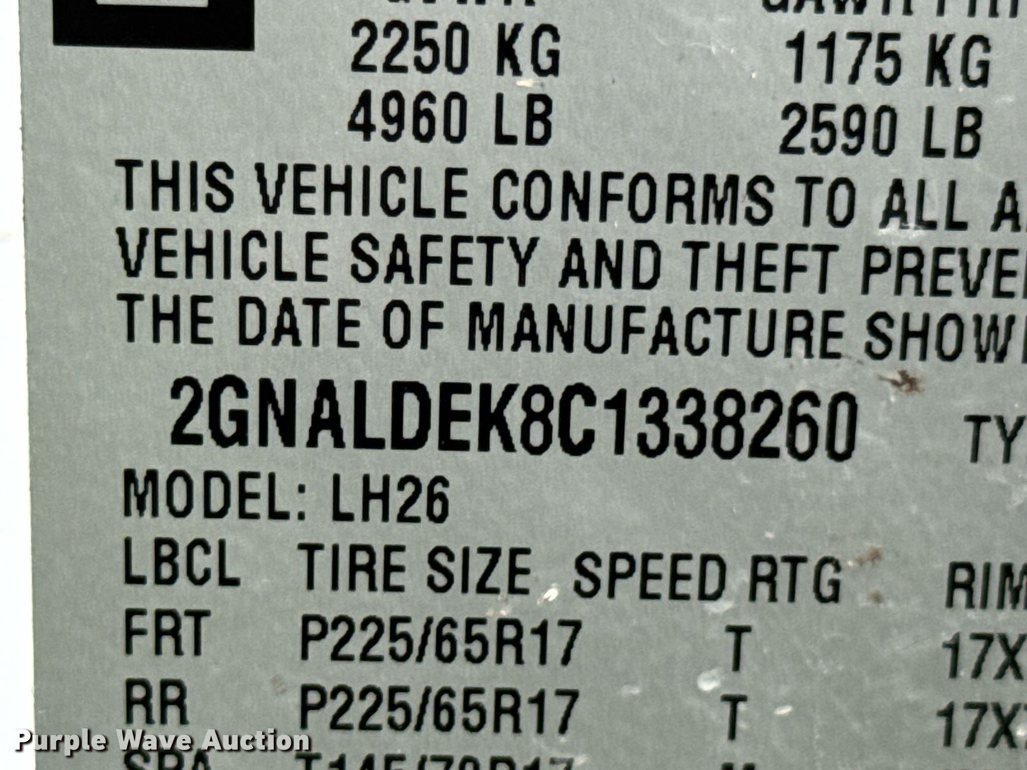 2012 Chevrolet Equinox LT SUV. Miles: 100,021 on odometer, VIN: 2GNALDEK8C1338260. Engine Displacement: 2.4L L4 DOHC, Cylinders: 4, Fuel type: Gas. Transmission Automatic. Interior AC, Heat, Seat: Power driver, Heated mirrors, Power windows, Power locks, Cruise control. Tires Size: 225/65R17. Notes Dash warning indicator: Check engine, Airbag, Dead battery, Engine partially disassembled , Parts may be missing, Non-operational unit Unit must be towed or hauled. Kansas title. Title distribution may be delayed up to 14 days from verification of funds. Thayer, KS 66776