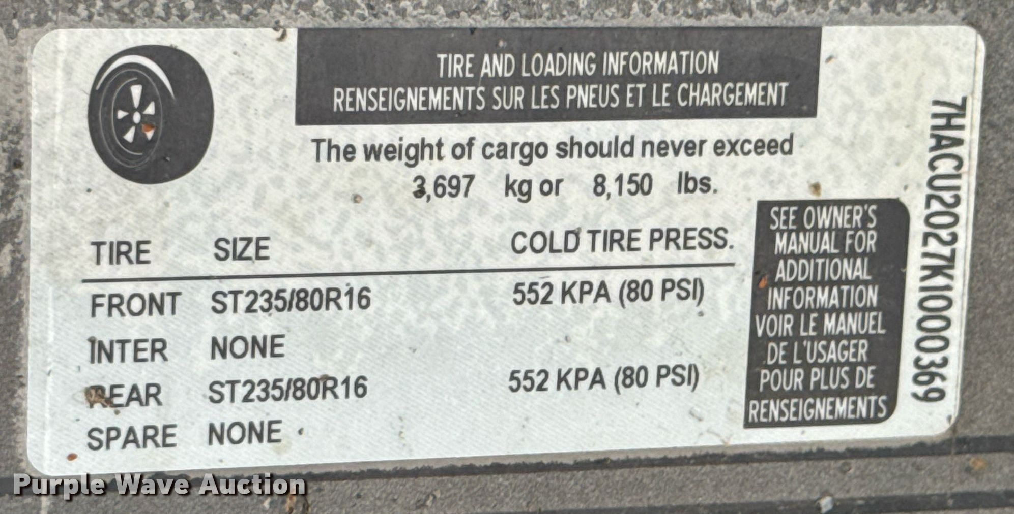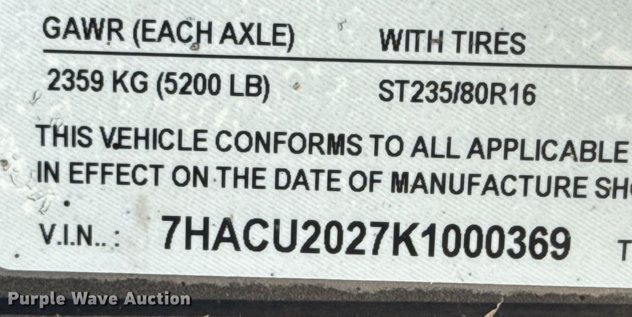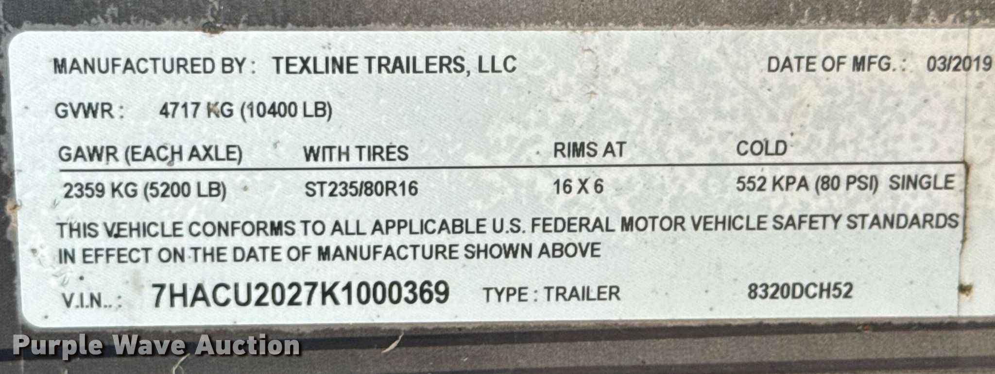 Purple Wave is selling a used Car or Utility Trailer in Oklahoma. This item is a 2019 Texline 8320DCH52 utility trailer with the following: VIN: 7HACU2027K1000369
