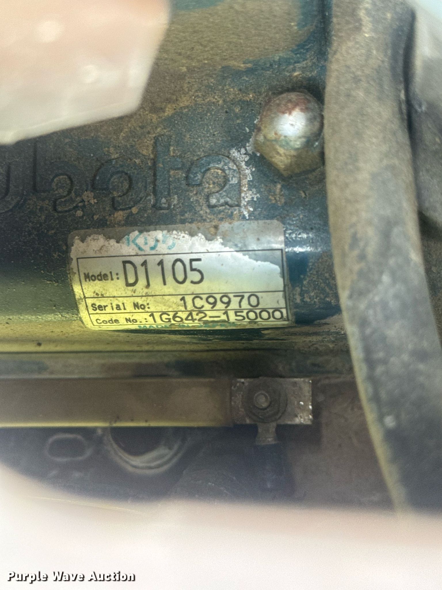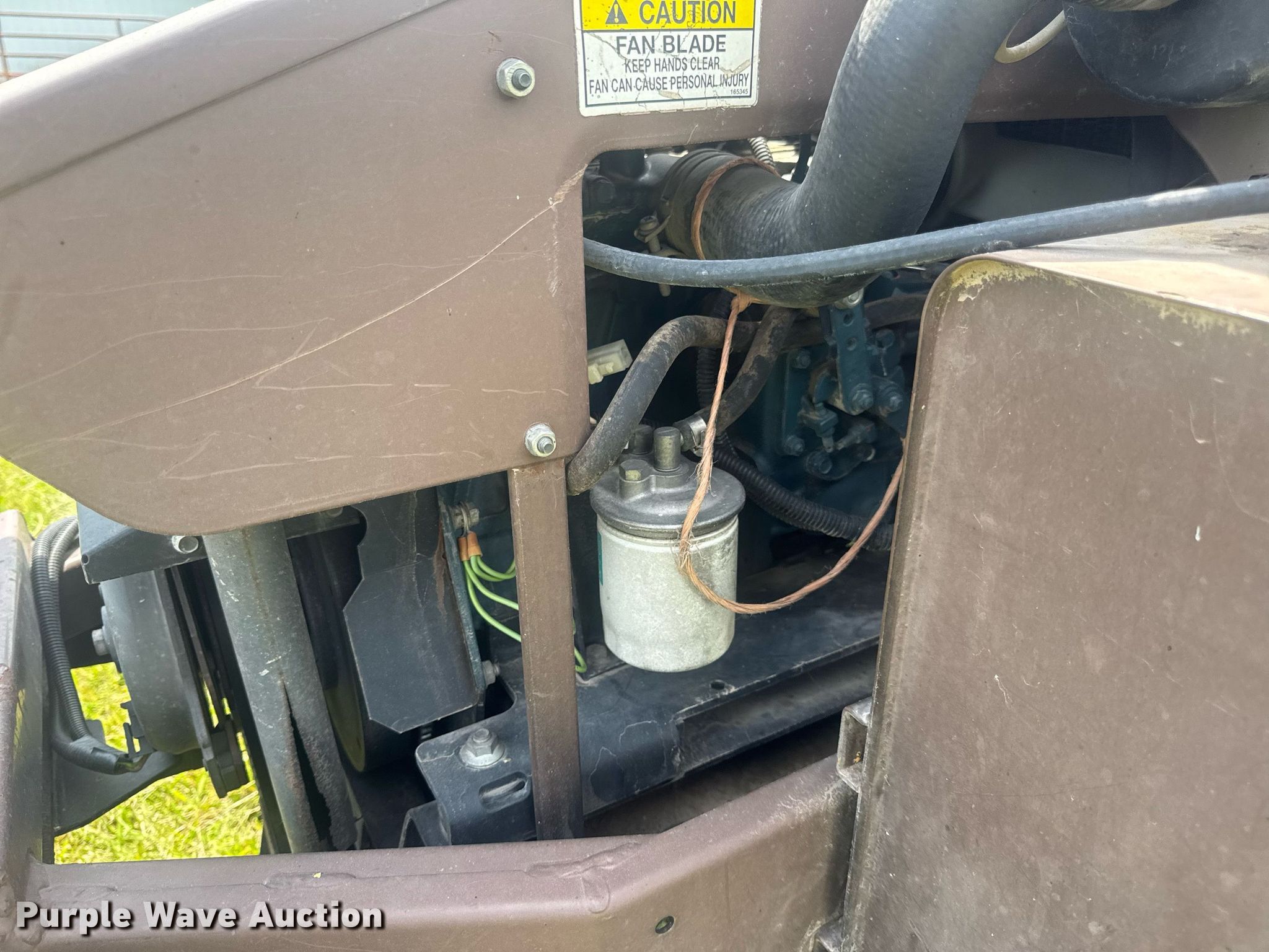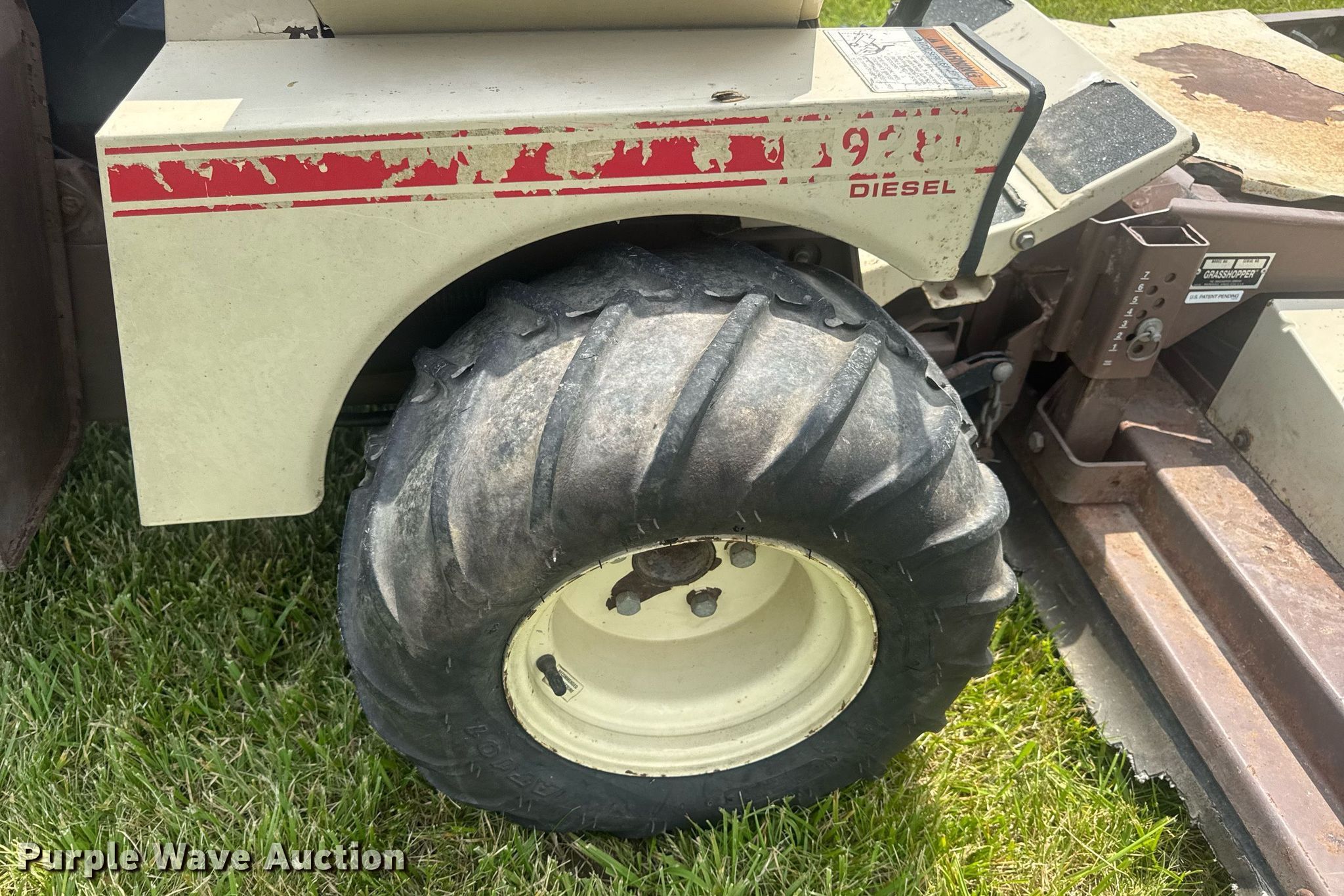 Grasshopper 928D ZTR lawn mower. Hours: 1,717 on meter, Cutting width: 72", Serial: 5118792. Engine Kubota D1105, Serial: 1C9970, Cylinders: 3, Fuel type: Diesel. Transmission Hydrostatic. Tires Front: 21X11.00-10, Rear: 13X6.50-6. Notes Ignition issues, must shut engine off at the injection pump, Non-operational kill switch, Front deck tire off rim. Turner Farms. Columbia, MO 65202