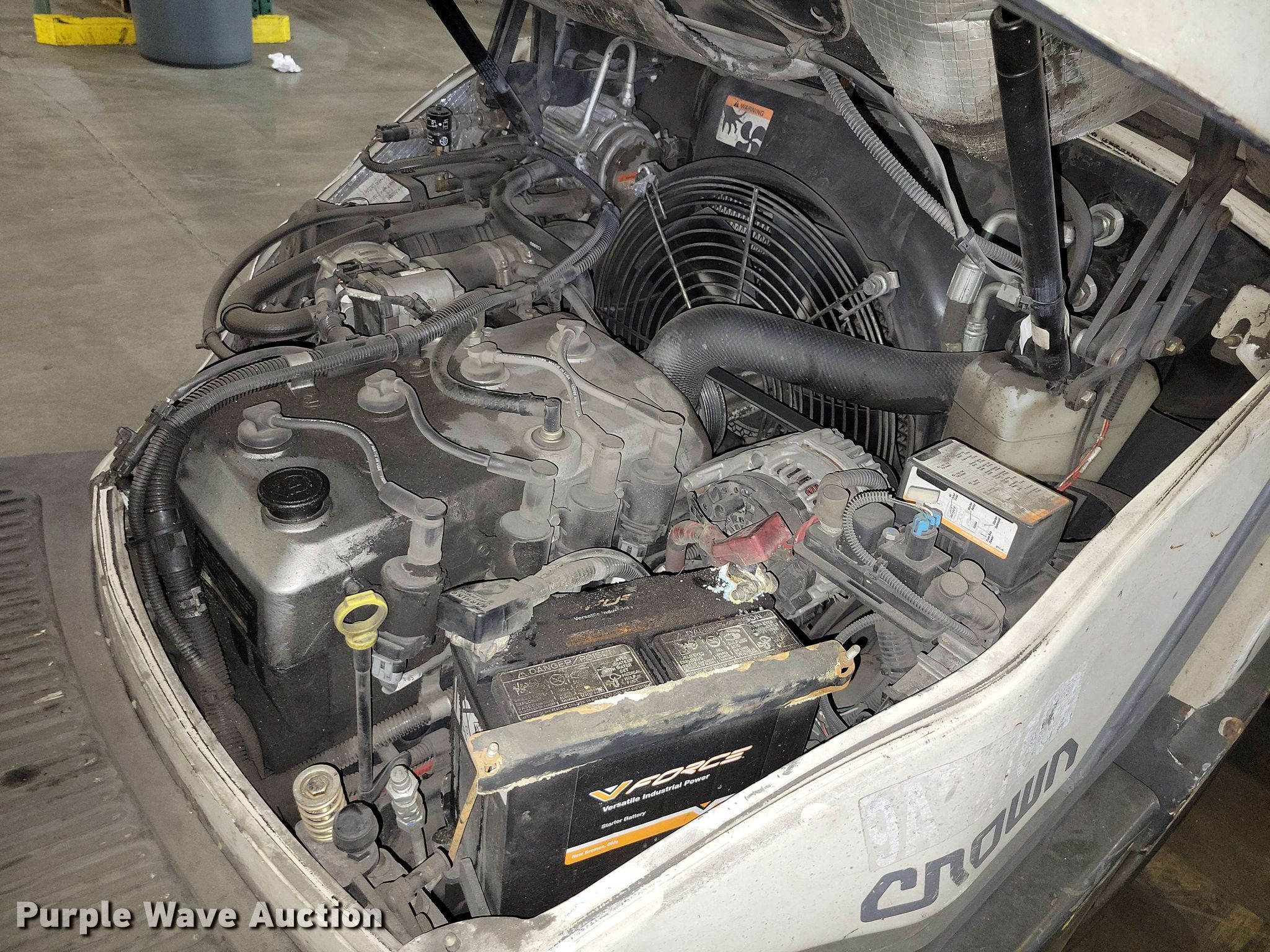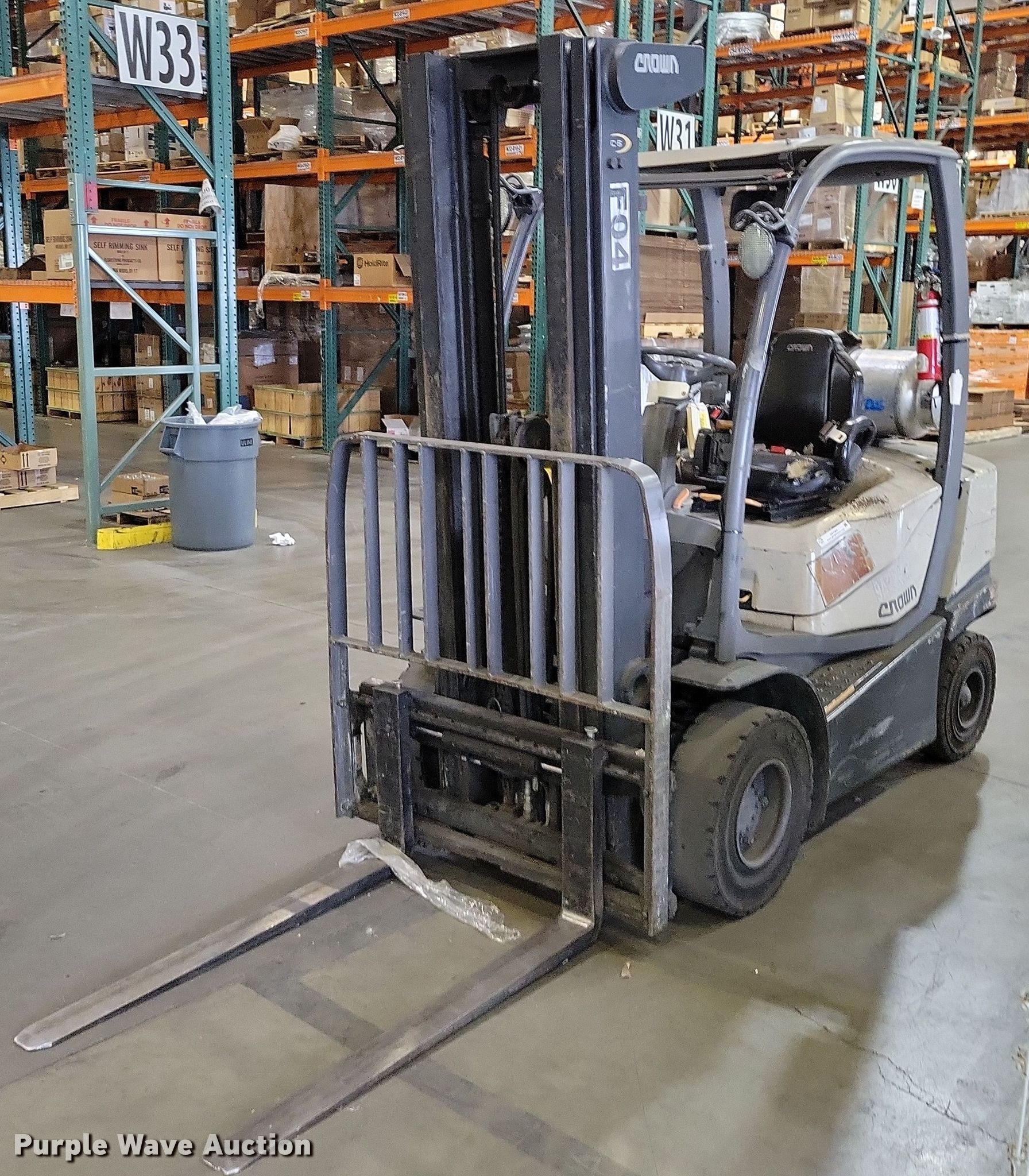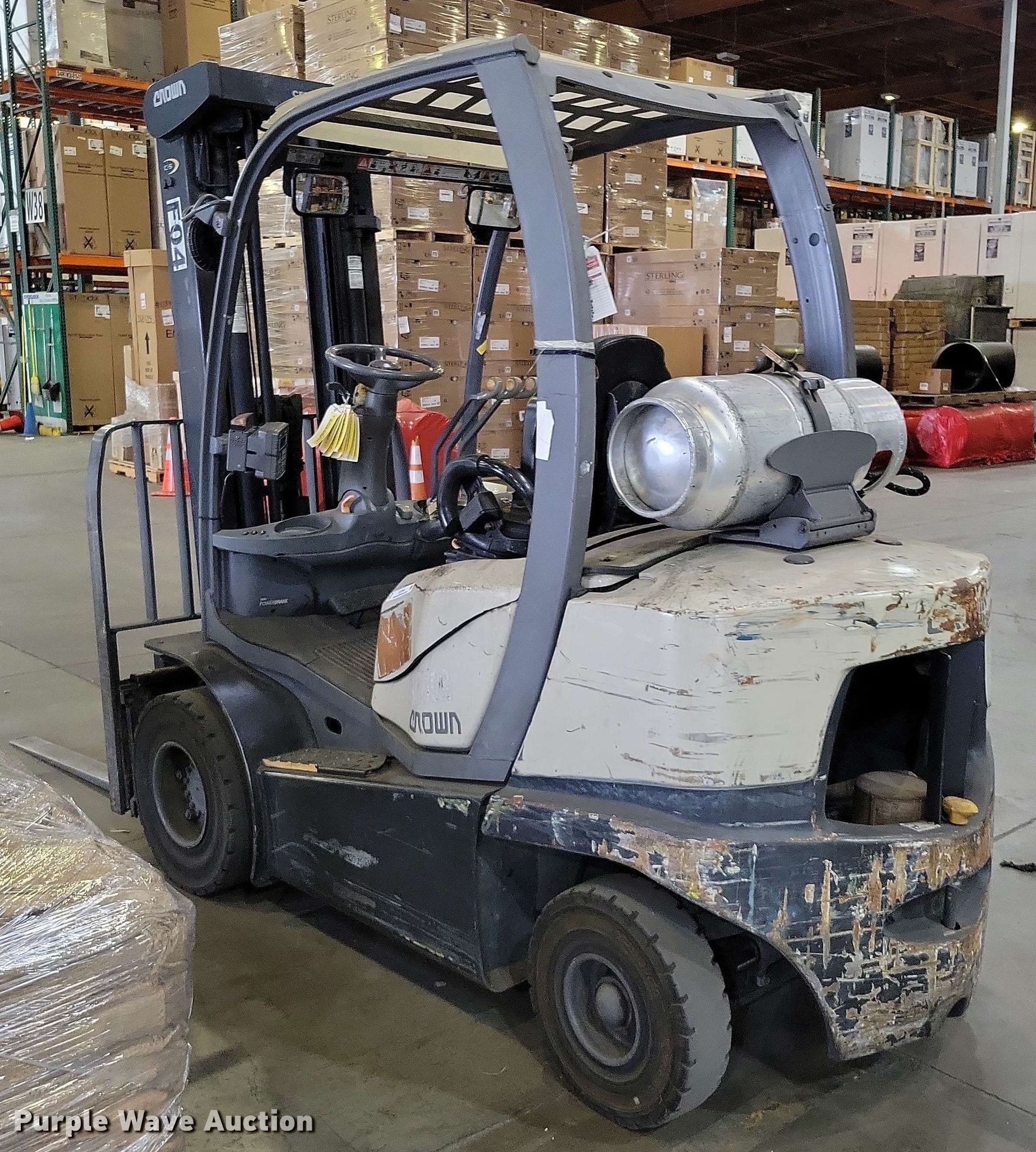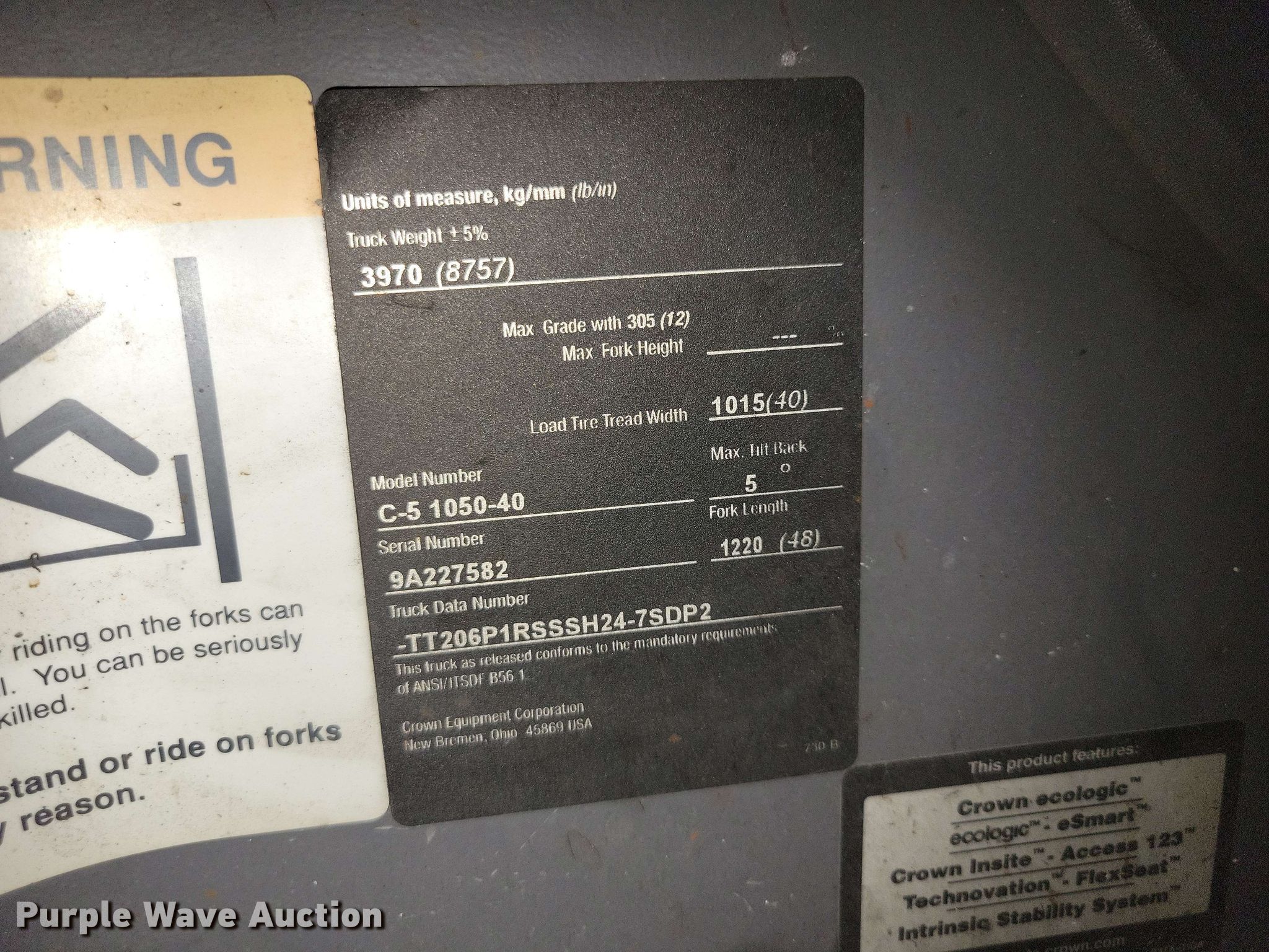 2016 Crown C51050-40 forklift. Hours: Unknown, Serial: 9A227582, Unit #: SFS2184. Engine Cylinders: 4, Fuel type: LPG LP bottle: Not included. Transmission Powershift. Operators station OROPS. Features Maximum lift capacity: 3,400 lbs, Maximum lift height: 206", Collapsed mast height: 90", Mast stages: 3, Side shift, Mast tilt, Fork length: 48". Tires Front: 7-12, Rear: 6-9, Solid. Notes Dead battery. Ferguson. San Leandro, CA 94577