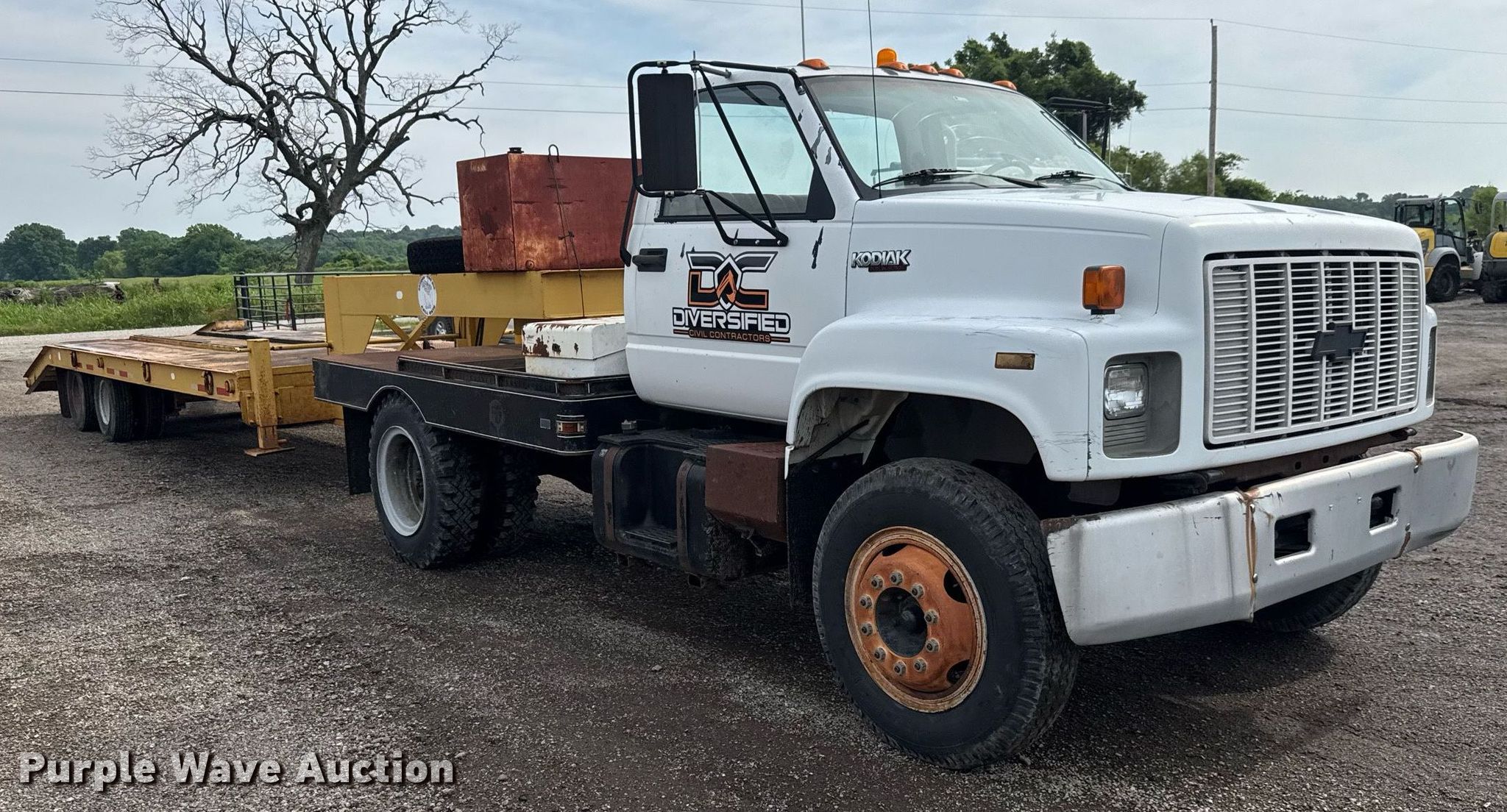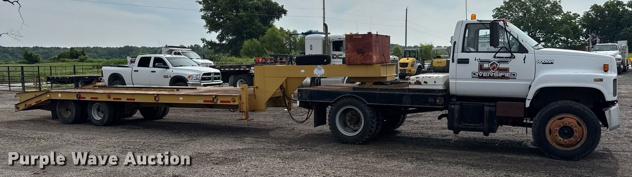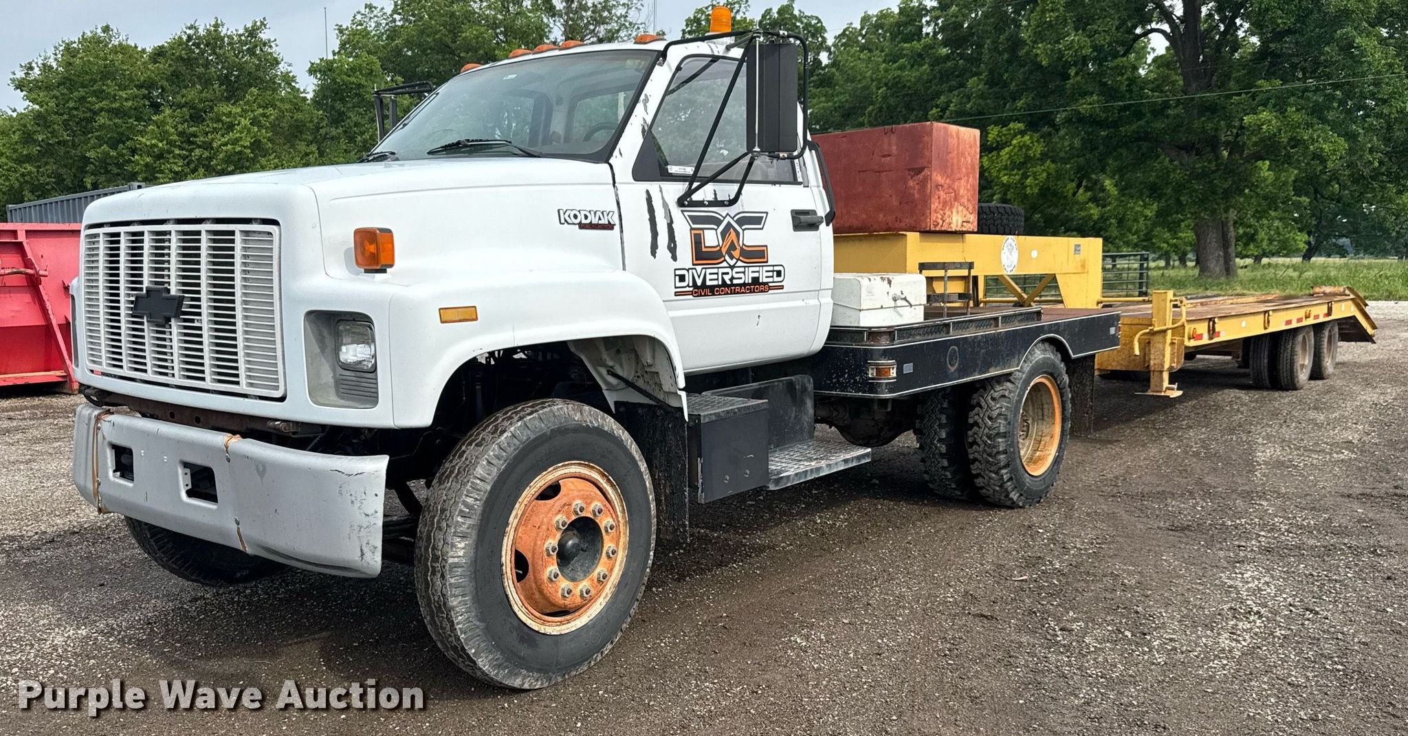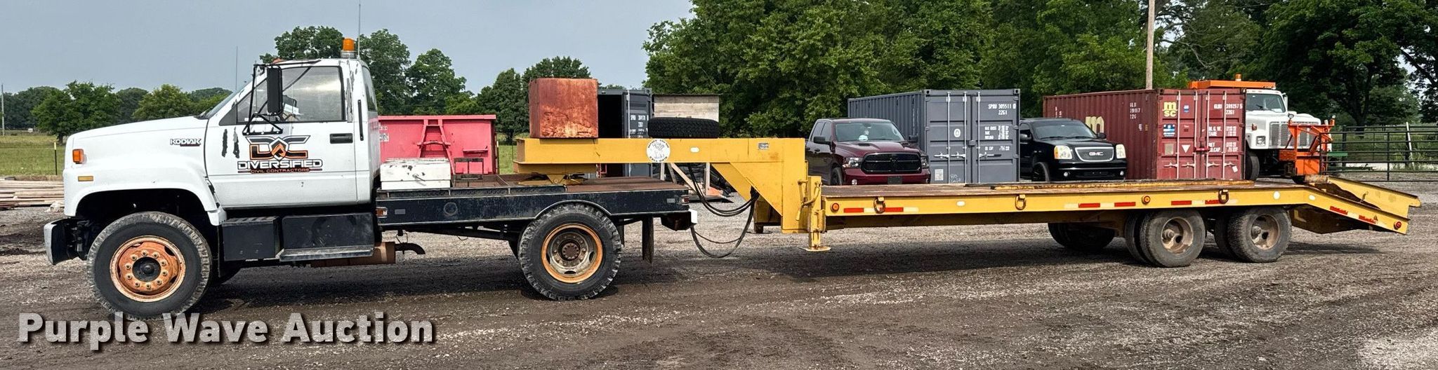 1991 Chevrolet Kodiak flatbed truck. Miles: 45,931 on odometer, VIN: 1GBG6H1P6MJ107579. Engine GM, Displacement: 6.0L, Cylinders: 8, Fuel type: Gas. Transmission Manual, Speed: 5, plus 2. Chassis Axles: Single, Suspension: Spring, Brakes: Hydraulic. Interior Heat. Features Flatbed 9' 7" L x 95" W, Hitch: Fifth wheel. Tires Size: 8.25-20. 1982 Belshe T-8 GN equipment trailer VIN: 11584K. Dimensions Overall: 36' 6" L x 95" W, Deck: 20' L x 95" W, Tail length: 64", Ramps: Manual Length: 54". Features Deck type: Steel. Chassis Landing gear: Dual, Suspension: Spring, Brakes: Air, Axles: Tandem. Tires Steel wheels, Size: 235/85R16. Truck - Oklahoma classic title. Trailer- Oklahoma title. Distribution of titles may be delayed up to 14 days from verification of funds.. Diversified Civil Contractors, LLC. Broken Arrow, OK 74014
