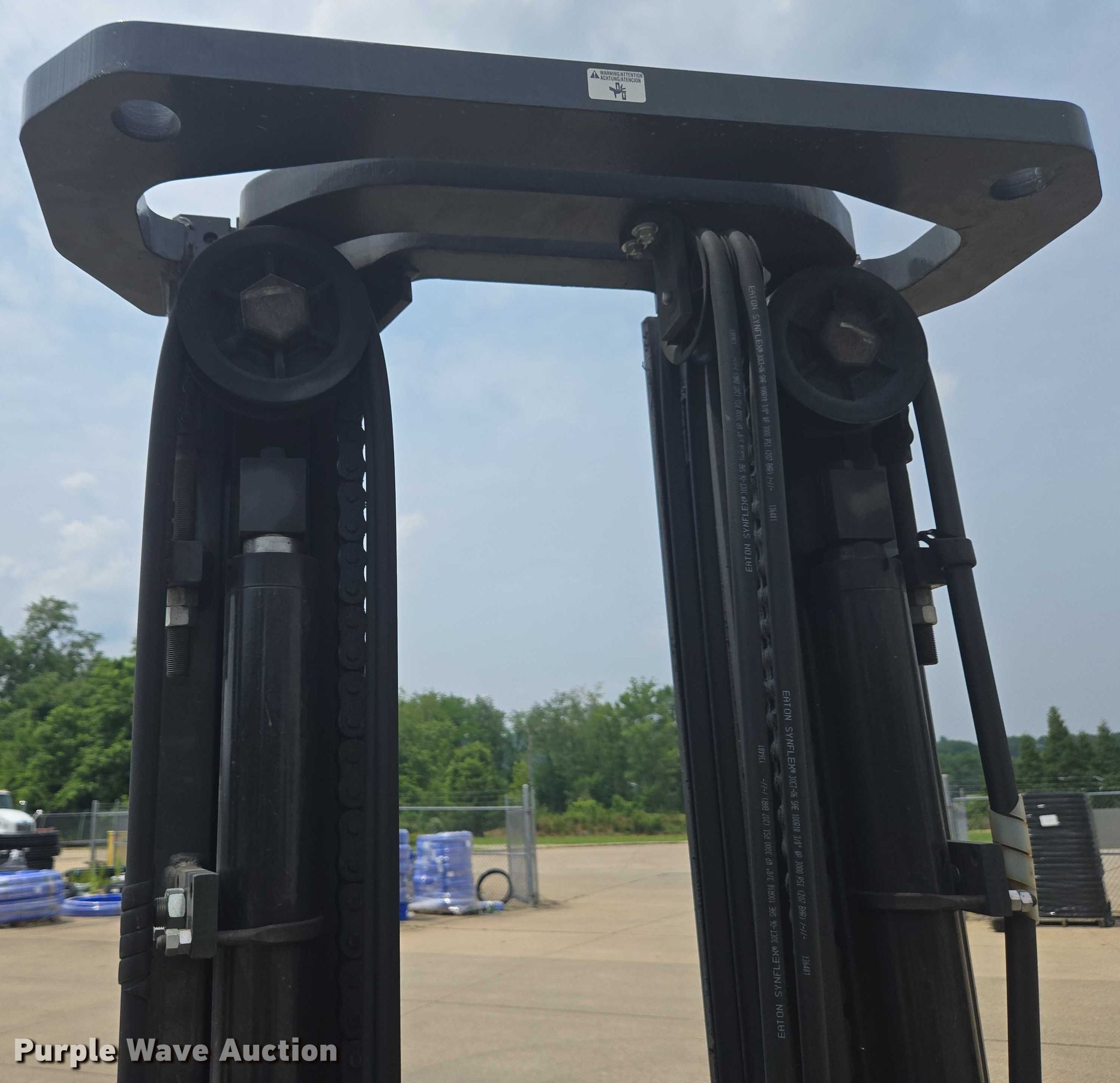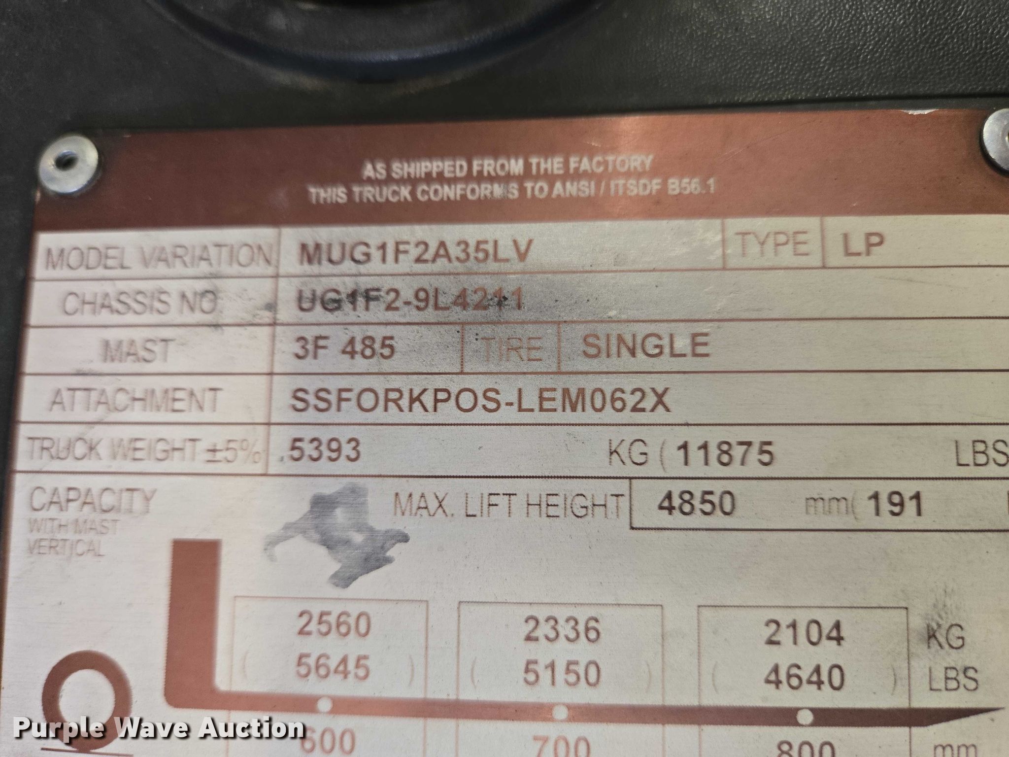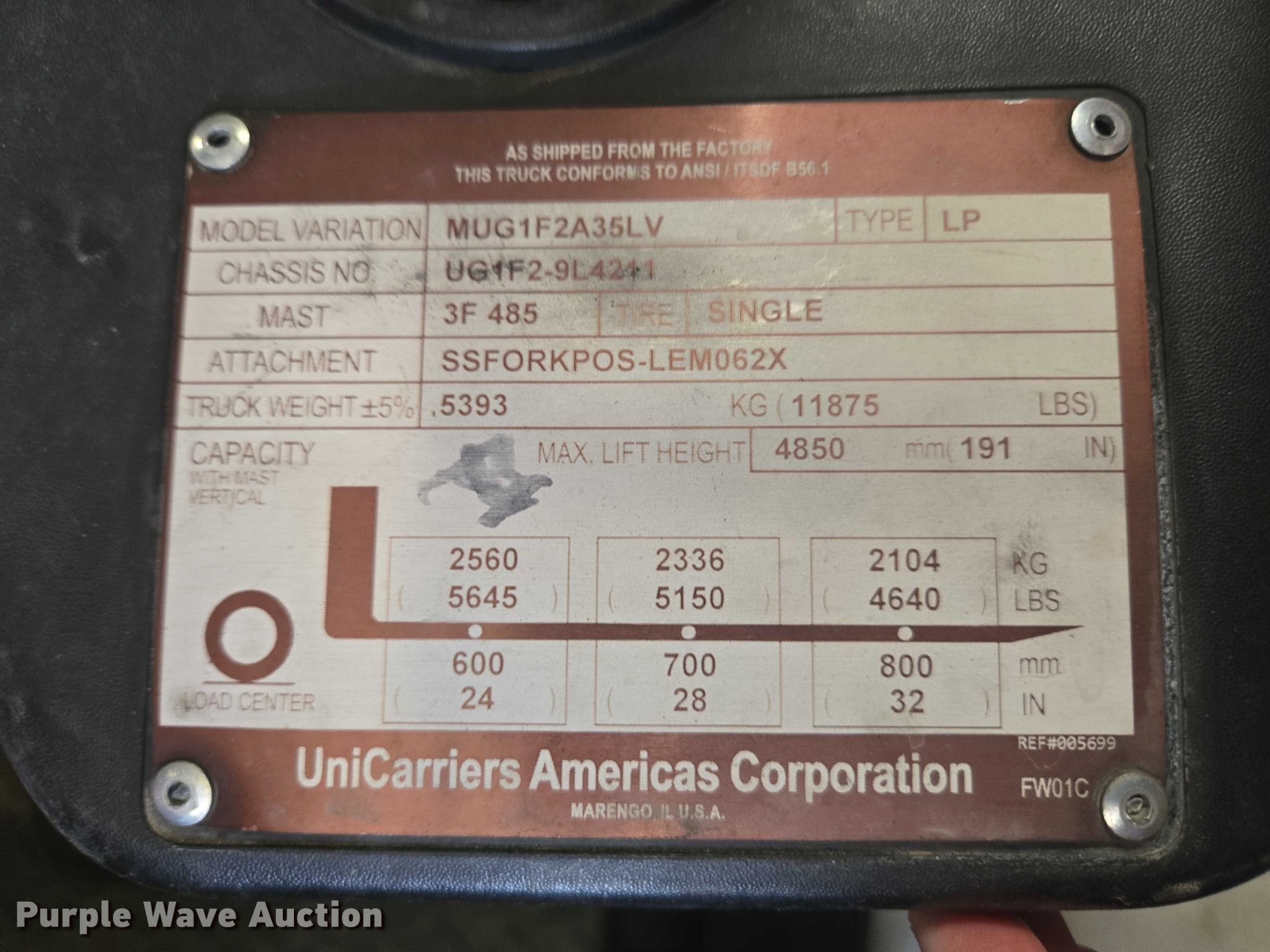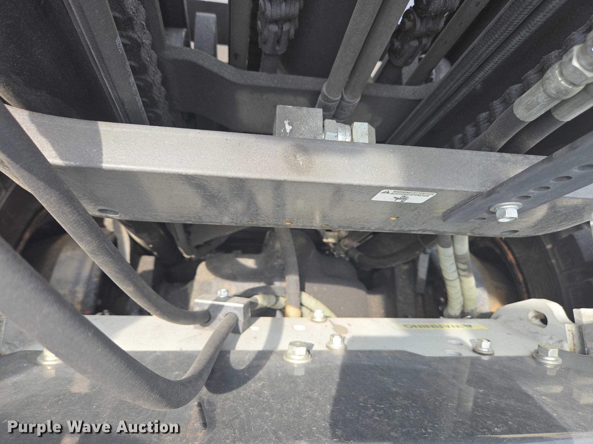 2014 Nissan PF70 forklift. Hours: 3,403 on meter, Serial: UG1F2-9L4211, Unit #: SFS2204. Engine Cylinders: 4, Fuel type: LPG LP bottle: Not included. Transmission Automatic. Operators station OROPS, Canopy. Features Maximum lift capacity: 5,645 lbs, Maximum lift height: 191", Collapsed mast height: 92", Mast stages: 3, Side shift, Mast tilt, Fork positioner, Fork length: 45". Tires Front: 250-15, Rear: 6.50-10, Solid. Ferguson. Marietta, OH 45750