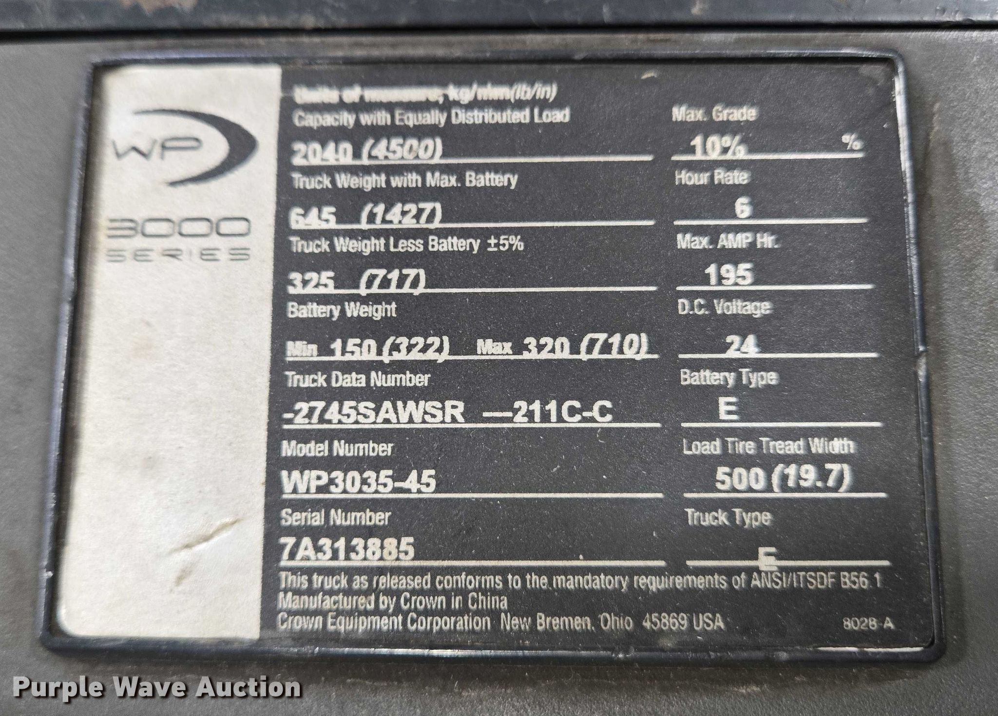 2017 Crown WP3035-45 pallet jack has sold in Rochester, New York for $13.75. Item EC4295 sold on July 16th, 2025.