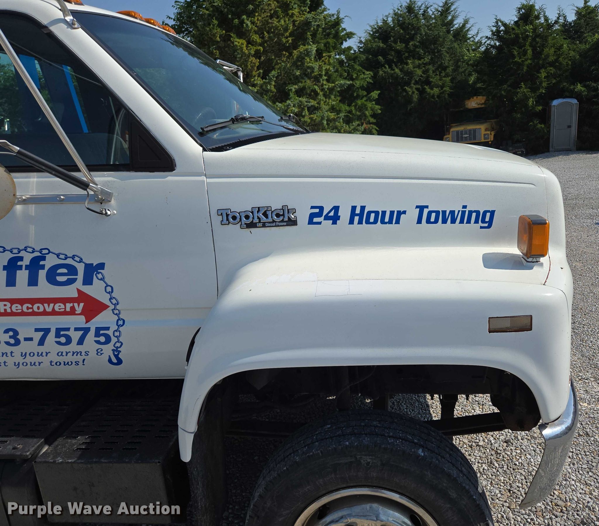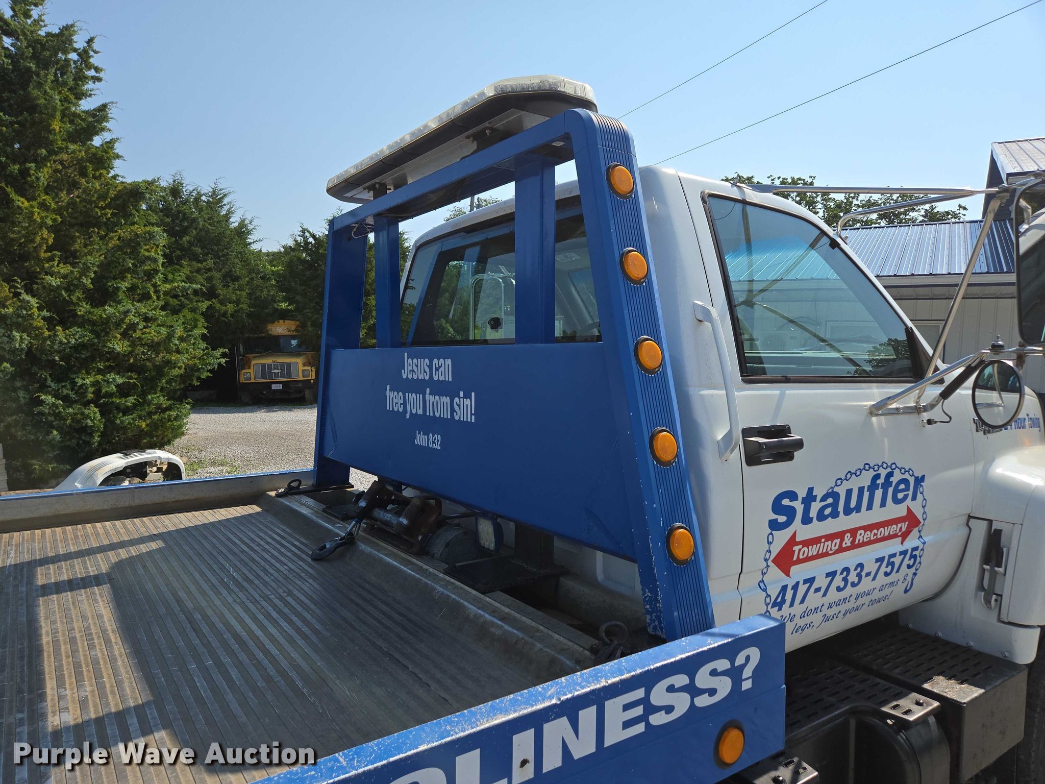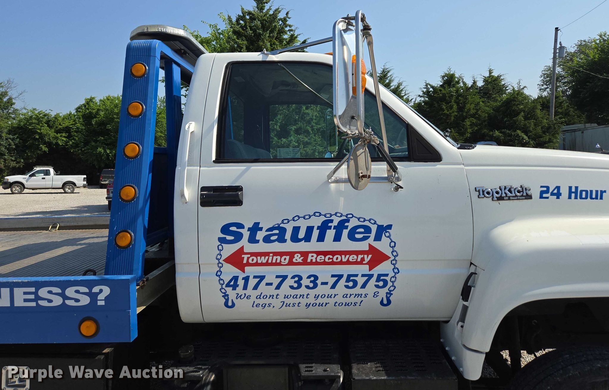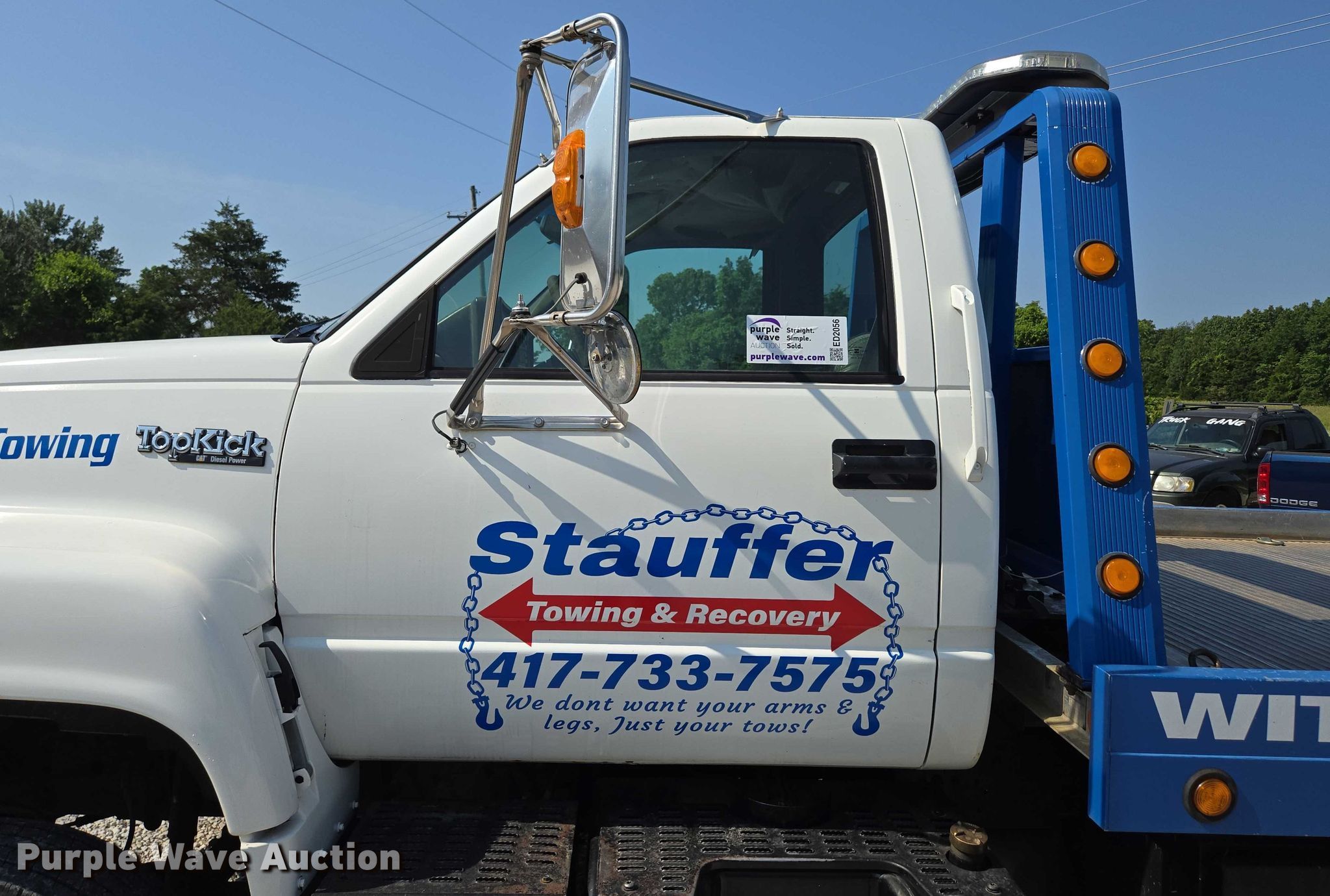 1995 GMC TopKick rollback truck. Miles: 288,137 on odometer, VIN: 1GDJ6H1J7SJ509648, Unit #: Bubba. Engine Caterpillar 3116, Serial: 9GK18395, Displacement: 6.6L, Cylinders: 6, Fuel type: Diesel, HP: 200. Transmission Manual, Speed: 6. Chassis Axles: Single, Suspension: Spring, Brakes: Hydraulic, PTO, GVWR: 23,540 lbs. Interior AC, Heat, Power windows, Power locks, Auxiliary controls. Features Rollback bed Chevron, Serial: 14155449, 19' 2" L x 97" W, Ram: Dual, Underlift, Synthetic winch rope 100' x 3/8". Tires Size: 245/70R19.5. Notes Decals will be removed prior to auction, Suspension issues Left rear leaf spring broken, Possible AC issues, may need charged. Missouri title. Seller is a Missouri licensed motor vehicle dealer. Title will be assigned and distributed by the dealer. Please contact the seller for distribution questions. Title distribution may be delayed up to 14 days from verification of funds. Stauffer Auto. Urbana, MO 65767