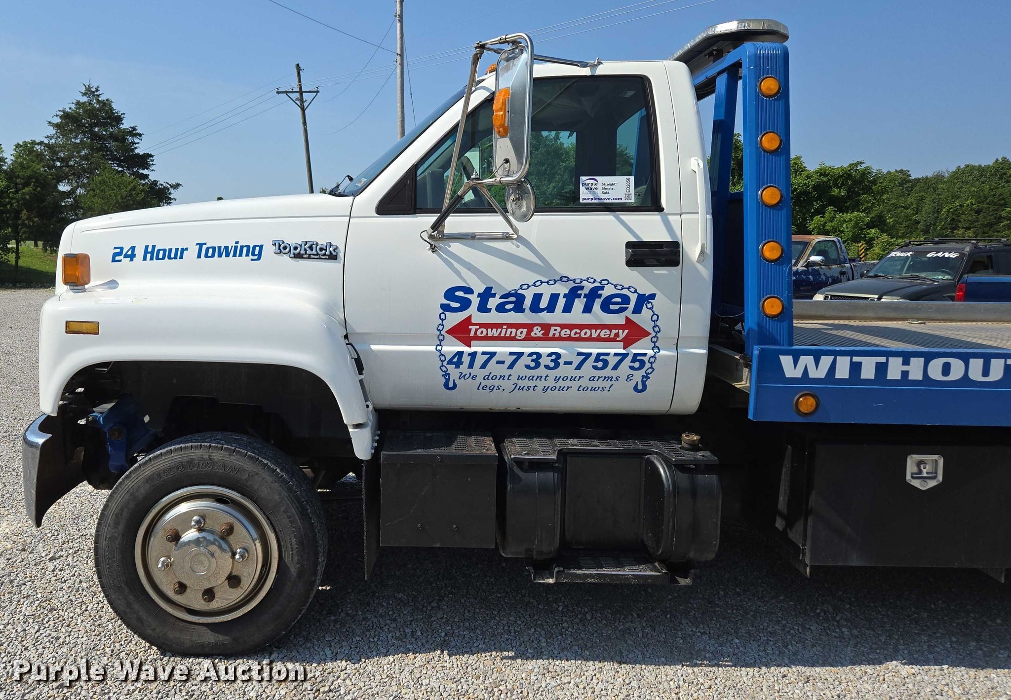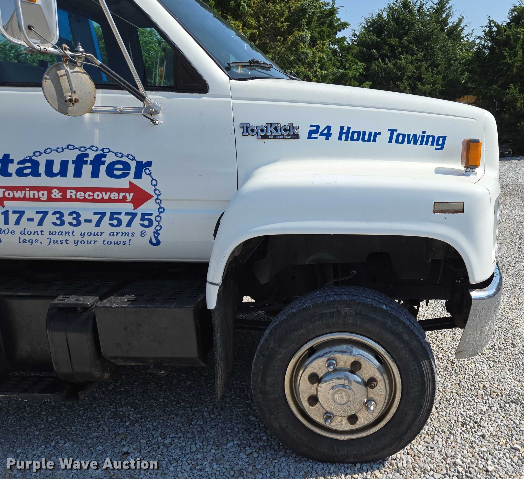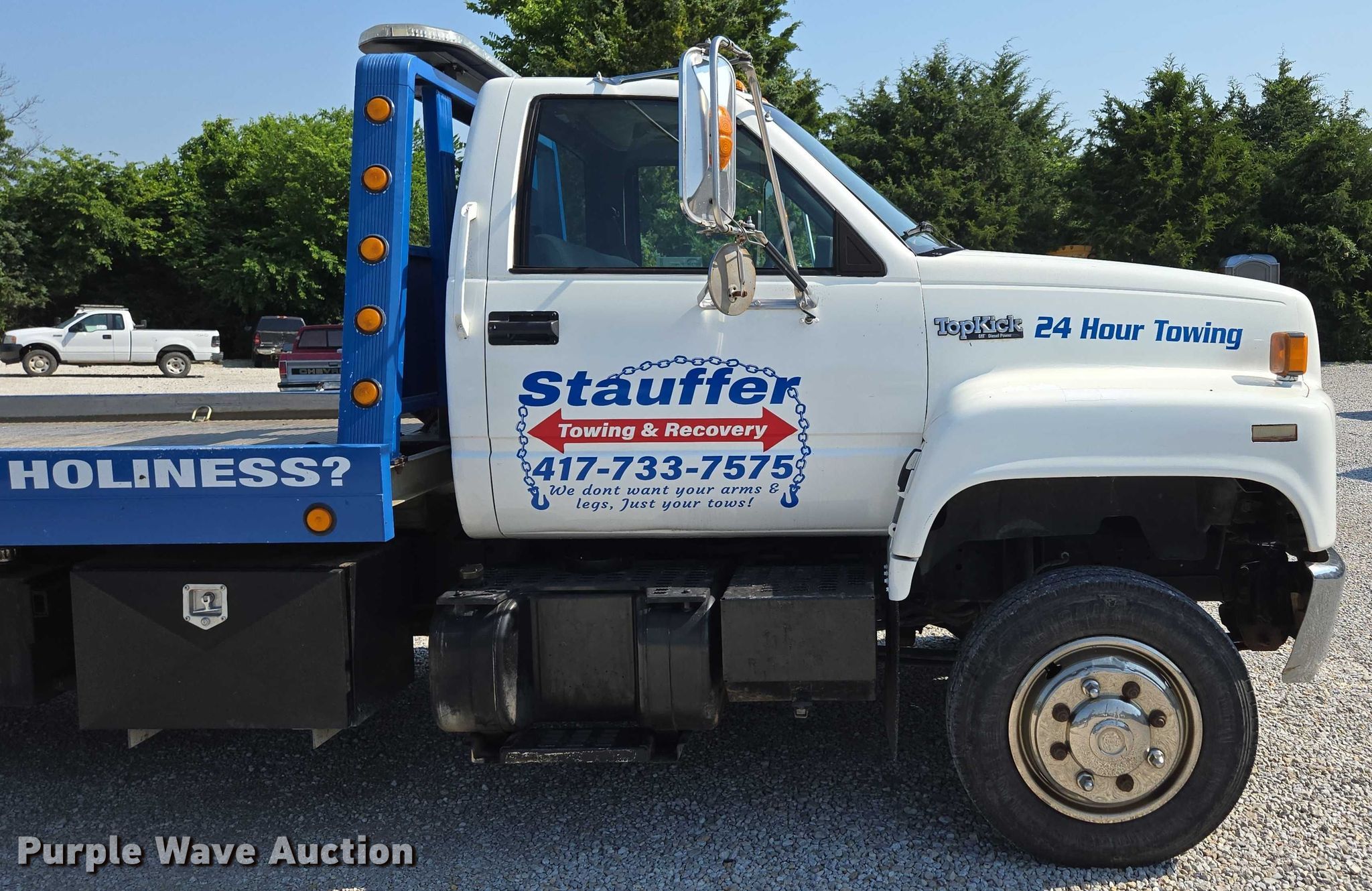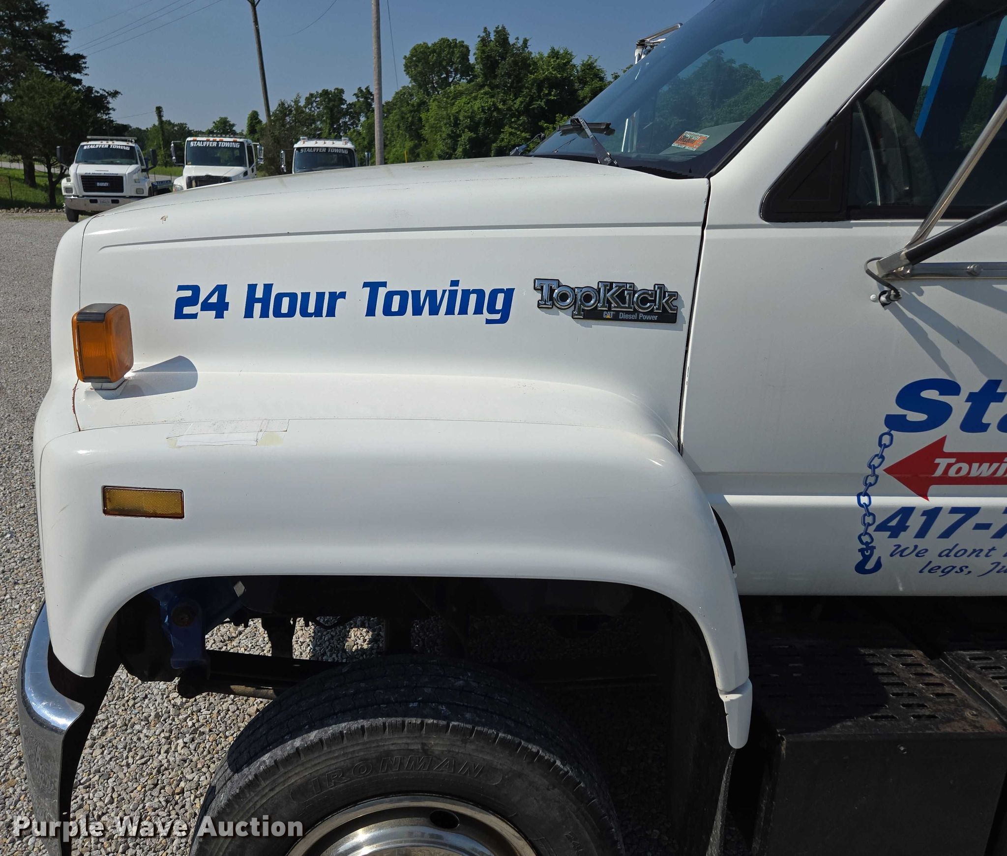 1995 GMC TopKick rollback truck. Miles: 288,137 on odometer, VIN: 1GDJ6H1J7SJ509648, Unit #: Bubba. Engine Caterpillar 3116, Serial: 9GK18395, Displacement: 6.6L, Cylinders: 6, Fuel type: Diesel, HP: 200. Transmission Manual, Speed: 6. Chassis Axles: Single, Suspension: Spring, Brakes: Hydraulic, PTO, GVWR: 23,540 lbs. Interior AC, Heat, Power windows, Power locks, Auxiliary controls. Features Rollback bed Chevron, Serial: 14155449, 19' 2" L x 97" W, Ram: Dual, Underlift, Synthetic winch rope 100' x 3/8". Tires Size: 245/70R19.5. Notes Decals will be removed prior to auction, Suspension issues Left rear leaf spring broken, Possible AC issues, may need charged. Missouri title. Seller is a Missouri licensed motor vehicle dealer. Title will be assigned and distributed by the dealer. Please contact the seller for distribution questions. Title distribution may be delayed up to 14 days from verification of funds. Stauffer Auto. Urbana, MO 65767