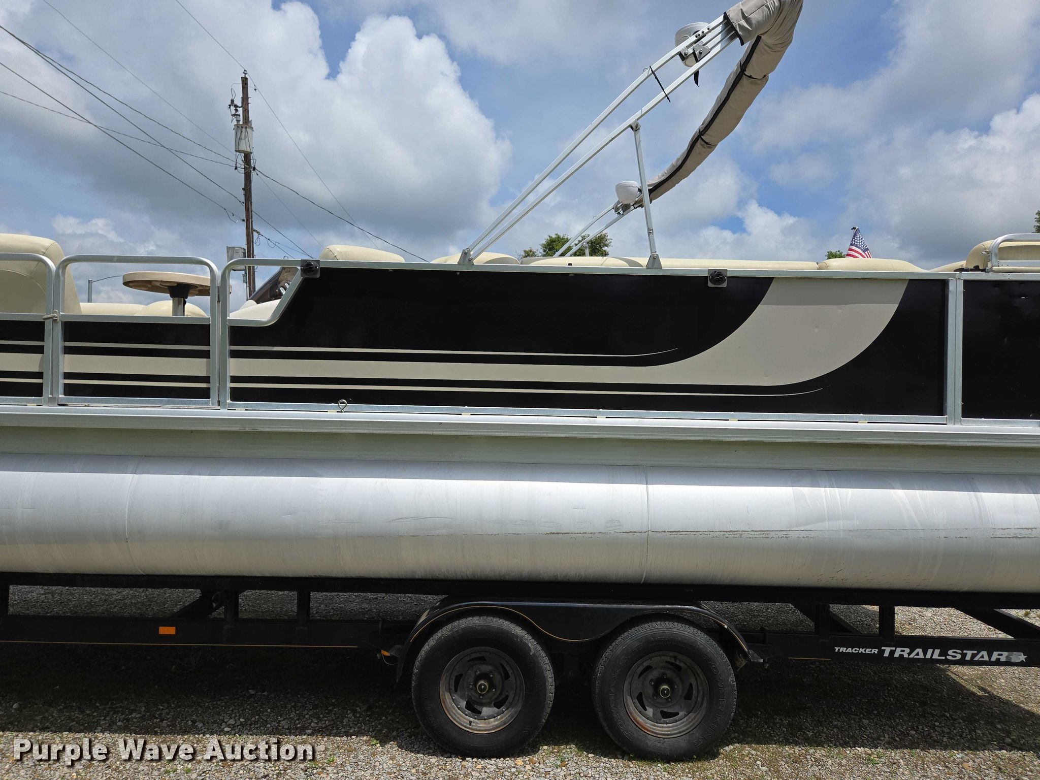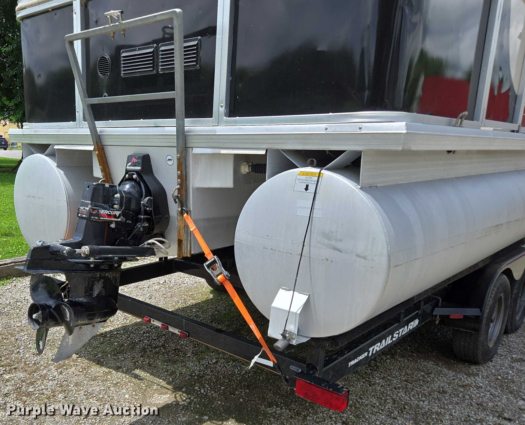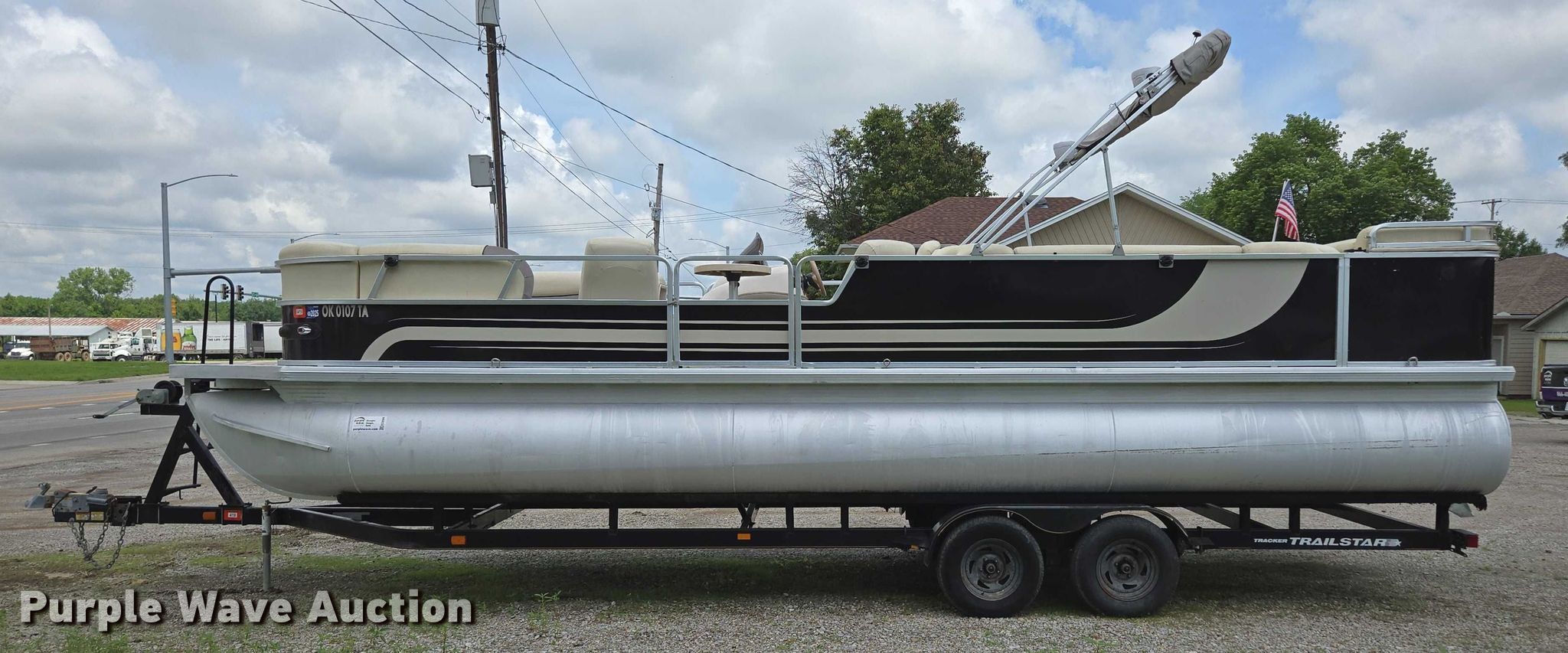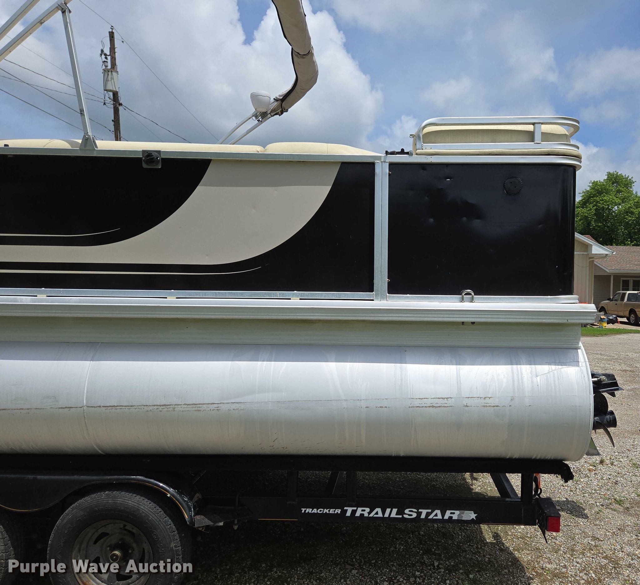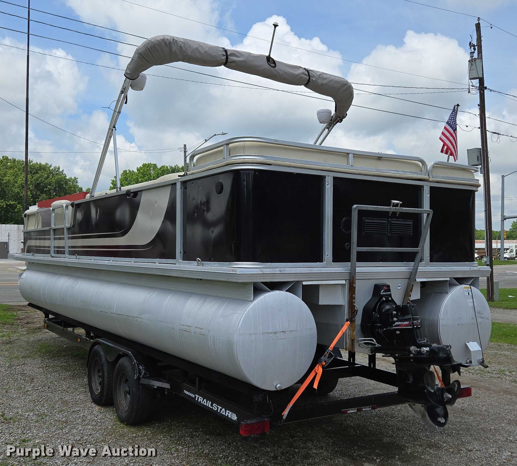 2003 Tracker Party Barge 27 I/O boat. Length: 27' 6", Hull ID: BUJ27684L203. Engine Engine type: Inboard, Mercury MCM 3.0 Litre, Displacement: 181 C.I.D., Cylinders: 4, Fuel type: Gas, Outdrive Make: Mercury, Model: MerCruiser Alpha One, Serial: 0M565042, Propeller: Aluminum. Operators station Capacity Person: 16, 2,260 lbs, Depth finder: Eagle Fish Easy. Features Wakeboard/ ski tower, Bimini top. Trailer Tracker Marine L.P. Trailstar, VIN: 4TM13CR242B001093, Overall length: 32' 3", Overall width: 91.5", GVWR: 6,500 lbs, Axles: Tandem, Brakes: Hydraulic, Tire size: ST205/75R14. Notes Weld repair on right pontoon, Contents not included, Bimini top removed but included, Interior compartment latch issues, Brakes disconnected. Boat: Oklahoma title. Trailer: Bill of Sale. Title distribution may be delayed up to 14 days from verification of funds. Hipfl Construction Inc.. Frontenac, KS 66763