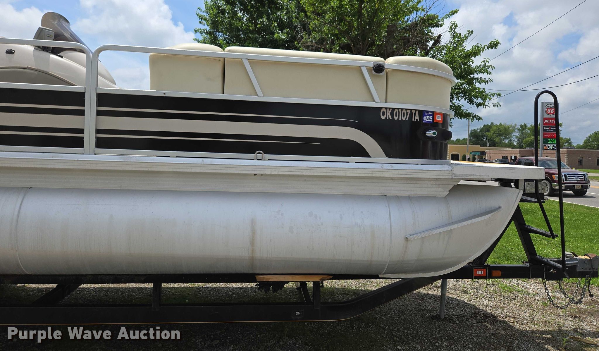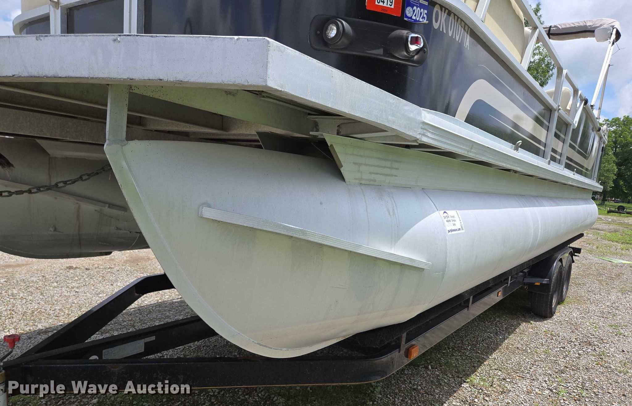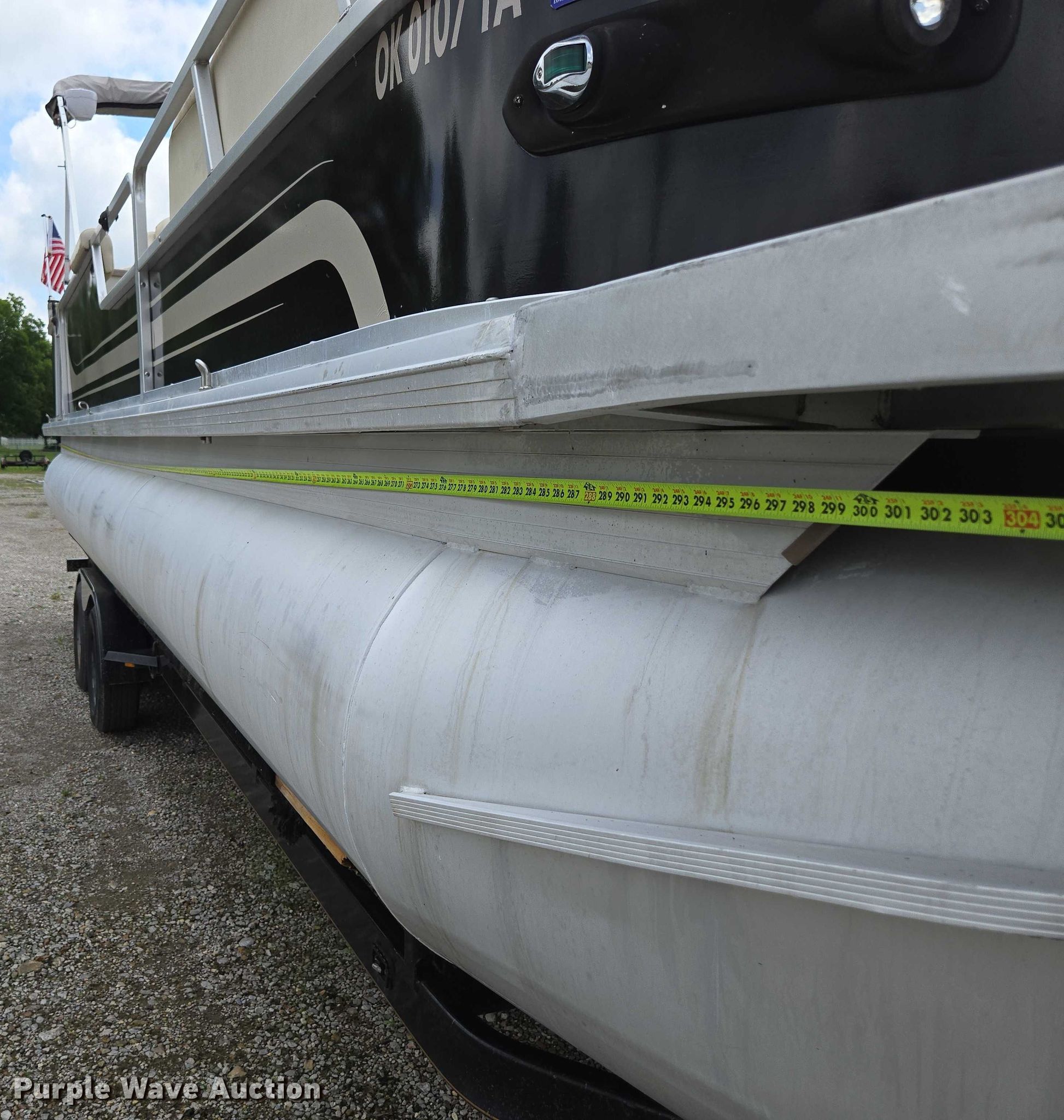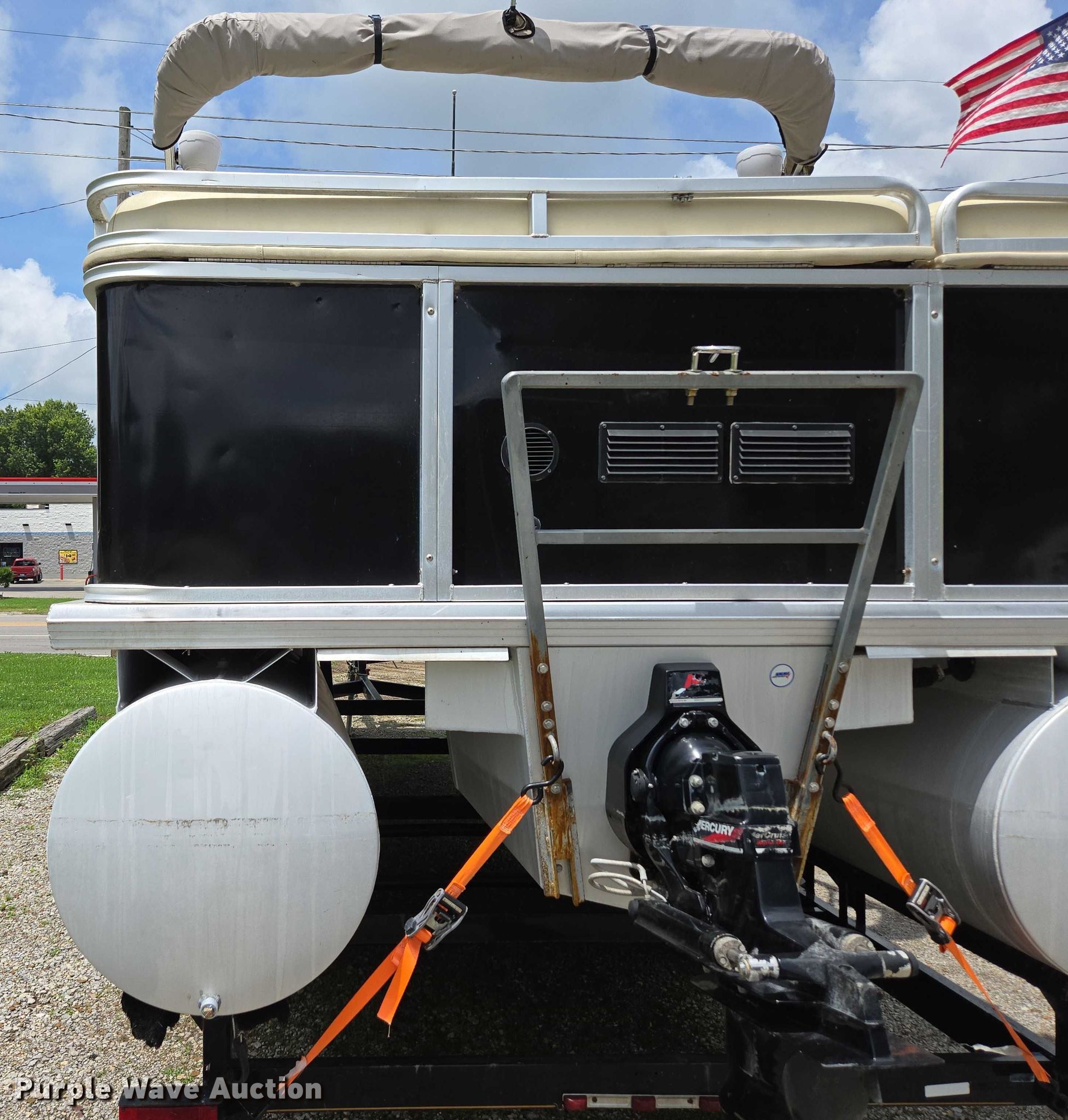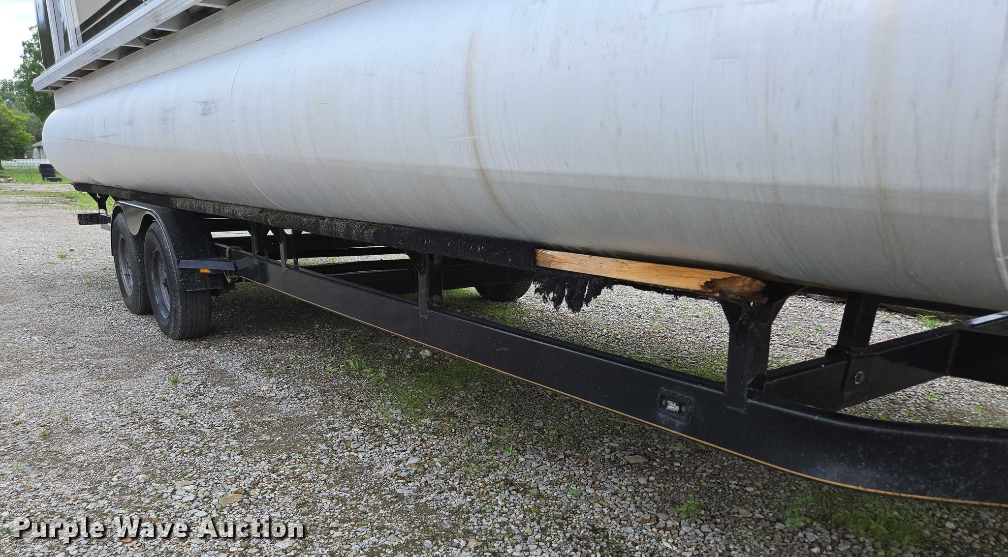 2003 Tracker Party Barge 27 I/O boat. Length: 27' 6", Hull ID: BUJ27684L203. Engine Engine type: Inboard, Mercury MCM 3.0 Litre, Displacement: 181 C.I.D., Cylinders: 4, Fuel type: Gas, Outdrive Make: Mercury, Model: MerCruiser Alpha One, Serial: 0M565042, Propeller: Aluminum. Operators station Capacity Person: 16, 2,260 lbs, Depth finder: Eagle Fish Easy. Features Wakeboard/ ski tower, Bimini top. Trailer Tracker Marine L.P. Trailstar, VIN: 4TM13CR242B001093, Overall length: 32' 3", Overall width: 91.5", GVWR: 6,500 lbs, Axles: Tandem, Brakes: Hydraulic, Tire size: ST205/75R14. Notes Weld repair on right pontoon, Contents not included, Bimini top removed but included, Interior compartment latch issues, Brakes disconnected. Boat: Oklahoma title. Trailer: Bill of Sale. Title distribution may be delayed up to 14 days from verification of funds. Hipfl Construction Inc.. Frontenac, KS 66763