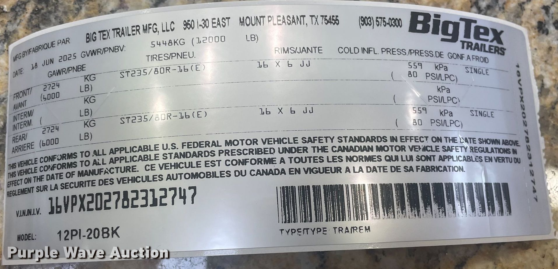 2008 Big Tex 12PI utility trailer. VIN: 16VPX202782312747, Unit #: 5B. Dimensions Overall: 24' L x 101" W, Deck: 20' L x 84" W, Side height: 16", Deck height: 20", Ramps: Manual Length: 60". Features Deck type: Wood. Chassis Ball hitch: 2 5/16", Landing gear: Single, Suspension: Spring, Brakes: Electric, Axles: Tandem. Tires Steel wheels, Size: 235/85R16. Louisiana title. Title distribution may be delayed up to 30 days from verification of funds. Carrizo Springs, TX 78834