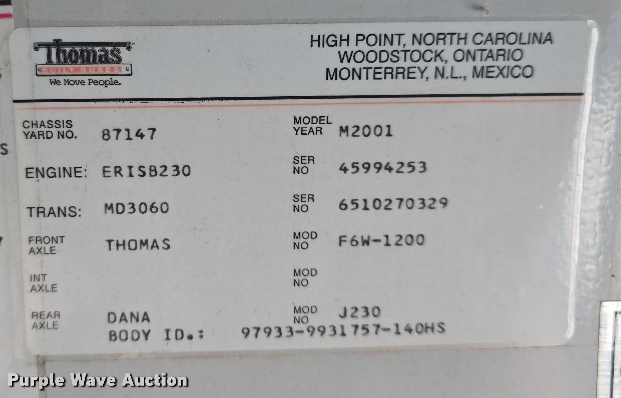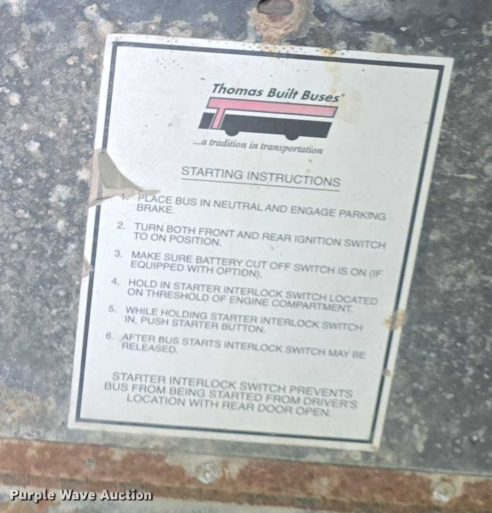 Take a look at this used 2001 Thomas Built 140H school bus being sold on July 16th, 2025 in the SOLD! July 16 Vehicles and Equipment Auction made by Thomas Built. Take a look at all of the item information below or take a look at similar auctions for Transit Vehicles.