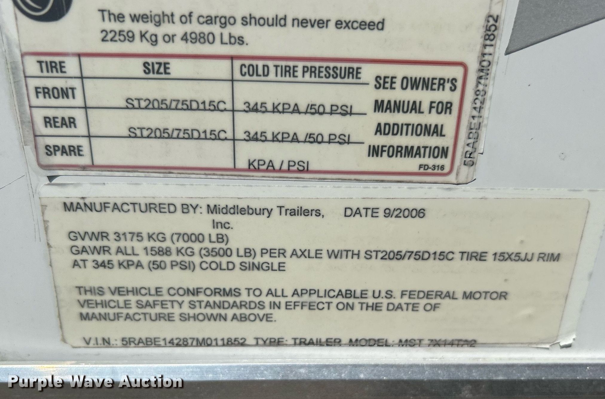 Purple Wave is selling a used Enclosed Cargo Trailer in Oklahoma. This item is a 2007 Middlebury Trailers MST7X14TA2 enclosed cargo trailer with the following: VIN: 5RABE14287M011852
