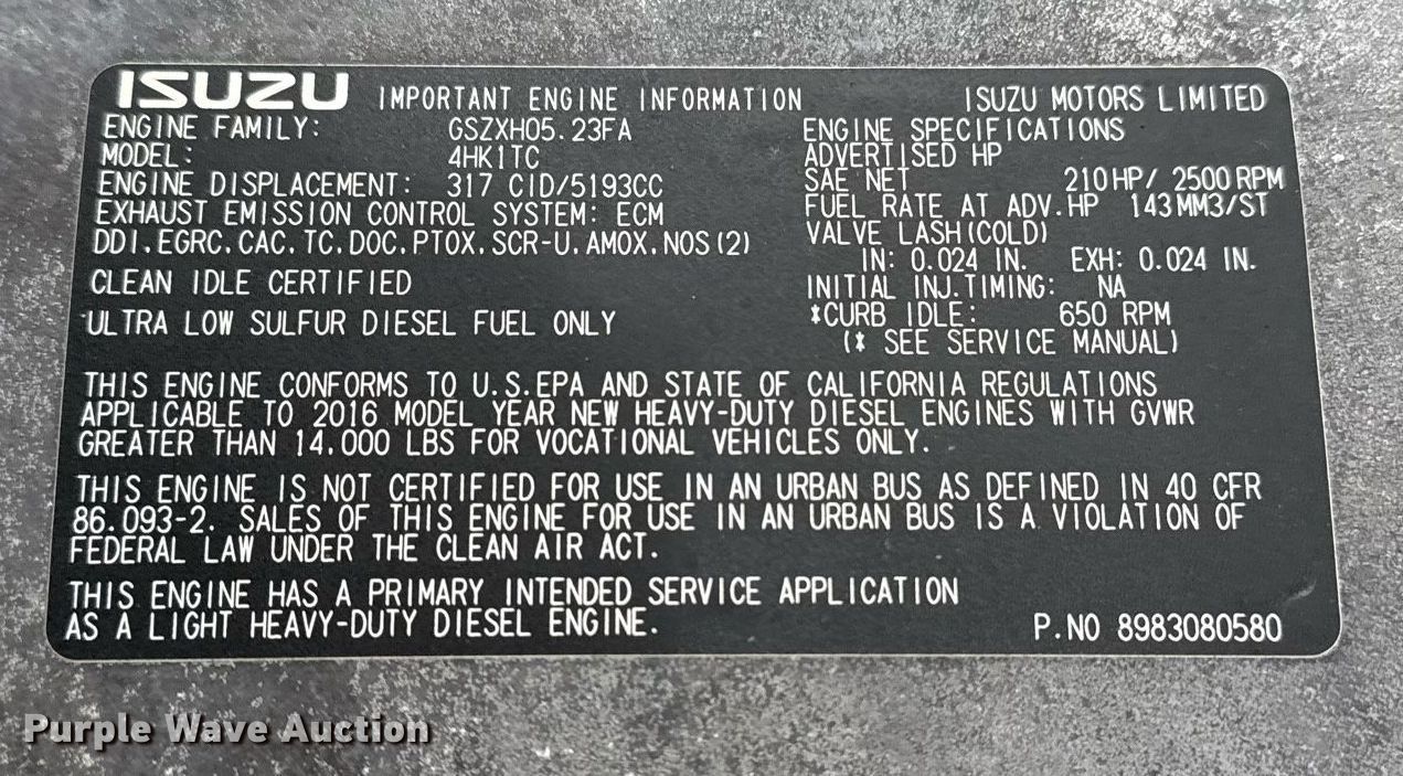 2017 Isuzu NRR box truck. Miles: 89,176 on odometer, VIN: JALE5W168H7300867. Engine Isuzu 4HK1TC, Displacement: 317 C.I.D., Cylinders: 4, Fuel type: Diesel. Transmission Automatic. Chassis Axles: Single, Suspension: Spring, Brakes: Hydraulic, GVWR: 19,500 lbs. Interior AC, Heat, Heated mirrors, Power windows, Power locks, Cruise control. Features Box bed Mickey Truck Bodies AO-O, Serial: 8749/16, 16' L x 96" W x 94" H, Floor: Aluminum. Tires Size: 225/70R19.5. Oklahoma title. Seller is an Oklahoma licensed motor vehicle dealer. Title will be assigned and distributed by the dealer. Please contact the seller for distribution questions. Title distribution may be delayed up to 30 days from verification of funds. Collinsville, OK 74021