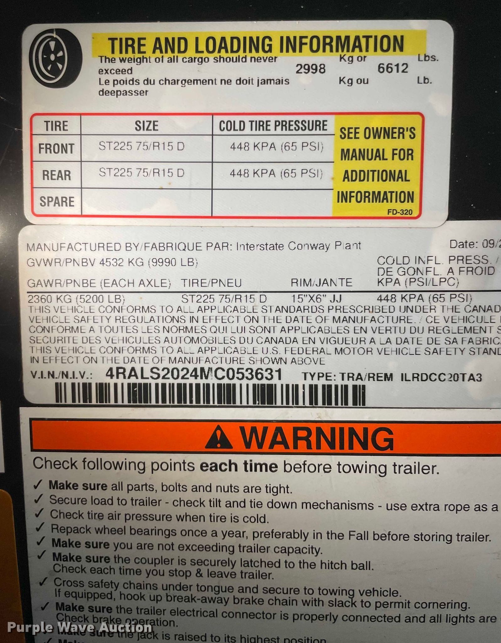 2021 Interstate Load Runner enclosed cargo trailer. VIN: 4RALS2024MC053631. Dimensions Overall: 25' L x 102" W, Body: 20' L x 96" W, Rear door / ramp 84" L x 92" W. Features E-track rail system. Chassis Ball hitch: 2 5/16", Landing gear: Single, Suspension: Spring, Brakes: Electric, Axles: Tandem, GVWR: 9,990 lbs, GAWR: 52,000 lbs. Tires Steel wheels, Size: 225/75R15. Missouri title. Title distribution may be delayed up to 14 days from verification of funds. Peculiar, MO 64078