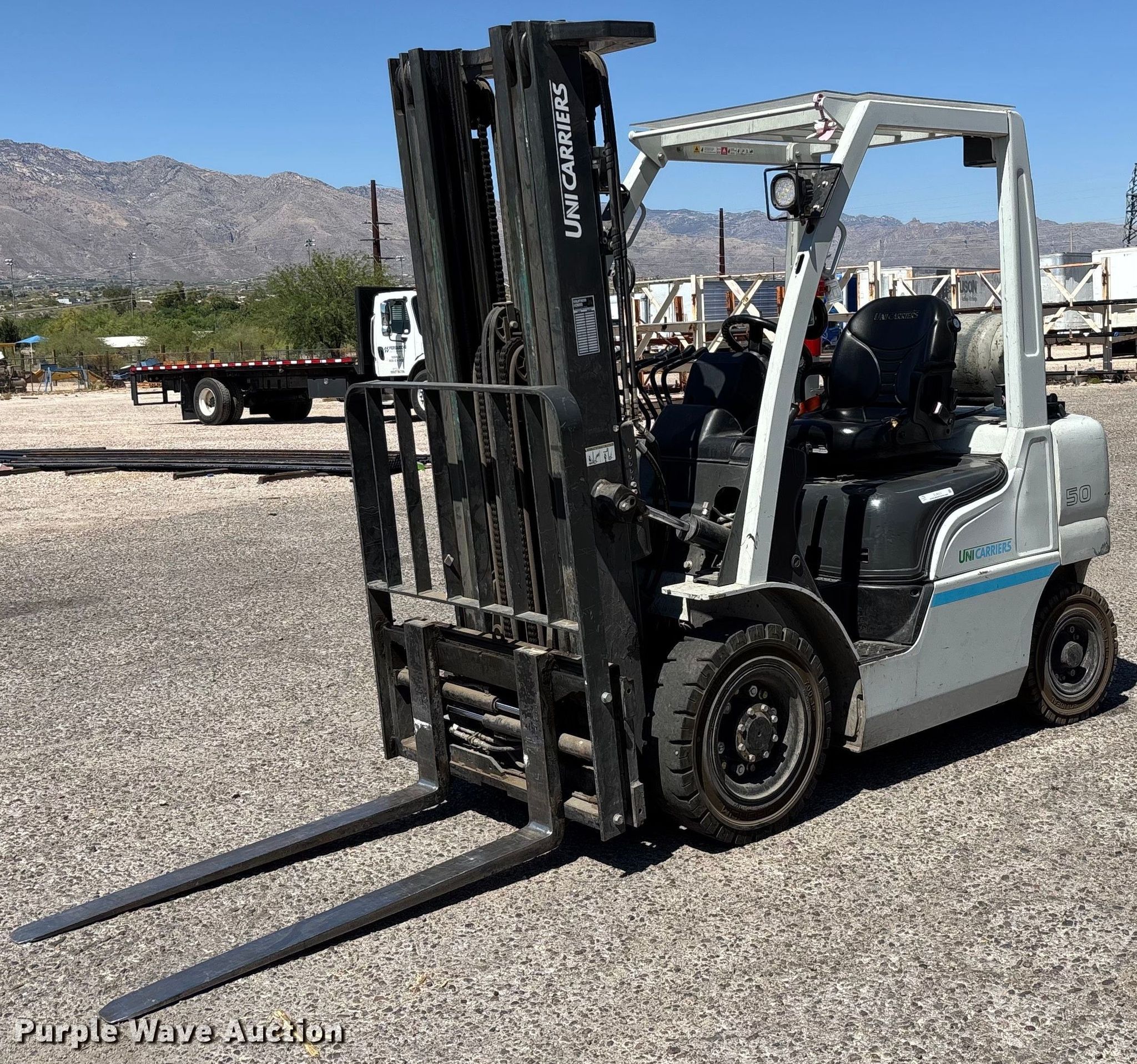 2016 UniCarriers PF50 forklift. Hours: 1,441 on meter, Serial: P1F2-9H21673, Unit #: SFS2226. Engine GCT, Displacement: 2.1L, Cylinders: 4, Fuel type: LPG LP bottle: Not included. Transmission Automatic. Operators station OROPS, Canopy. Features Maximum lift capacity: 5,000 lbs, Maximum lift height: 203", Mast stages: 3, Side shift, Mast tilt, Fork positioner, Fork length: 48". Tires Front: 7.00-12, Rear: 6.00-9, Solid. Ferguson. Tucson, AZ 85716