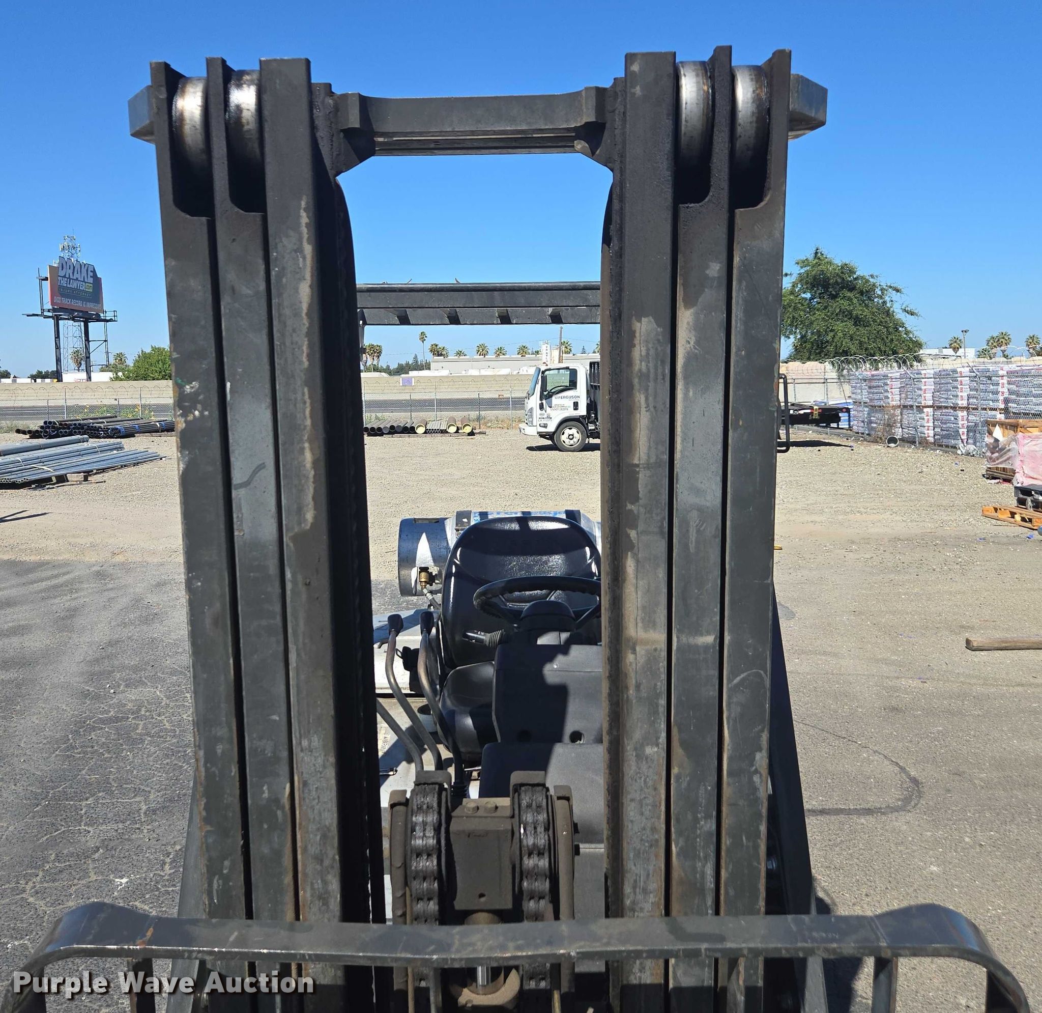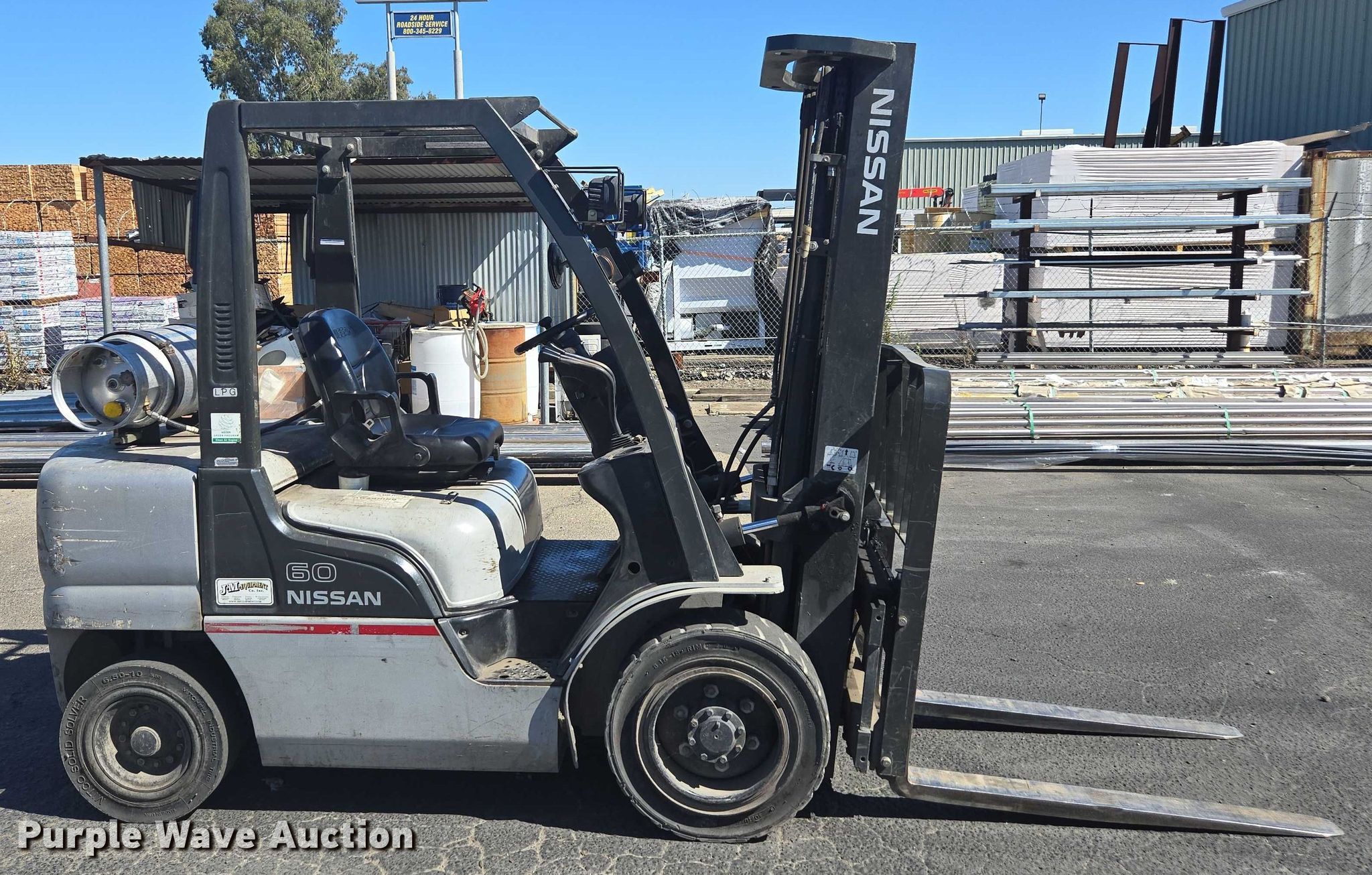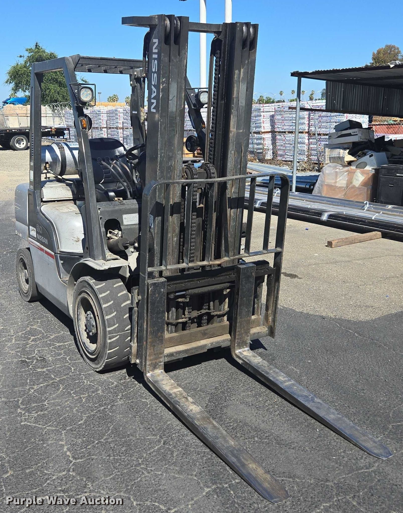 Nissan PF60 forklift. Hours: 5,376 on meter, Miles or hours may vary, unit still in use, Serial: UG1F2-9L2122, Unit #: SFS2248. Engine Nissan, Displacement: 2.5L, Cylinders: 4, Fuel type: LPG LP bottle: Not included. Transmission Automatic. Operators station OROPS. Features Maximum lift capacity: 5,200 lbs, Maximum lift height: 187", Collapsed mast height: 88", Mast stages: 3, Side shift, Mast tilt, Fork length: 47". Tires Front: 8.15-15, Rear: 6.50-10, Solid. Ferguson. Stockton, CA 95215