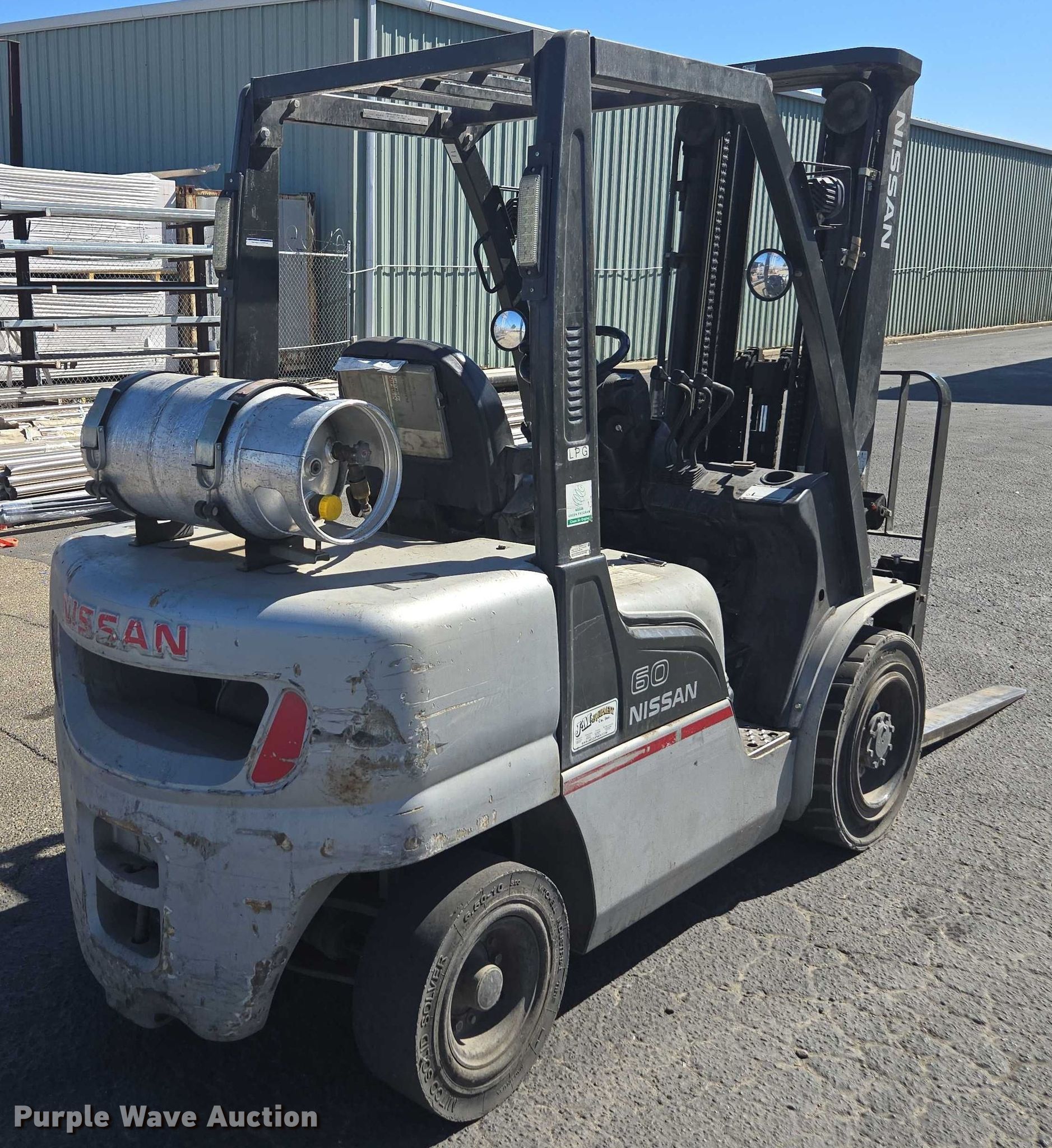 Purple Wave is selling a used Cushion Tire or Pneumatic Forklift in California. This item is a Nissan PF60 forklift with the following: Hours: 5,376 on meter, Miles or hours may vary, unit still in use, Serial: UG1F2-9L2122, Unit #: SFS2248