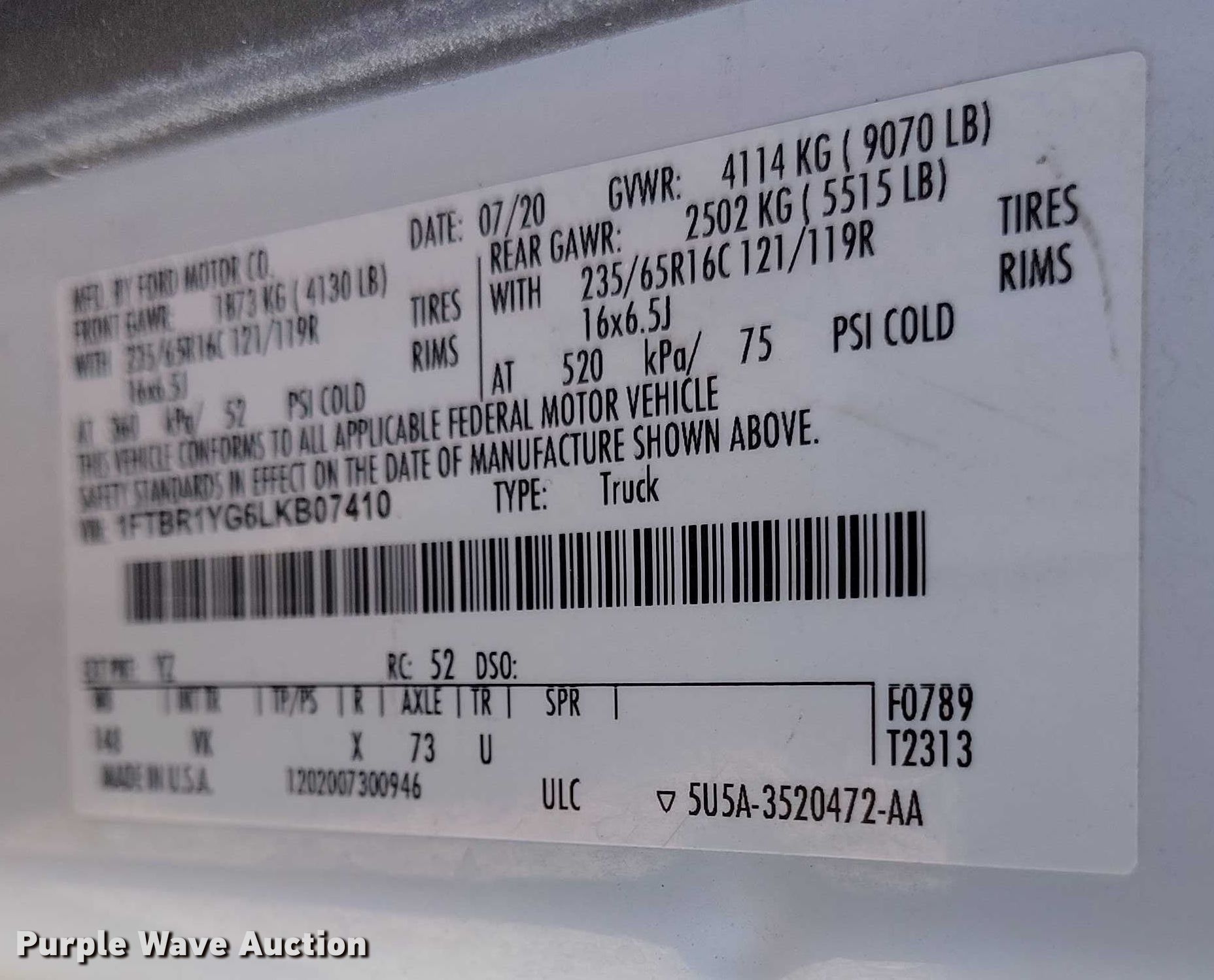 - VIN: 1FTBR1YG6LKB07410