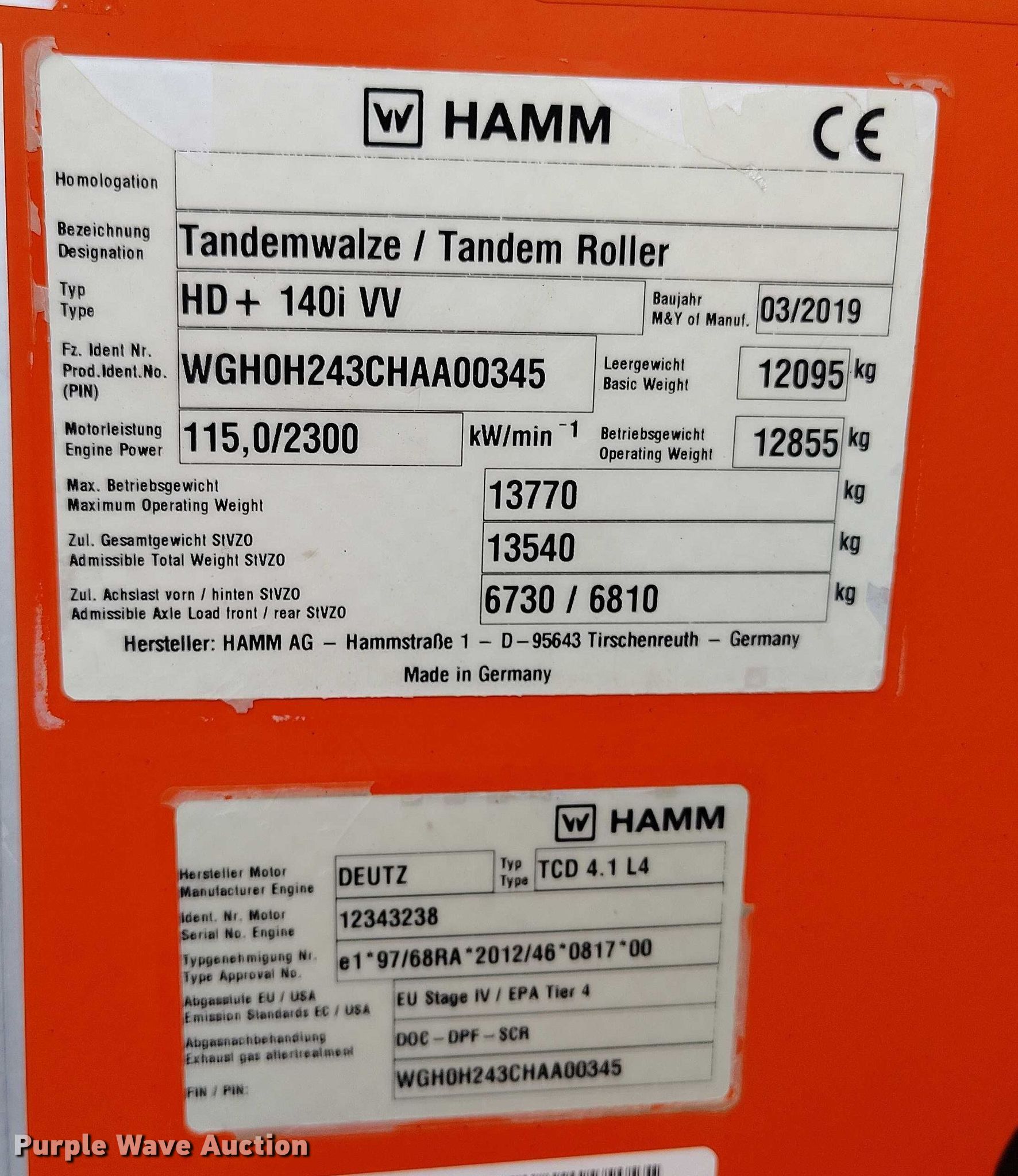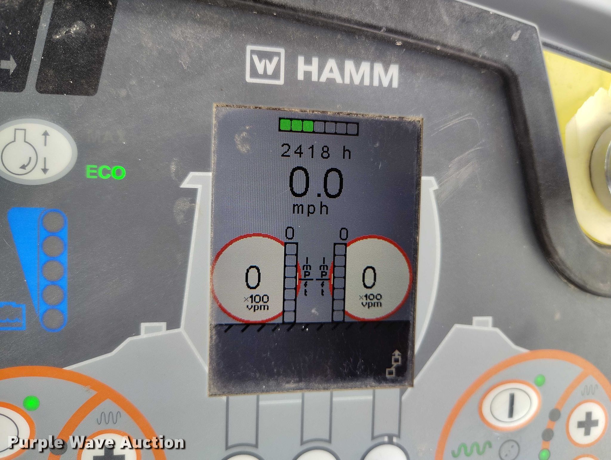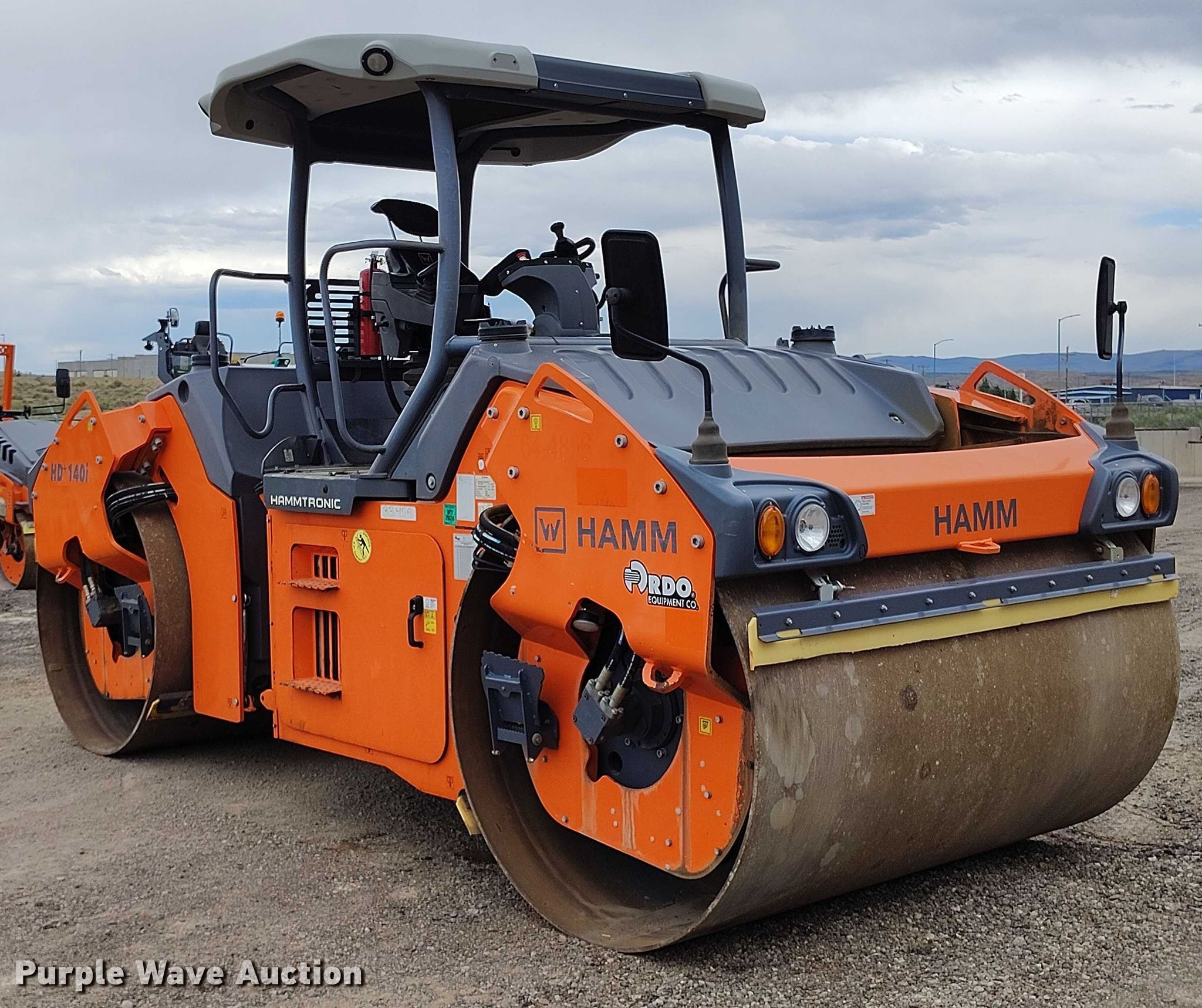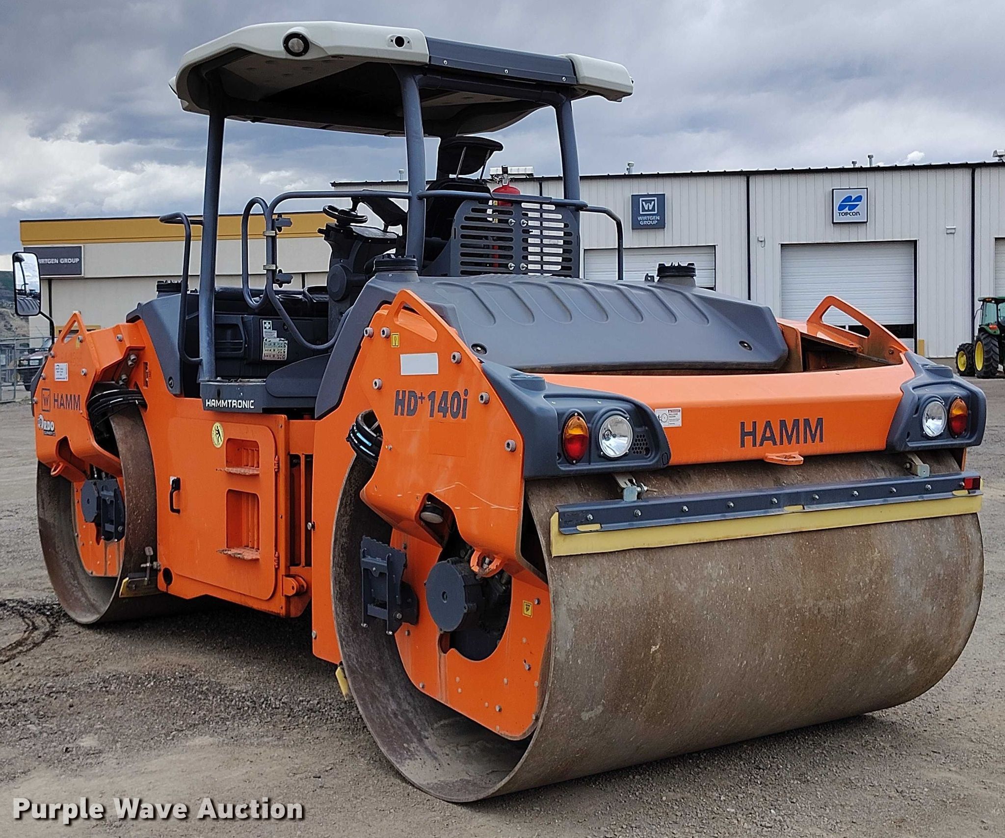 Purple Wave is selling a used Double Drum Roller Compactor in Wyoming. This item is a 2019 Hamm HD+ 140i VV double drum vibratory roller with the following: Hours: 2,417 on meter, Serial: WGH0H243VHAA00345