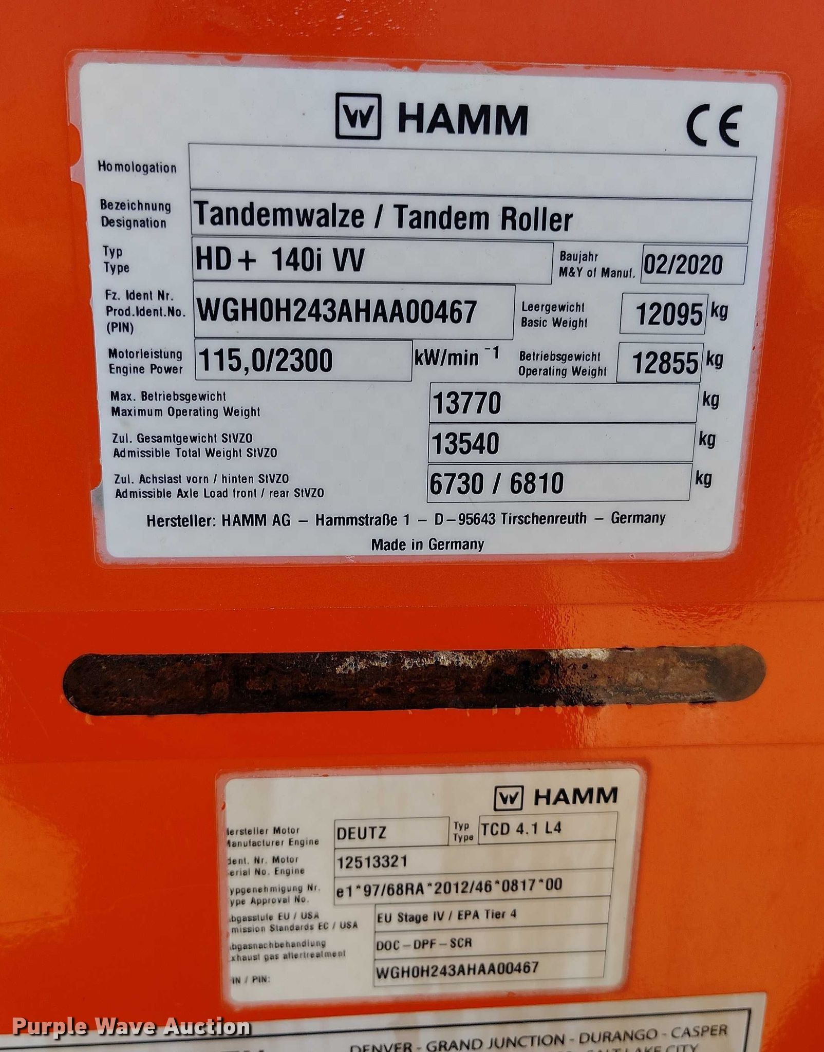 Purple Wave is selling a used Double Drum Roller Compactor in Idaho. This item is a 2020 Hamm HD+ 140i VV double drum vibratory roller with the following: Hours: 1,274 on meter, Serial: WGH0H243AHAA00467