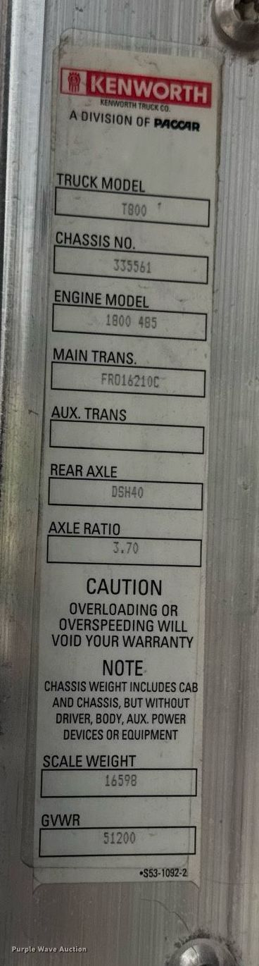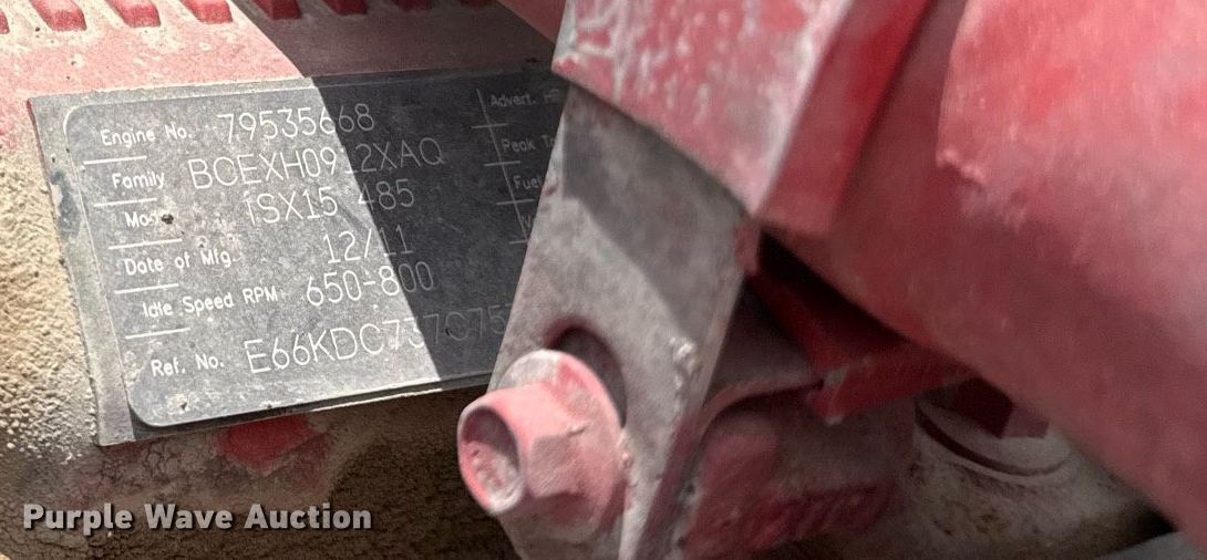 2012 Kenworth T800 semi truck. Miles: 592,802 on odometer, Hours: 19,550 on meter, VIN: 1XKDD49X3CJ335561. Engine Cummins ISX15, Displacement: 15.0L, Cylinders: 6, Fuel type: Diesel, Engine brake. Transmission Eaton Fuller, Manual, Speed: 10. Chassis Axles: Tandem, Differential lock: Full, Suspension: Air Dump valves, Brakes: Air, PTO, Wet kit, Truck chassis: 17', GVWR: 51,200 lbs FAWR: 13,200 lbs. Interior AC, Heat, Power locks, Cruise control. Features Deck plate: Aluminum, Fifth wheel type: Air operated, Sliding, Fuel tank: Single. Tires Size: 11R22.5. Notes Dash warning indicator: Check engine. Kansas title. Title distribution may be delayed up to 14 days from verification of funds. Sunflower Paving Inc.. Topeka, KS 66616