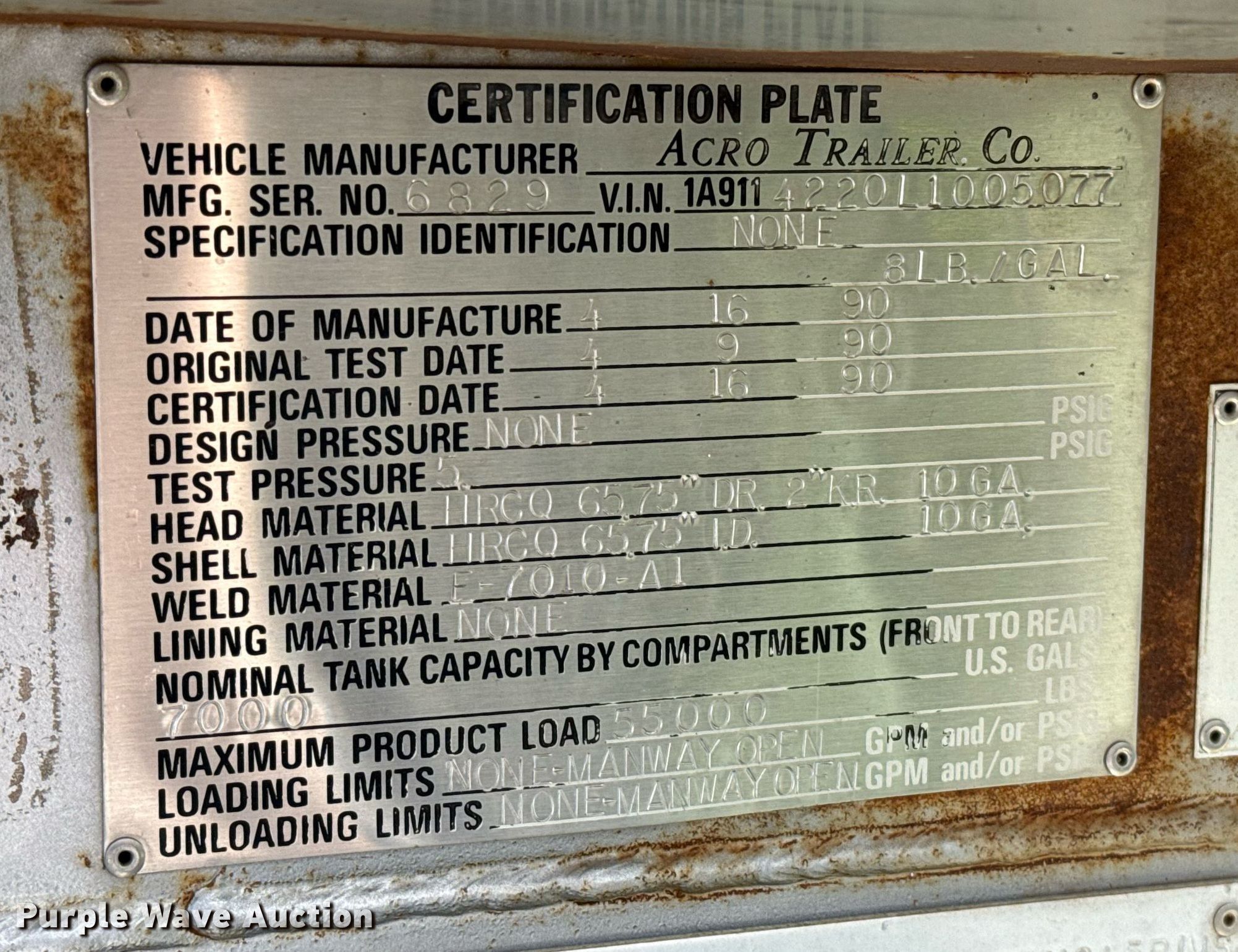 Purple Wave is selling a used Tank Trailer in Oklahoma. This item is a 1990 Acro Trailers Tank tank trailer with the following: VIN: 1A9114220L1005077
