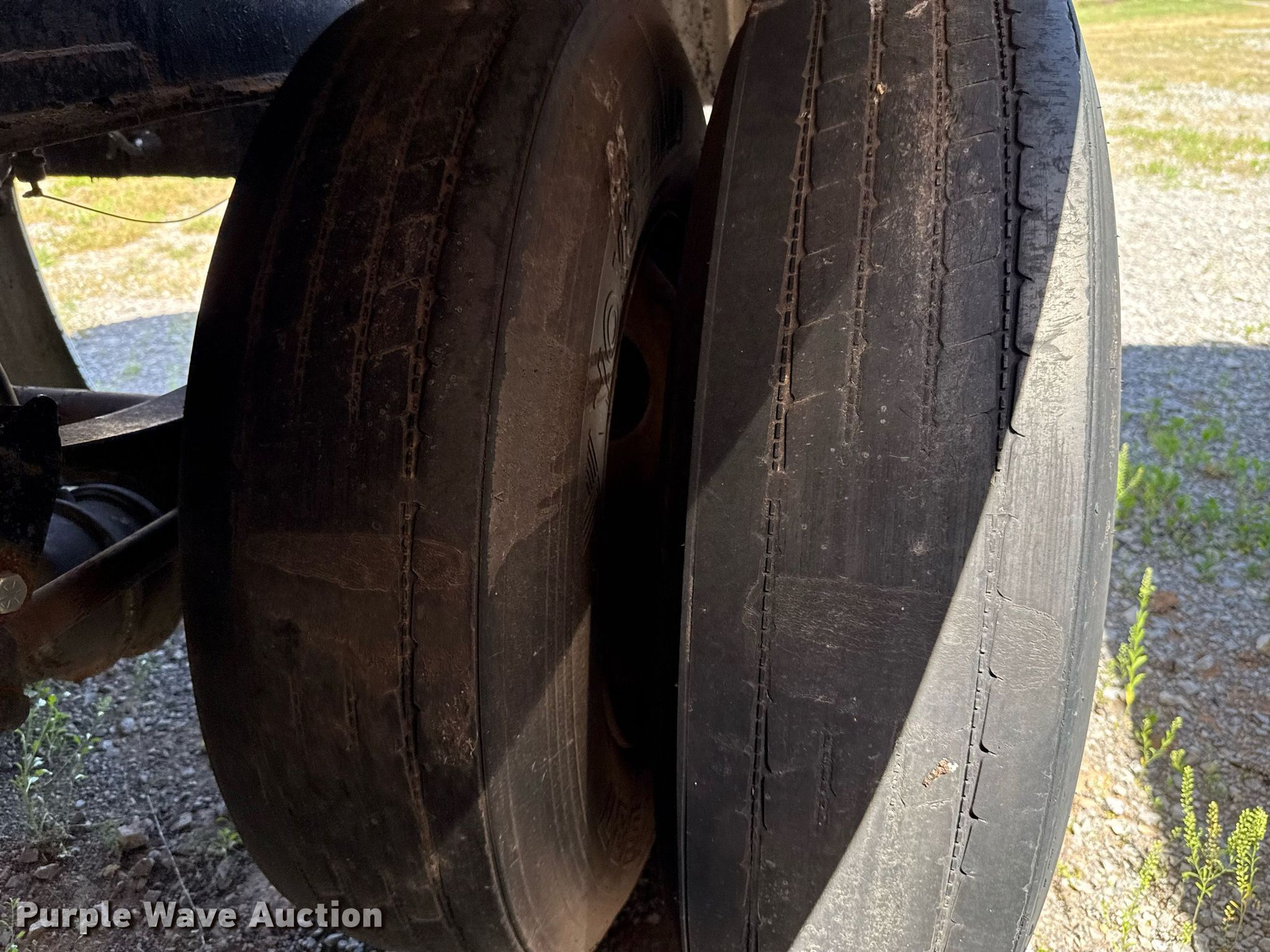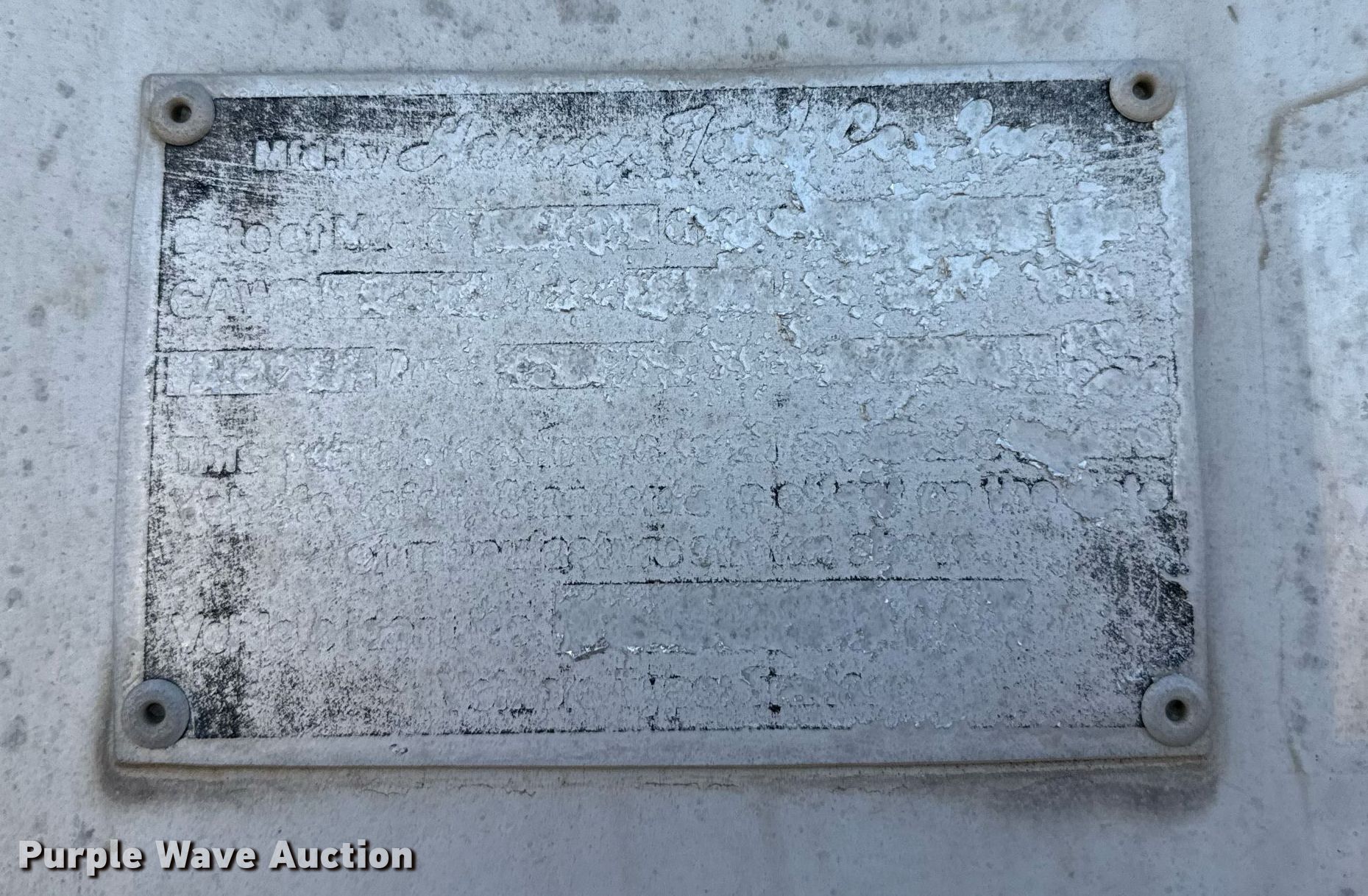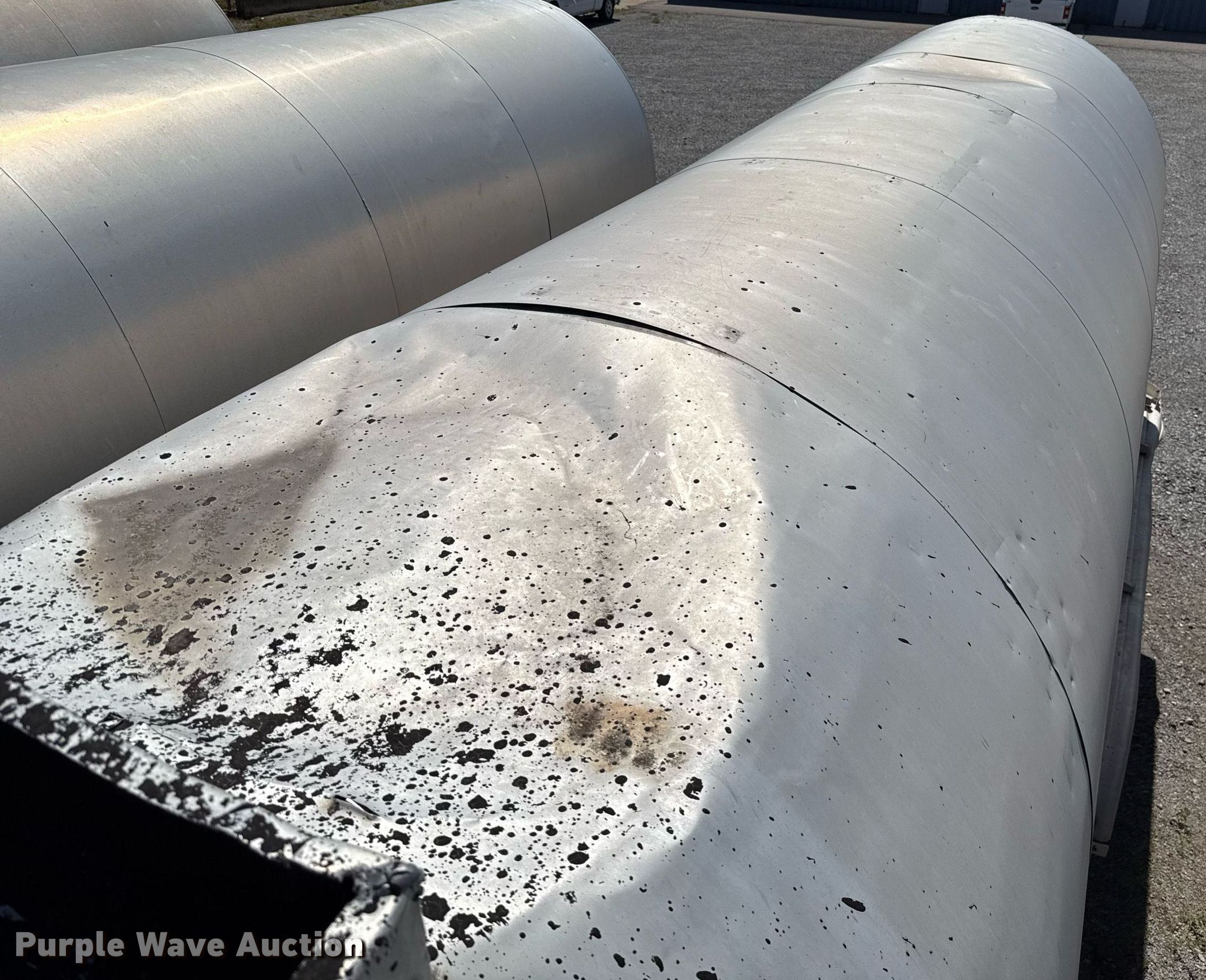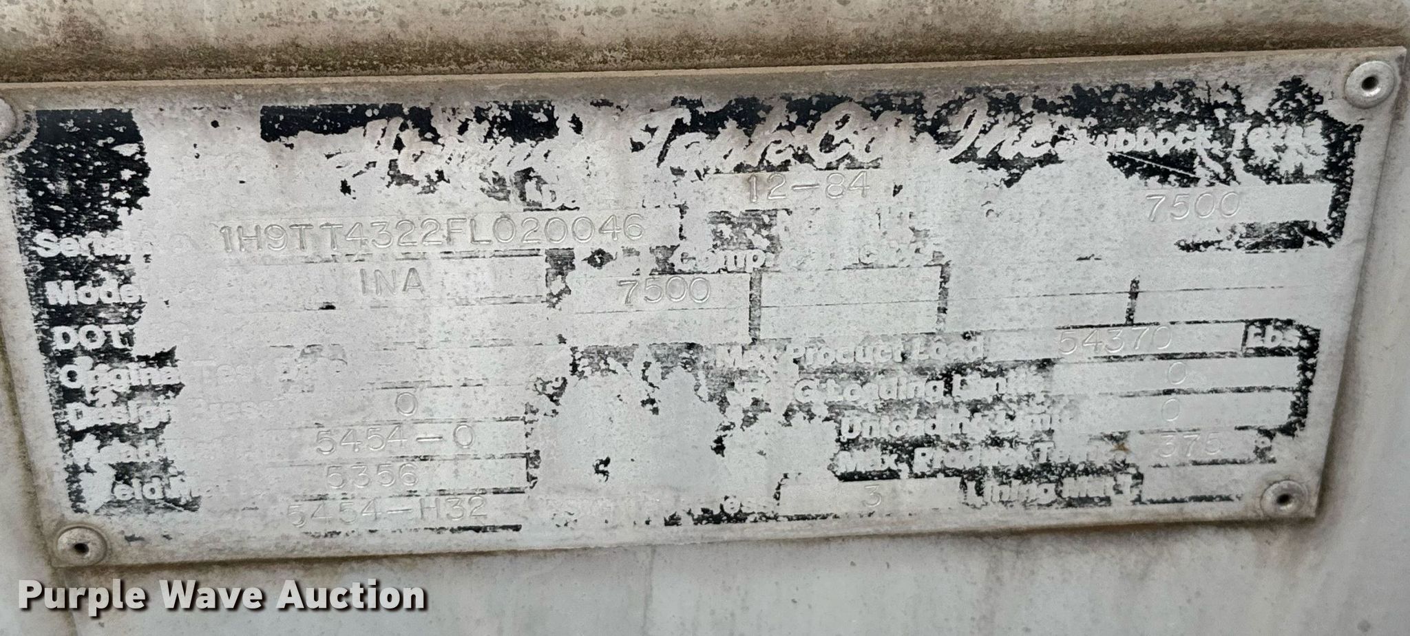 1985 Harmon Tank Company tank trailer. VIN: 1H9TT4322FL020046. Dimensions Overall: 42' L x 96" W. Features Tank type: Aluminum Capacity: 7,500 gallons, Outlet valves: 2 Size: 4", No. of manways/manholes: 1 Width: 16". Chassis Landing gear: Dual, Suspension: Spring, Brakes: Air, Axles: Tandem. Tires Steel wheels, Size: 11R22.5. Notes Flat tire, Tank damaged. Oklahoma title. Title distribution may be delayed up to 30 days from verification of funds. 1779 Marshall Road. Clinton, OK 73601