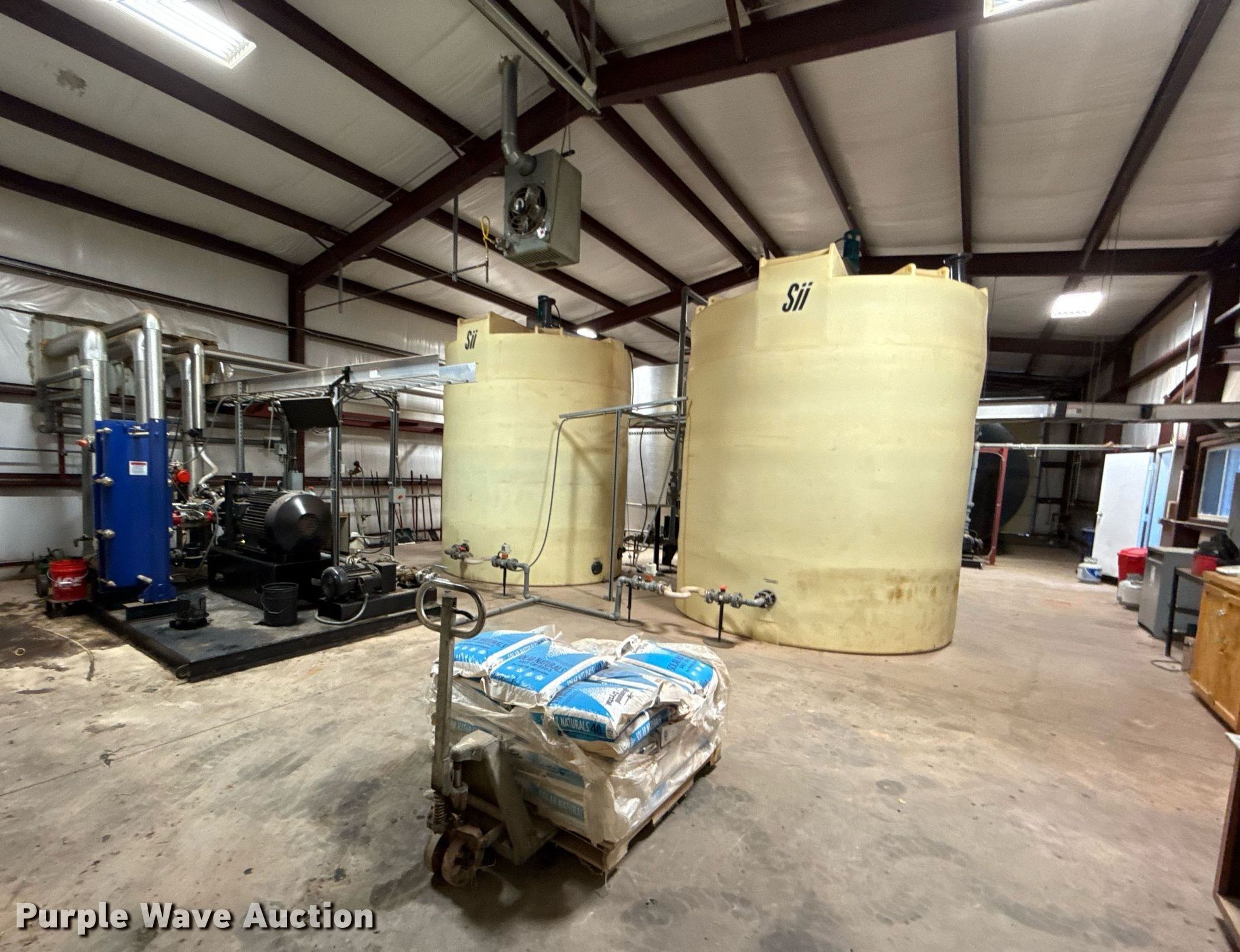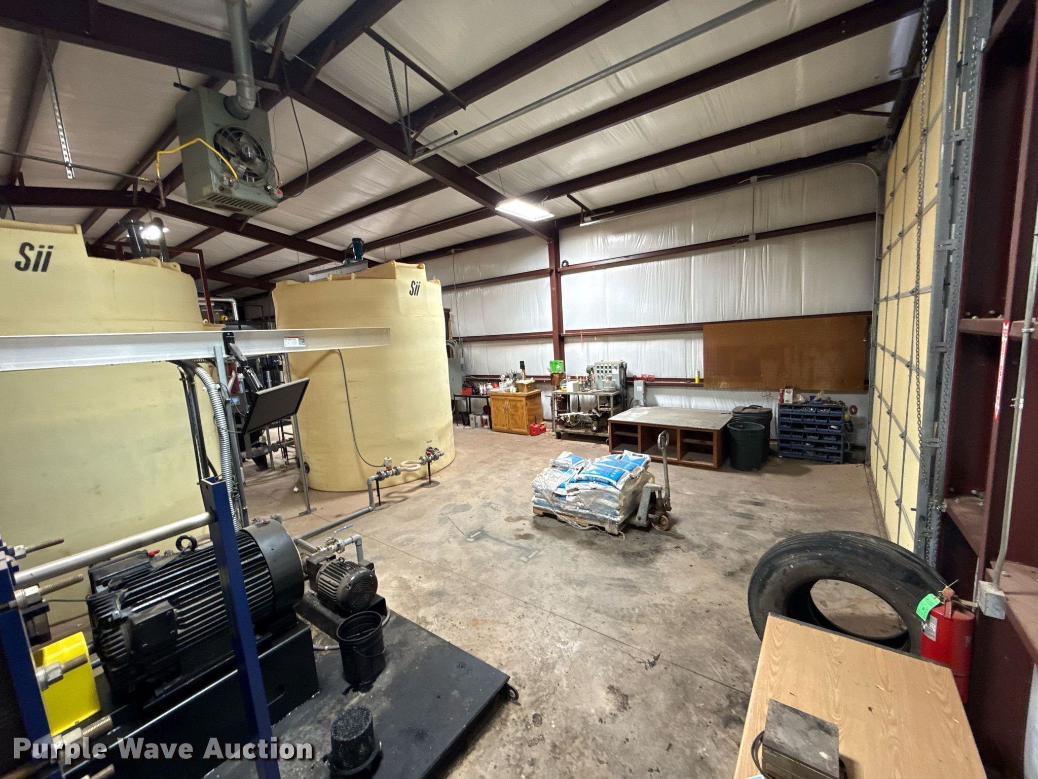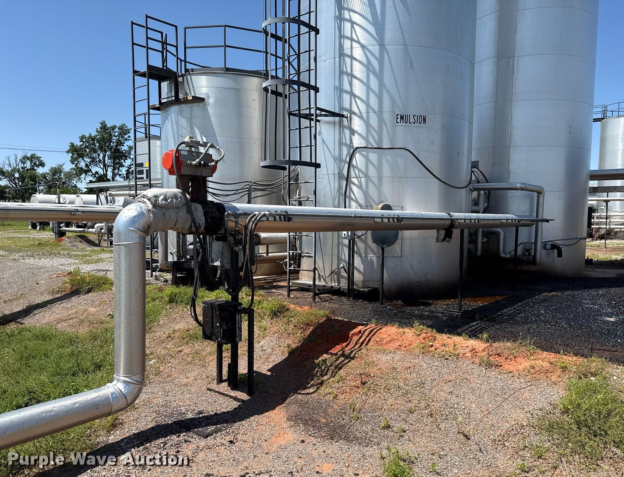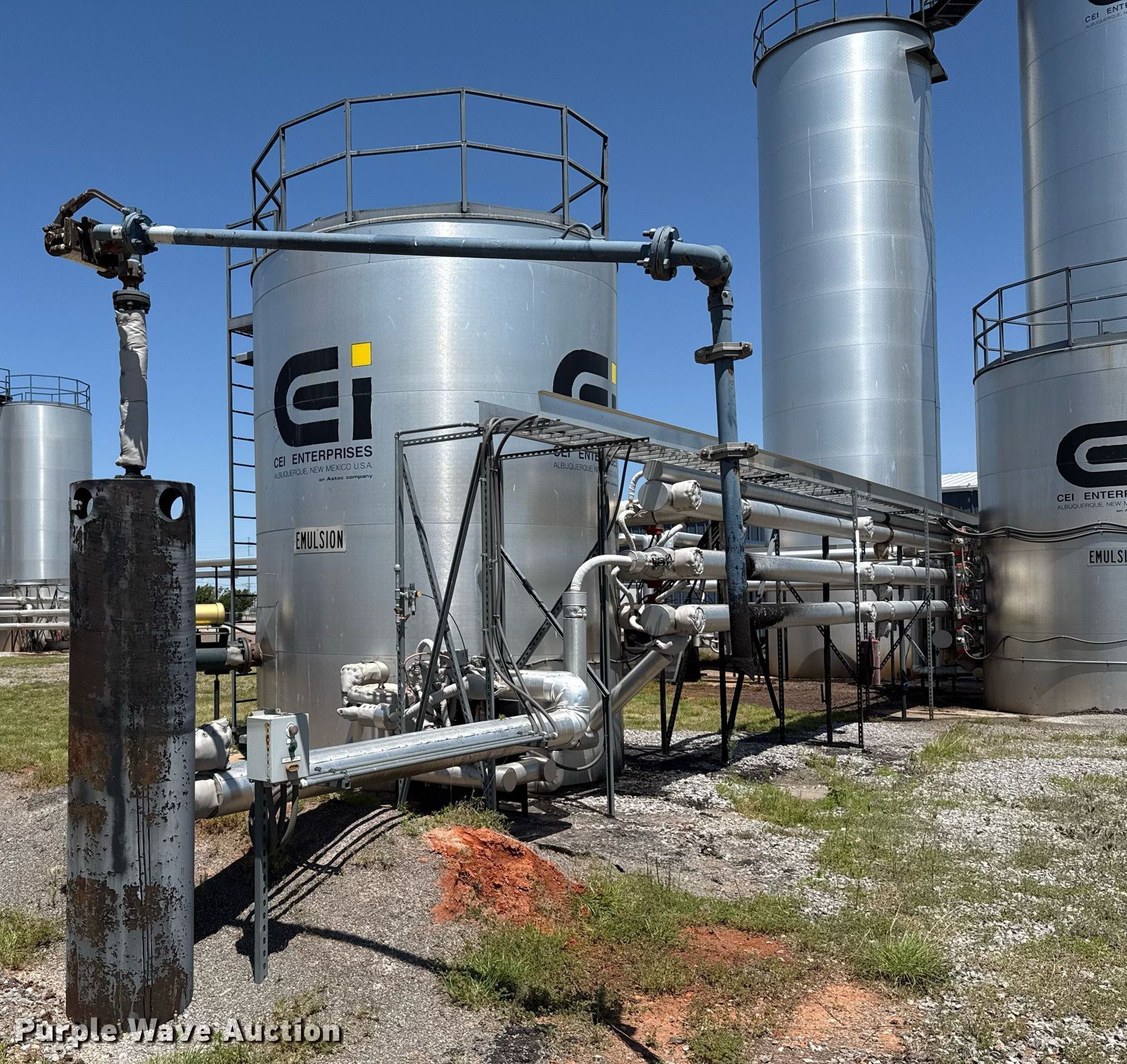 2013 CEI Enterprises asphalt emulsion plant. Dimensions. Building: 80' L x 40' W x 25' H, Scale house: 12' x 15'. Features Scale Sooner Scale Inc, Weight indicator GSE 465, CEI base AC tank Capacity: 40,000 gallons, (2) CEI base AC tanks Capacity: 20,000 gallons, (2) CEI TAV-30DEM emulsion tanks Agitators, CEI TAV-10D emulsion tank Agitator, Warm oil skid, (4) pumps, CEI 6300 oil heater Fuel type: Natural gas, CEI water mix tank, (2) Snyder poly tanks Agitators, CEI TAV6.5 emulsifier tank Capacity: 6,500 gallons, Dalworth MP10SE emulsion mill skid Heat exchanger, Emulsion lab equipment and more. Notes Contents included, Documentation available upon request to [email protected] Contents, Components, Specifications. Disassembly and removal of all structures, hardware, contents, refuse and any other associated debris must be absolute from the entire property and is the sole responsibility of the purchaser.. Item must be removed by December 31, 2025.. Purchaser must provide proof of a one million dollar liability insurance policy prior to removal. Open Inspection July 16. 1779 Marshall Road. Clinton, OK 73601