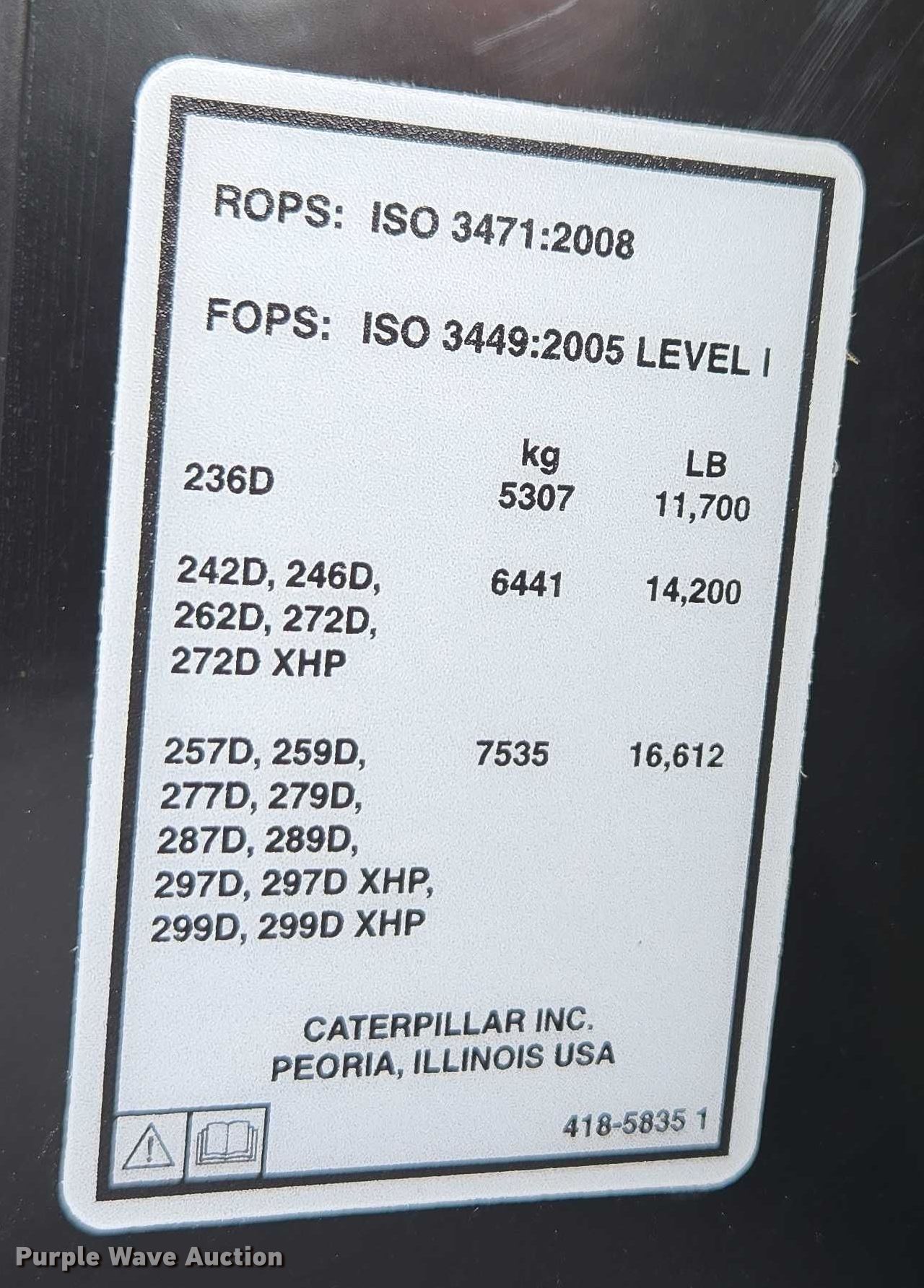 2018 Caterpillar 246D skid steer loader. Hours: 1,890 on meter, Serial: CAT0246DVBYF04572. Engine Caterpillar C3.3B, Serial: 8JL3122, Displacement: 3.3L, Cylinders: 4, Fuel type: Diesel, kW: 54.6. Transmission Hydrostatic, Two speed travel. Operators station Enclosed cab, AC, Heat, Backup camera, Bucket control: Hand, Electronic Monitoring System panel. Features Auxiliary hydraulics, Auxiliary electrical outlet, Quick coupler: Hydraulic, Counter weights, Bucket Caterpillar 279-5376, Capacity: 0.62 cu.yd., Width: 80", Cutting edge: Bolt-on. Tires Size: 12-16.5. Dakota Constructors, Inc. Sioux Falls, SD 57108