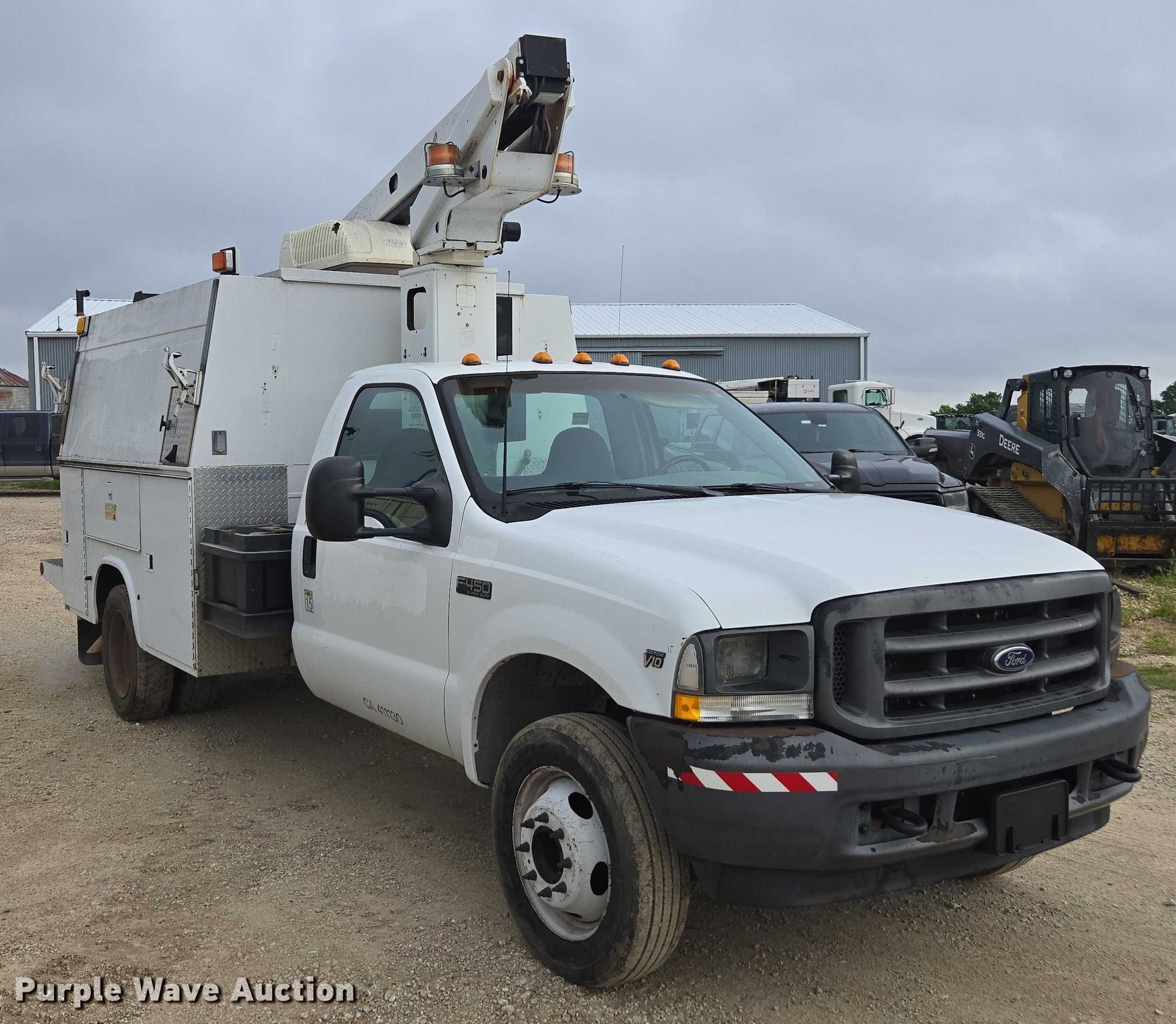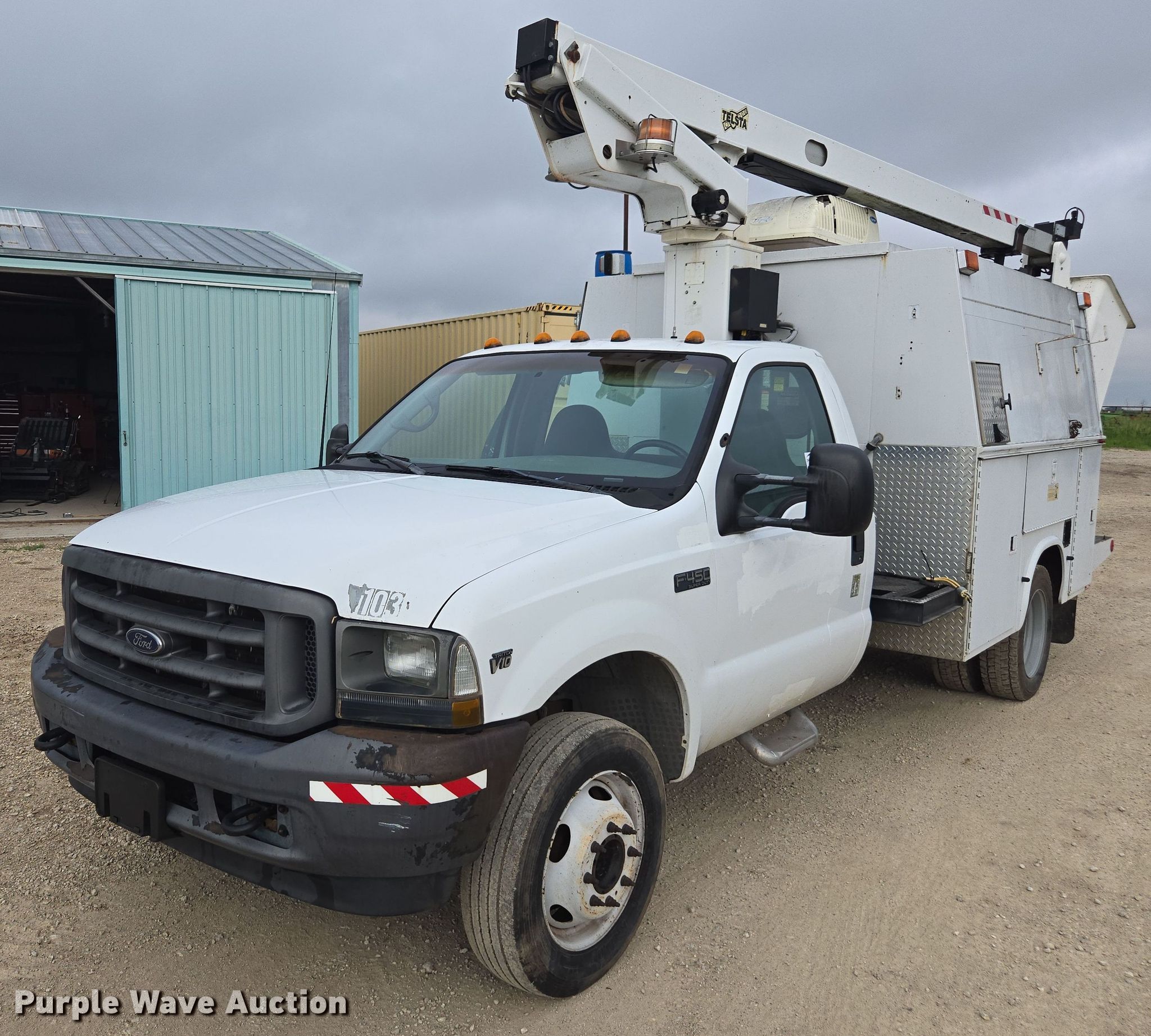 Purple Wave is selling a used Bucket Truck in Kansas. This item is a 2002 Ford F450 Super Duty bucket truck with the following: Miles: Unknown, VIN: 1FDXF46S52ED64929