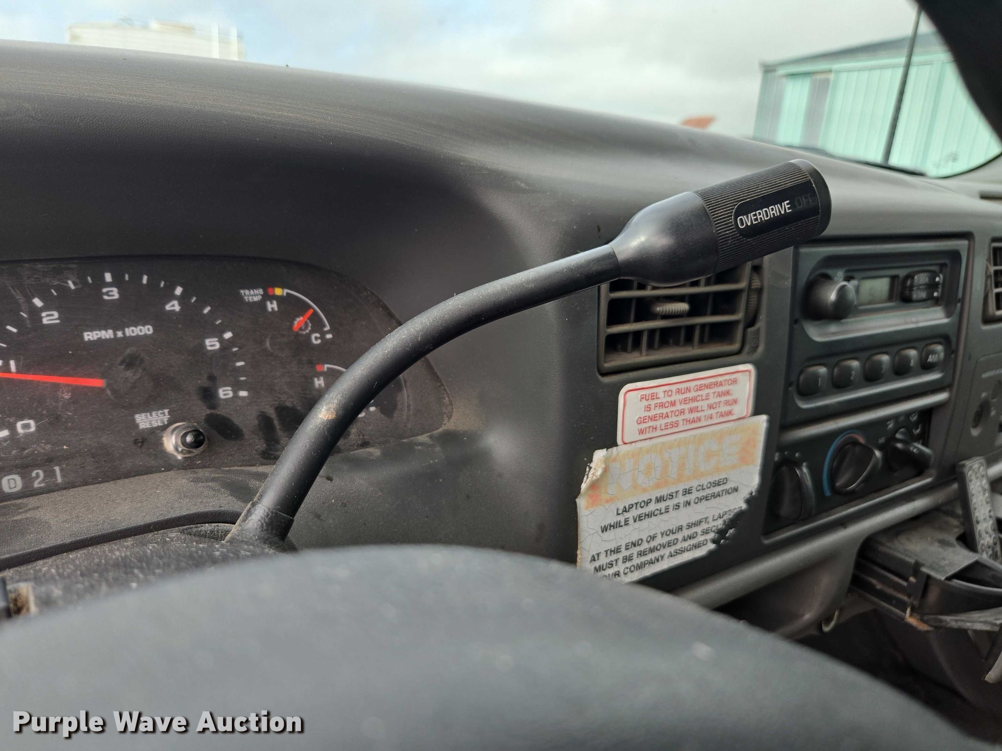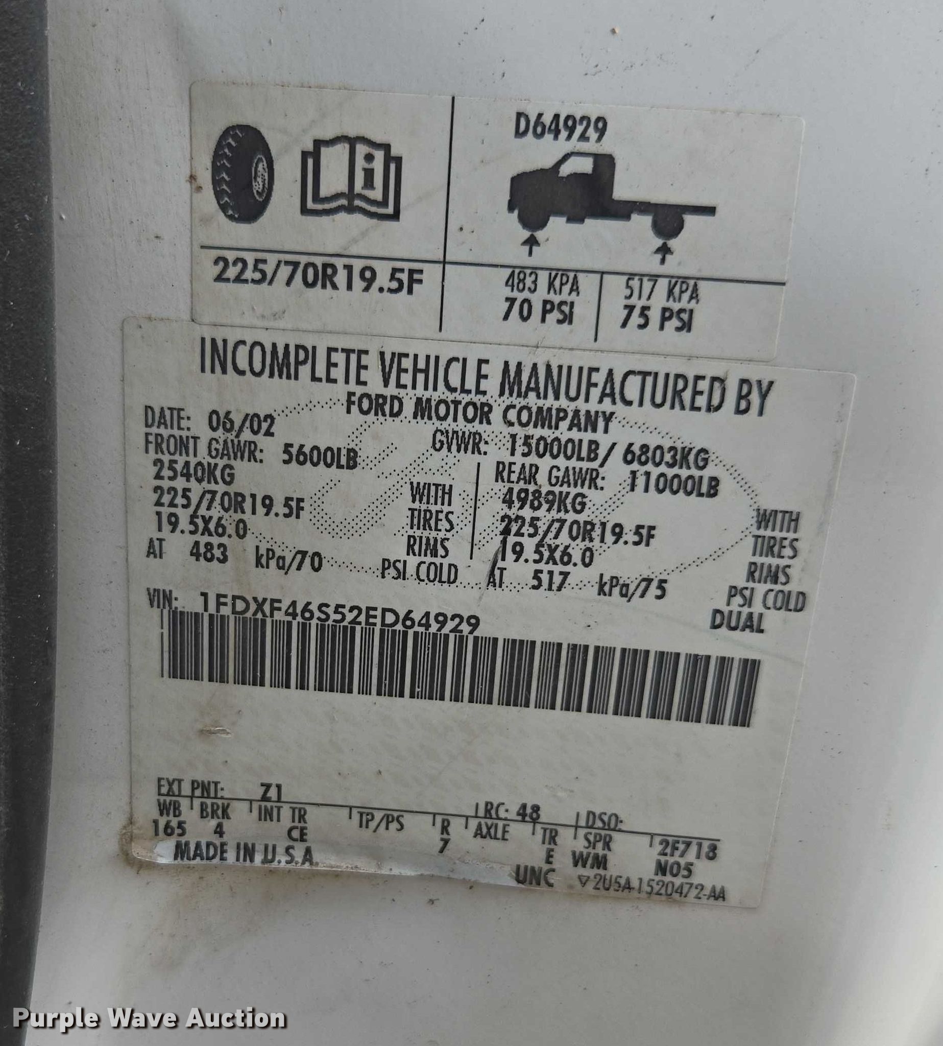 2002 Ford F450 Super Duty bucket truck. Miles: Unknown, VIN: 1FDXF46S52ED64929. Engine Displacement: 6.8L, Cylinders: 10, Fuel type: Gas. Transmission Automatic. Chassis Axles: Single, Suspension: Spring, Brakes: Hydraulic, GVWR: 15,000 lbs. Interior AC, Heat, Power windows, Power locks. Features Bed Knapheide, 9' L x 94" W, Boom Telstra, Boom length: 13', Boom type: Telescopic, Man basket, Boom controls Platform/ basket.. Tires Size: 225/70R19.5. Notes Non-operational odometer. Oklahoma title. Mileage has not been verified. Exempt will be written in the odometer disclosure on the title. Title distribution may be delayed up to 30 days from verification of funds. Midwest Fusion Fiber Splicing, LLC. Lost Springs, KS 66859