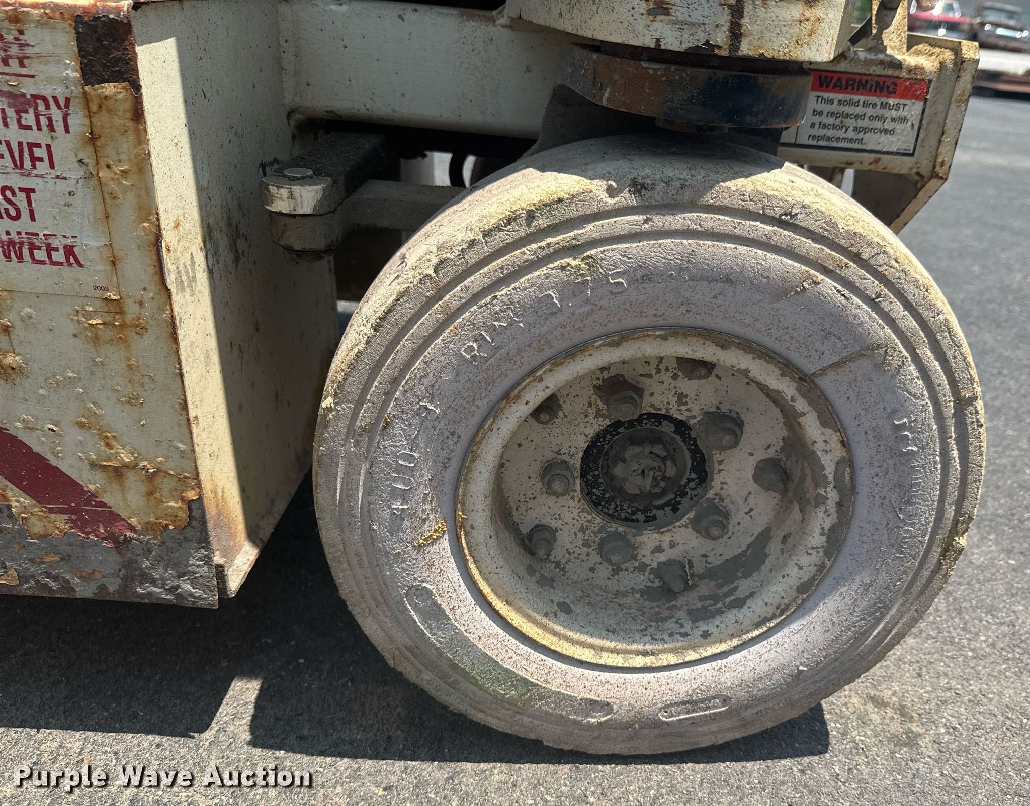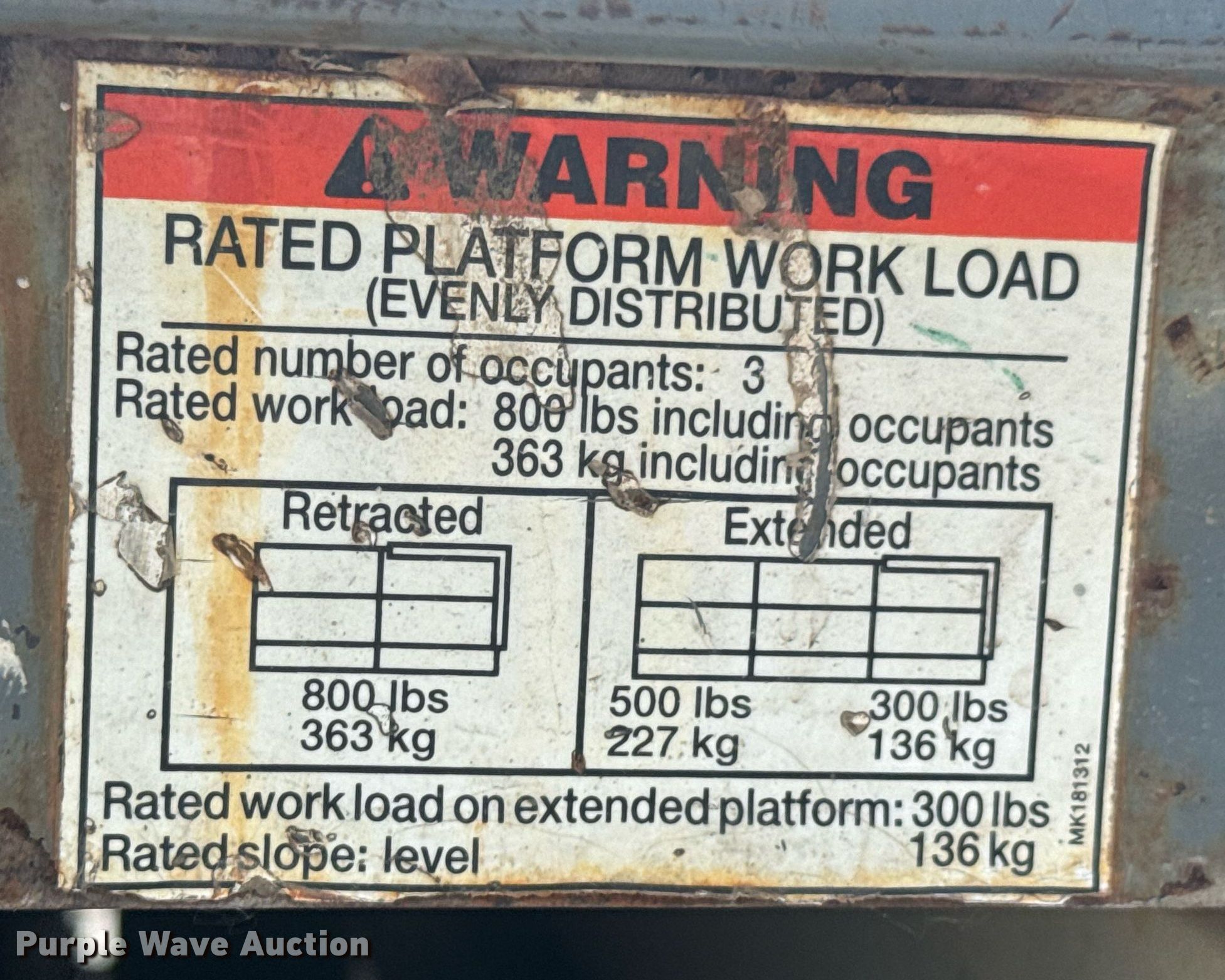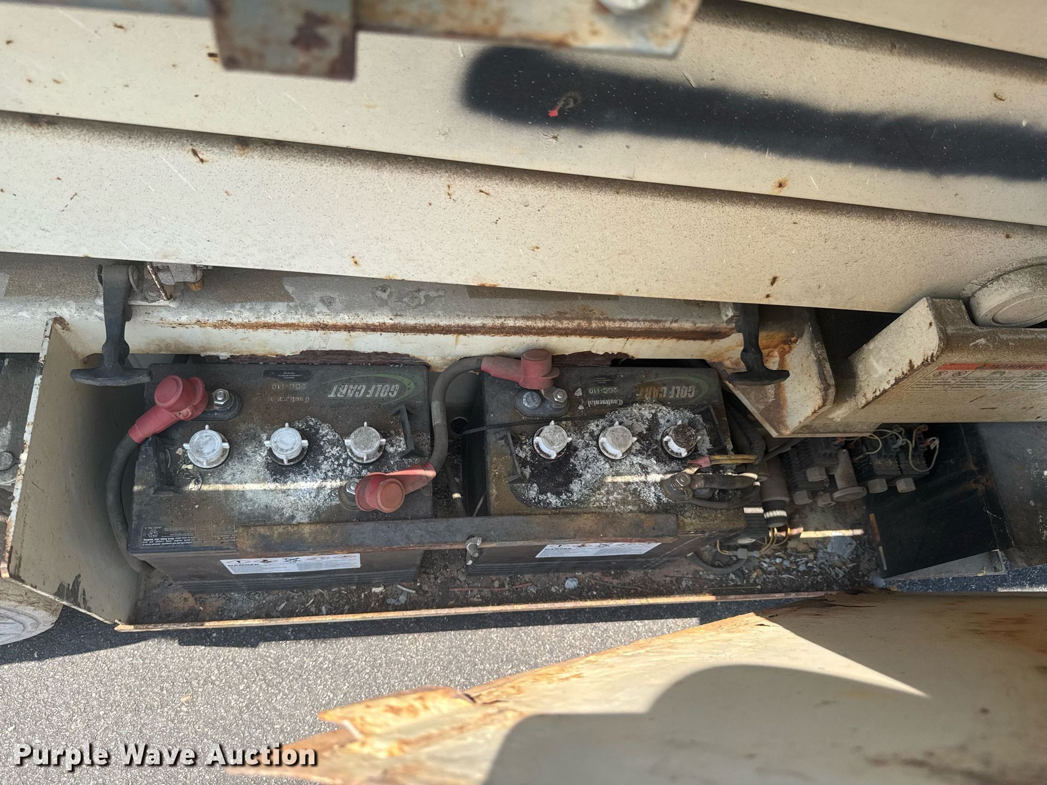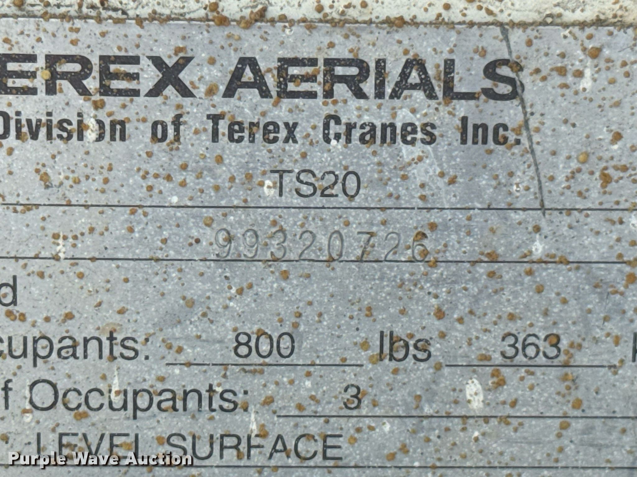 Terex TS20 scissor lift. Hours: 591 on meter, Serial: 99320726. Electric Motor Volts: 48. Features Maximum lift capacity: 800 lbs, Maximum lift height: 20', Platform: 96" L x 29" W, AC power outlet, Controls: Platform, Platform extensions: Manual. Tires Tire size: 4.00-8, Solid. Teeters Hay and Cattle, LLC. Quapaw, OK 74363
