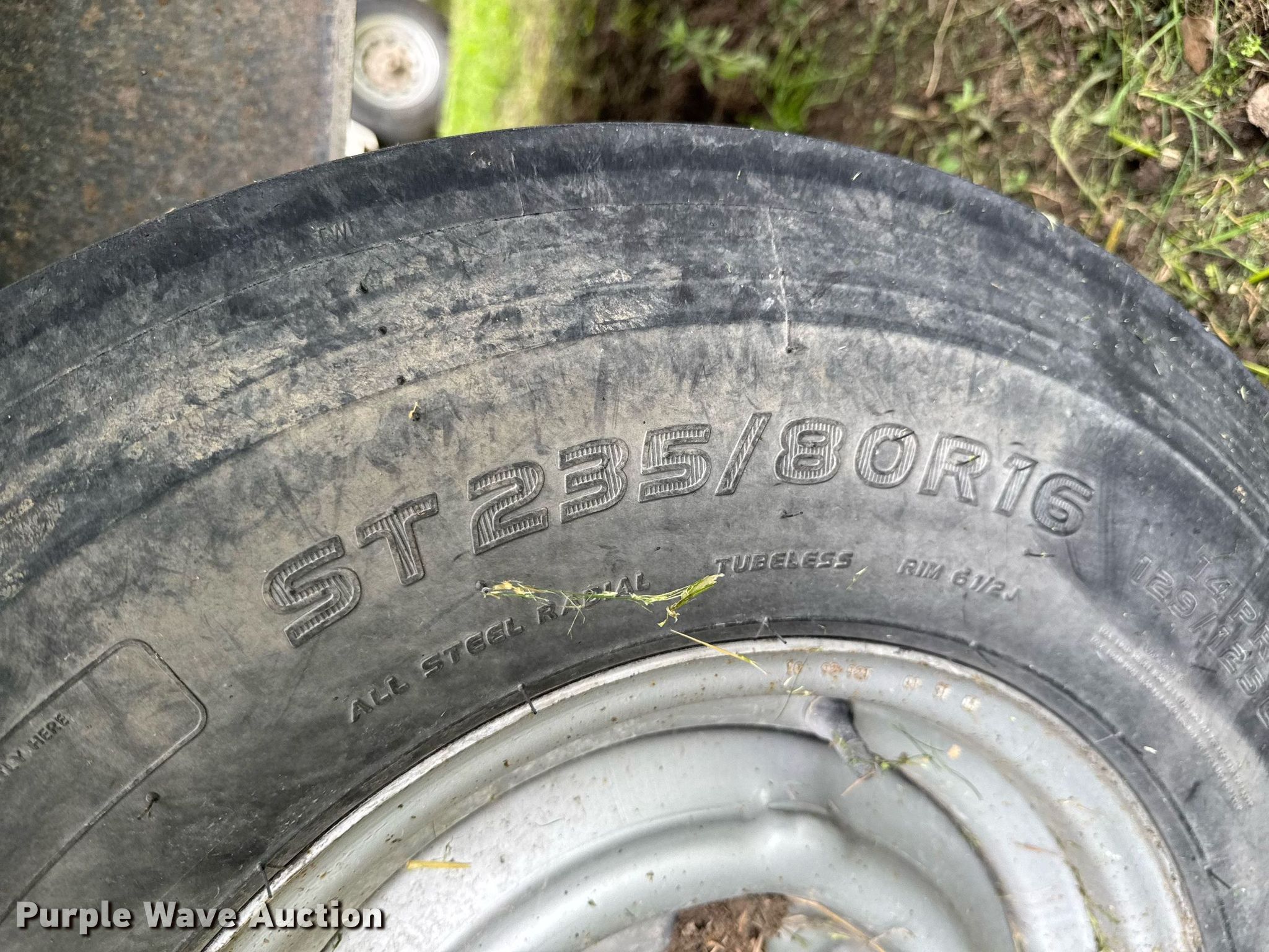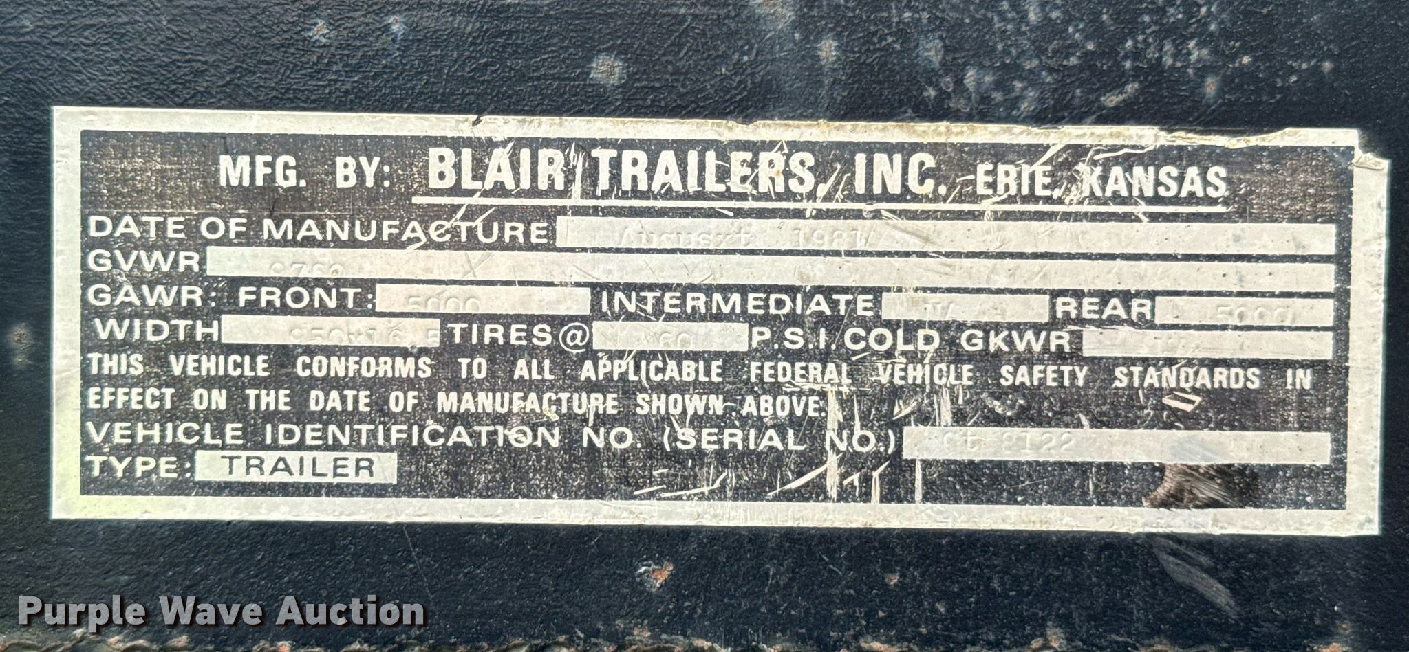 1981 Blair dump trailer. VIN: GT8122. Dimensions Overall: 23' L x 94" W, Body: 16' L, Side height: 40". Features Body type: Steel, Ram: Single, Trailer controls. Chassis Hitch: Gooseneck, Landing gear: Single, Suspension: Spring, Brakes: Electric, Axles: Tandem, GVWR: 9,760 lbs, GAWR: 5,000 lbs. Tires Steel wheels, Size: ST225/90R16. Kansas title. Title distribution may be delayed up to 14 days from verification of funds. Brooks Tree Services. Thayer, KS 66776