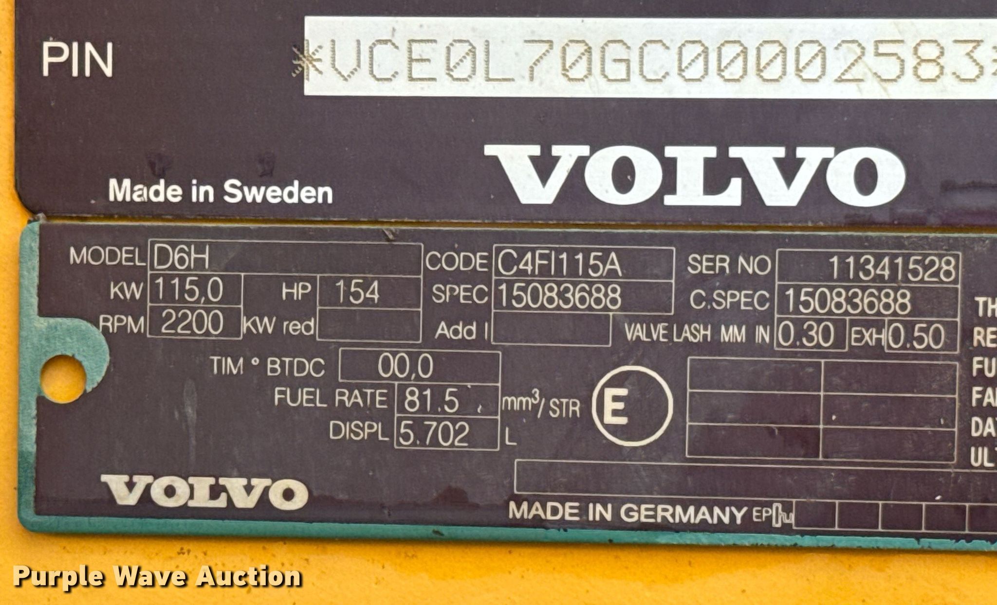 2013 Volvo L70G wheel loader. Hours: 12,344 on meter, Serial: VCE0L70GC00002583. Engine Volvo D6H, Serial: 11341528, Displacement: 5.7L, Cylinders: 6, Fuel type: Diesel, HP: 154. Transmission Powershift, 4F - 4R. Operators station Enclosed cab, AC, Heat, Bucket controls: Joystick. Features Quick coupler: Hydraulic, Counter weights. Tires Size: 20.5R25. Notes Forks will be removed prior to auction. Tri Star Construction LLC. Tulsa, OK 74116