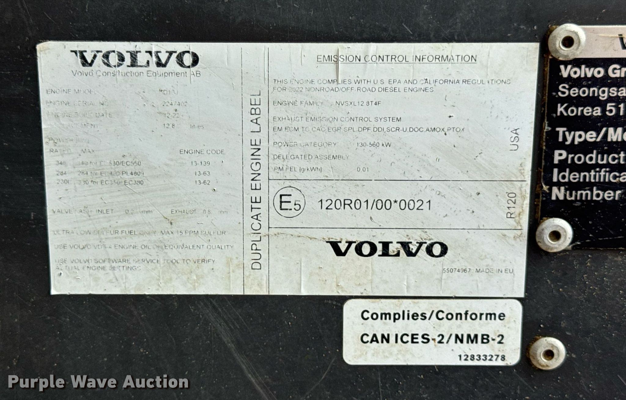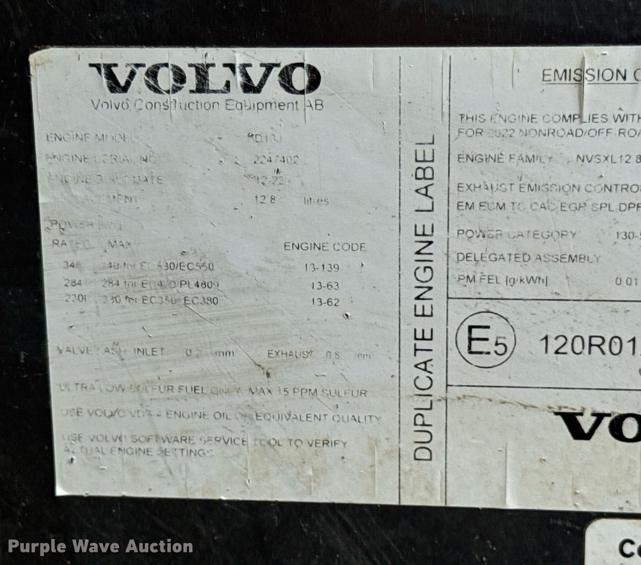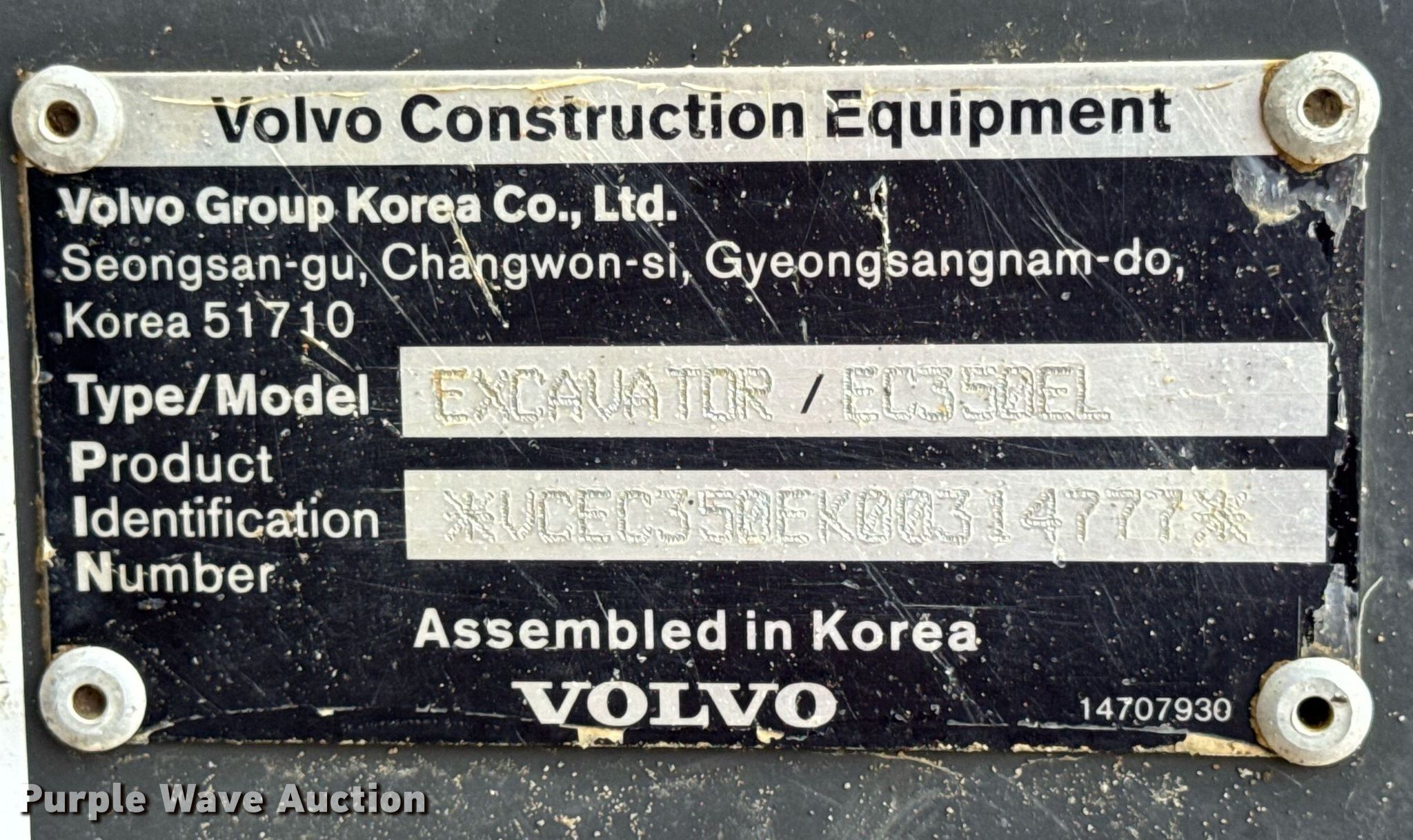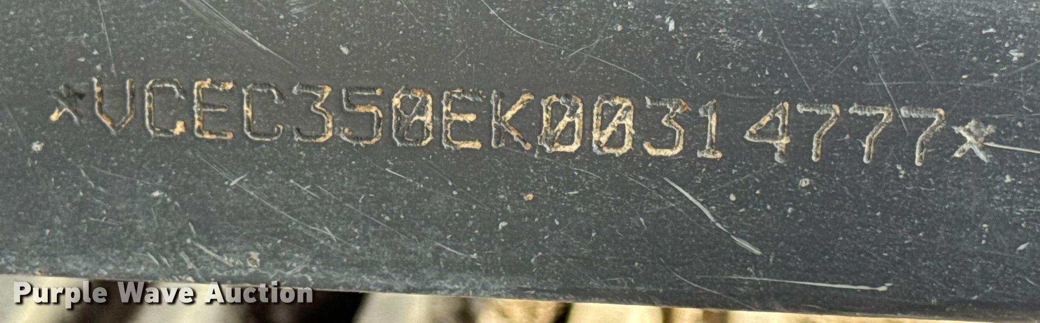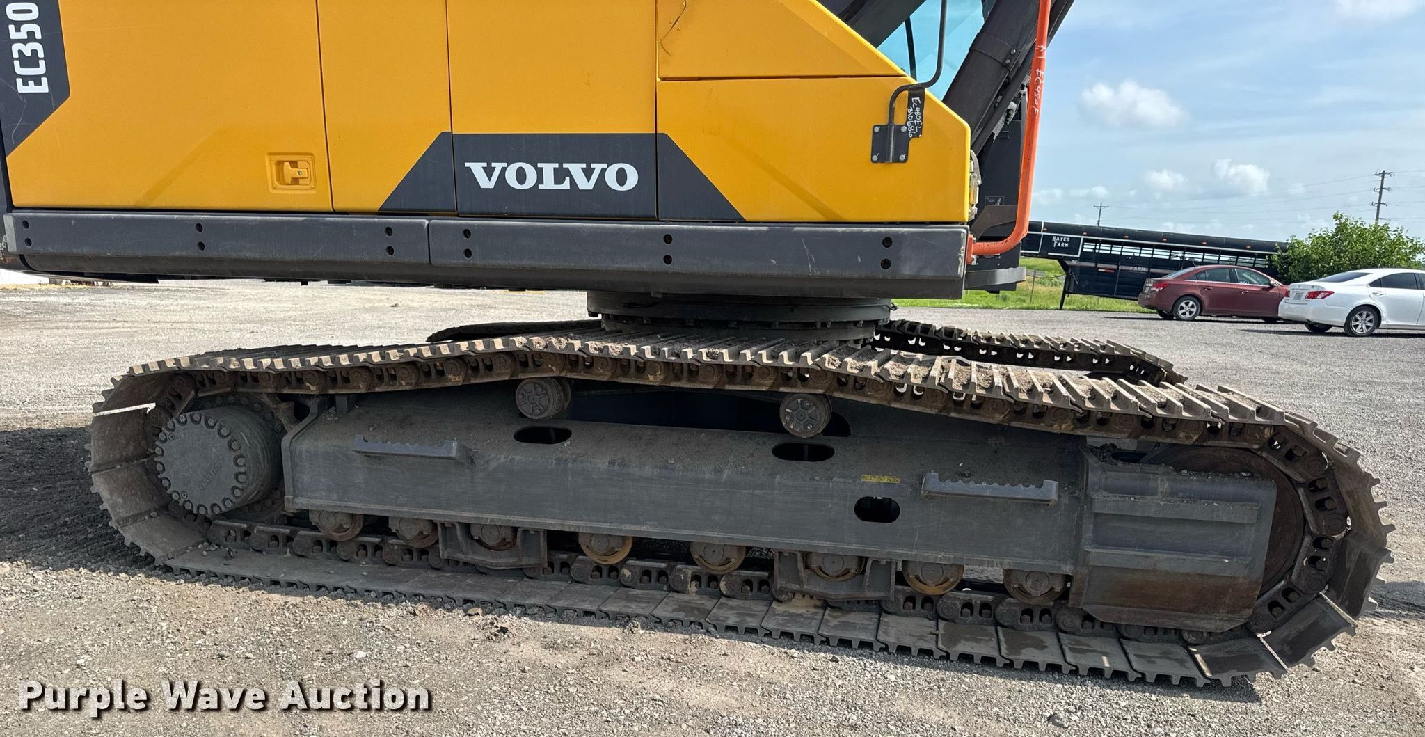 2023 Volvo EC350EL excavator. Hours: 516 on meter, Serial: VCEC350EK00314777. Engine Volvo D13J, Serial: 2247402, Displacement: 12.8L, Cylinders: 6, Fuel type: Diesel. Transmission Hydrostatic, Two speed travel. Operators station Enclosed cab, AC, Heat, Backup camera. Features Auxiliary hydraulics, Counter weights, Removable, Boom Standard, Stick Stick length: 10' 6", Bucket TAG, Capacity: 3.375 cu.yd., Width: 71", Teeth: 6. Tracks Width: 31.5", Steel, Grouser pads: Triple. Notes Warning indicator: P054001 Inlet Air Heater. Commercial Truck and Trailer Repair. Nelson, MO 65347
