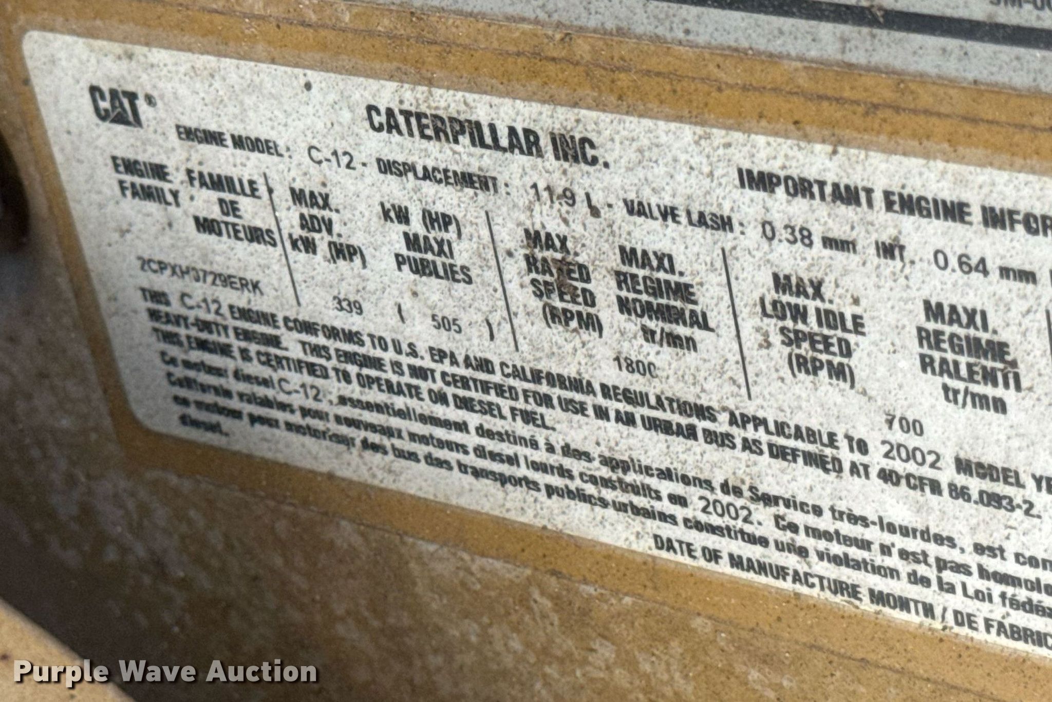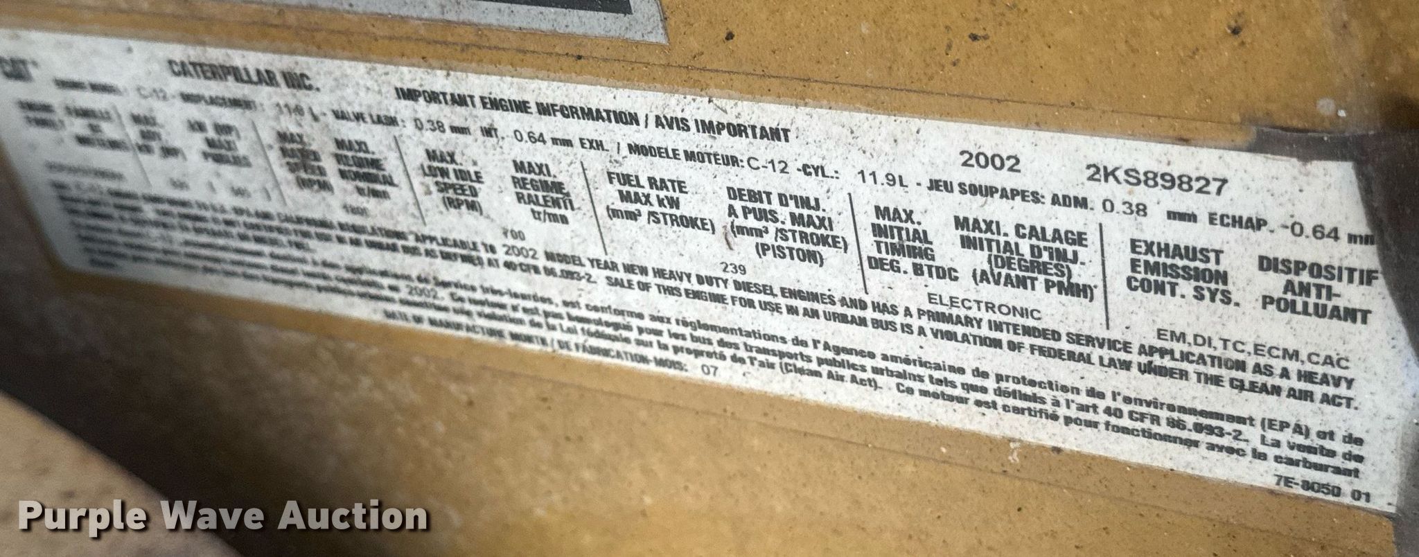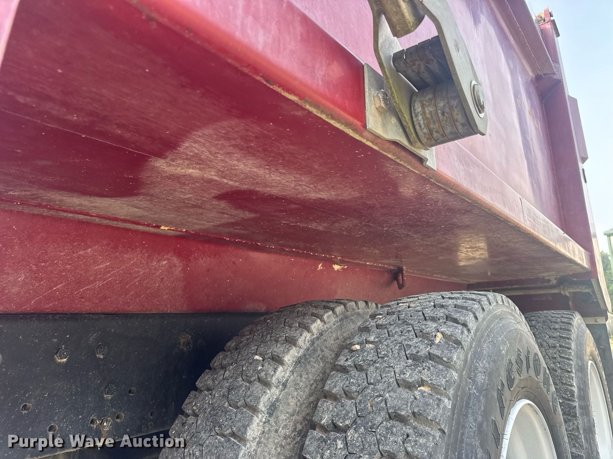 2003 International 7600 6X4 dump truck. Miles: 95,895 on odometer, Hours: 8,415 on meter, VIN: 1HSWXAXR53J065836. Engine Caterpillar C-12, Serial: 2KS89827, Displacement: 11.9L, Cylinders: 6, Fuel type: Diesel. Transmission Eaton Fuller, Manual, Speed: 9. Chassis Double frame, Axles: Tandem, Differential lock: Inter-axle, Suspension: Spring over walking beam, Brakes: Air, PTO, GVWR: 52,860 lbs FAWR: 12,860 lbs, IAWR: 20,000 lbs, RAWR: 20,000 lbs. Interior AC, Heat, Cruise control. Features Dump bed Lanau SH16X48X60, 16' x 99" W, Side height: 48", Side board height: 12", Bed type: Steel, Roll tarp, Ram: Single, End gate: Air operated. Tires Front: 385/65R22.5, Rear: 11R22.5. Notes Dash warning indicator: ABS, Possible AC issues, may need charged, Non-operational fuel gauge, Air leak. Missouri title. Title distribution may be delayed up to 14 days from verification of funds. Stieferman Construction Services. Bonnots Mill, MO 65016