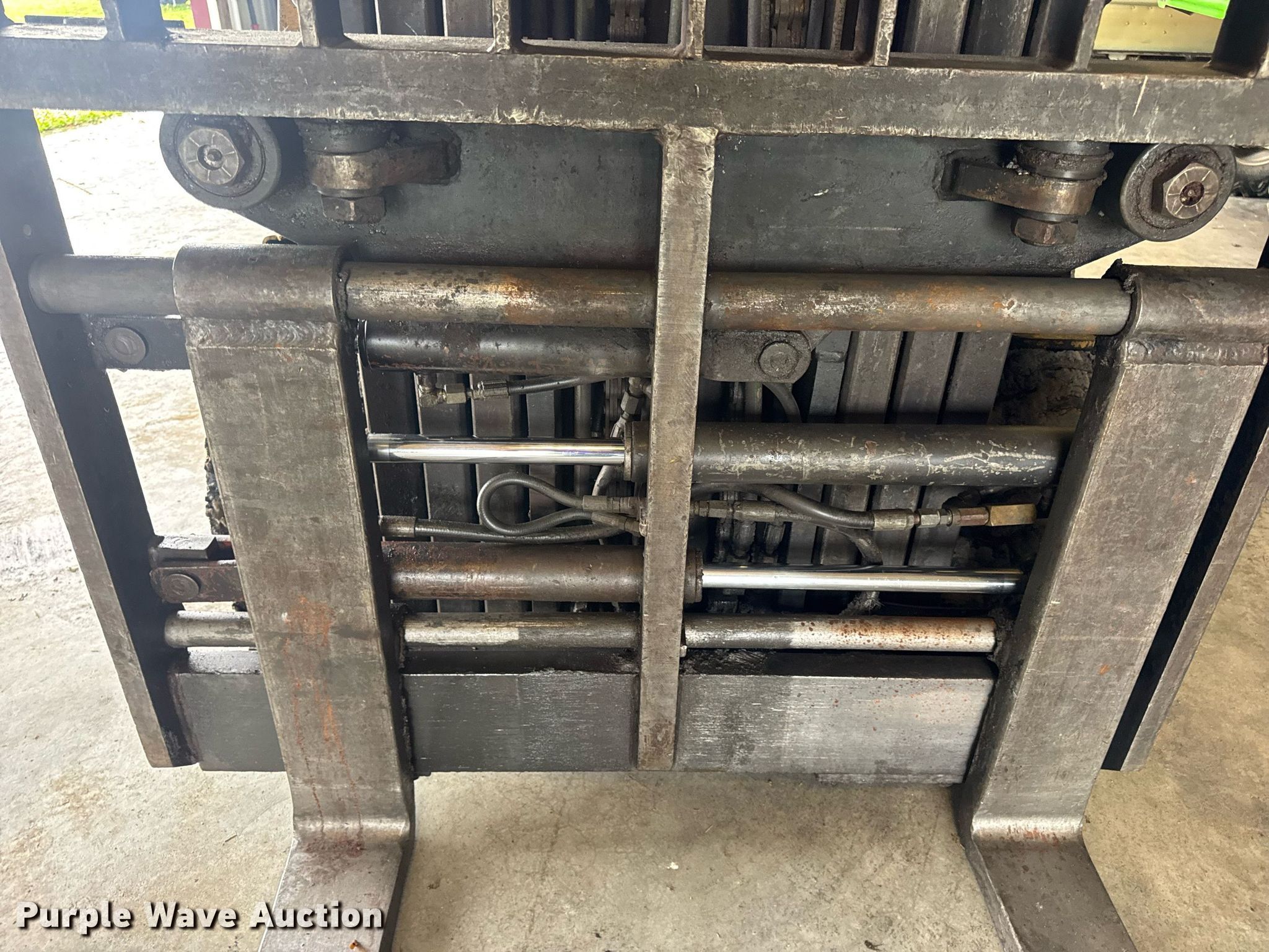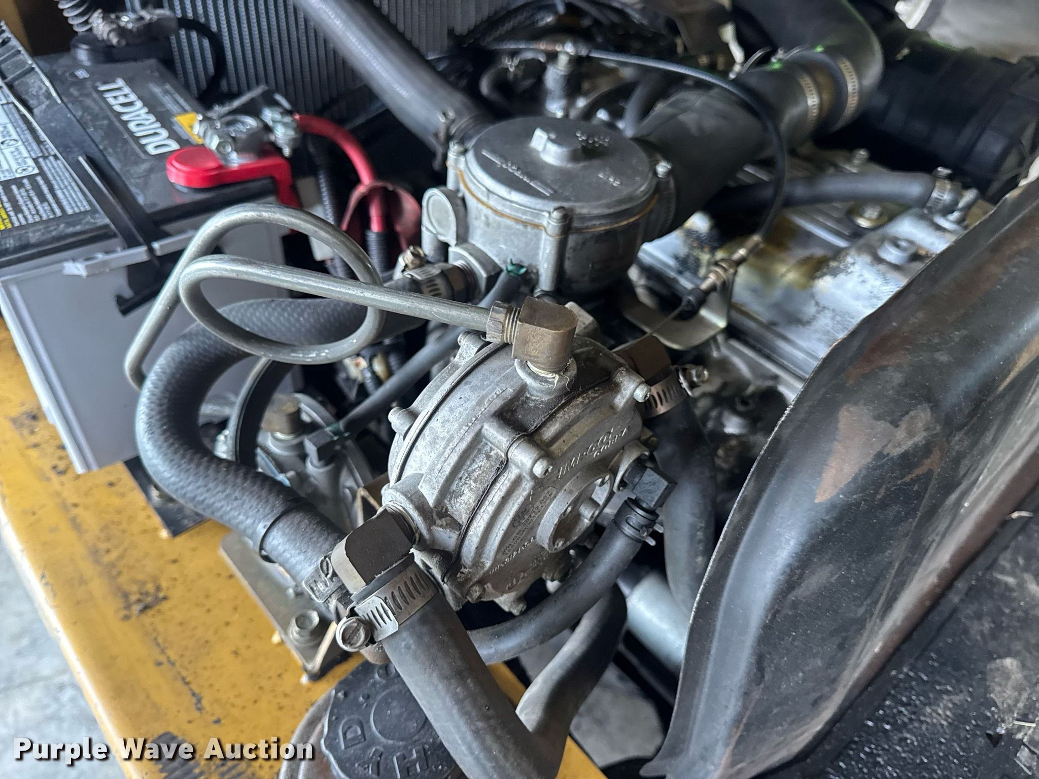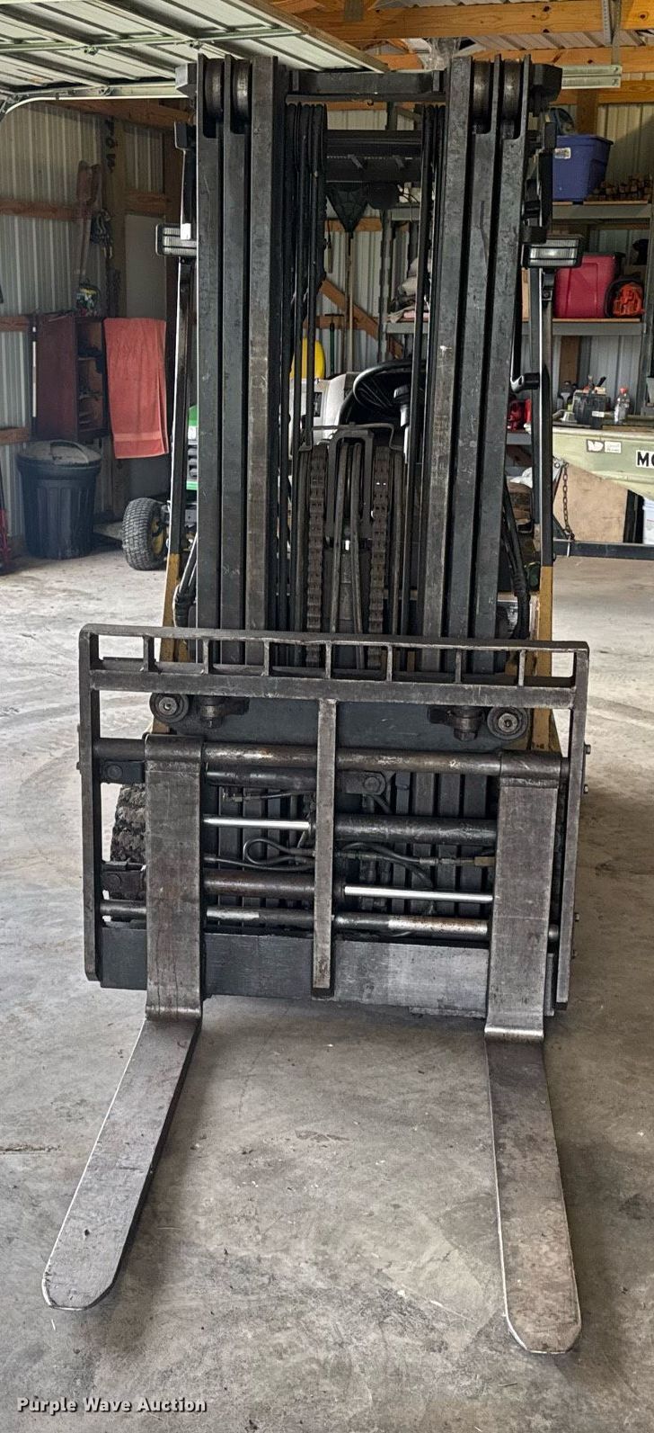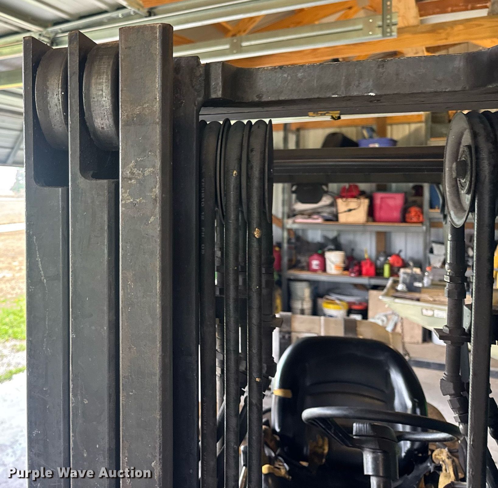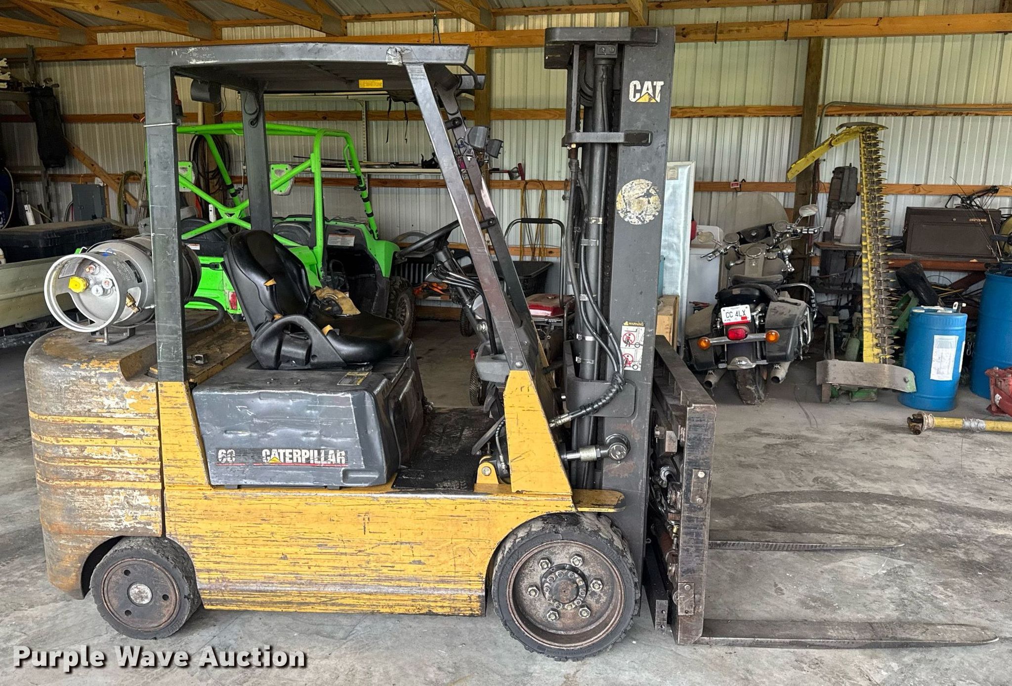 1996 Caterpillar GC30 forklift. Hours: 6,694 on meter, Serial: 6EM01451. Engine Mitsubishi, Cylinders: 4, Fuel type: LPG LP bottle: Not included. Transmission Powershift. Operators station OROPS. Features Maximum lift capacity: 6,000 lbs, Maximum lift height: 187", Collapsed mast height: 82", Mast stages: 3, Side shift, Mast tilt, Fork positioner, Fork length: 42". Tires Front: 21X8X15, Rear: 16X6X10, Solid. Notes Engine issues, smokes , Tires issues, cracking. Monroe City, MO 63456