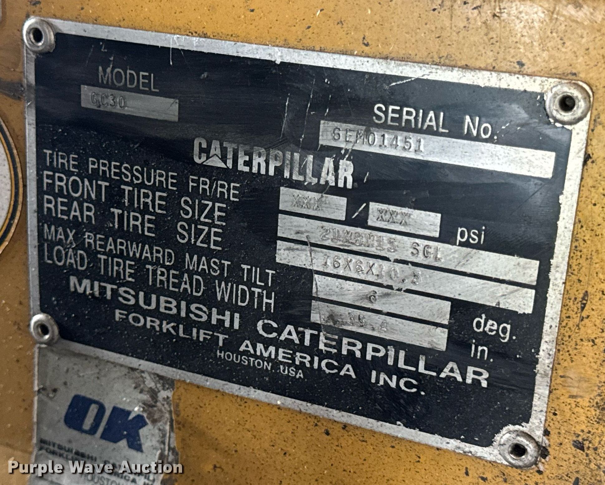 Purple Wave is selling a used Cushion Tire or Pneumatic Forklift in Missouri. This item is a 1996 Caterpillar GC30 forklift with the following: Hours: 6,694 on meter, Serial: 6EM01451
