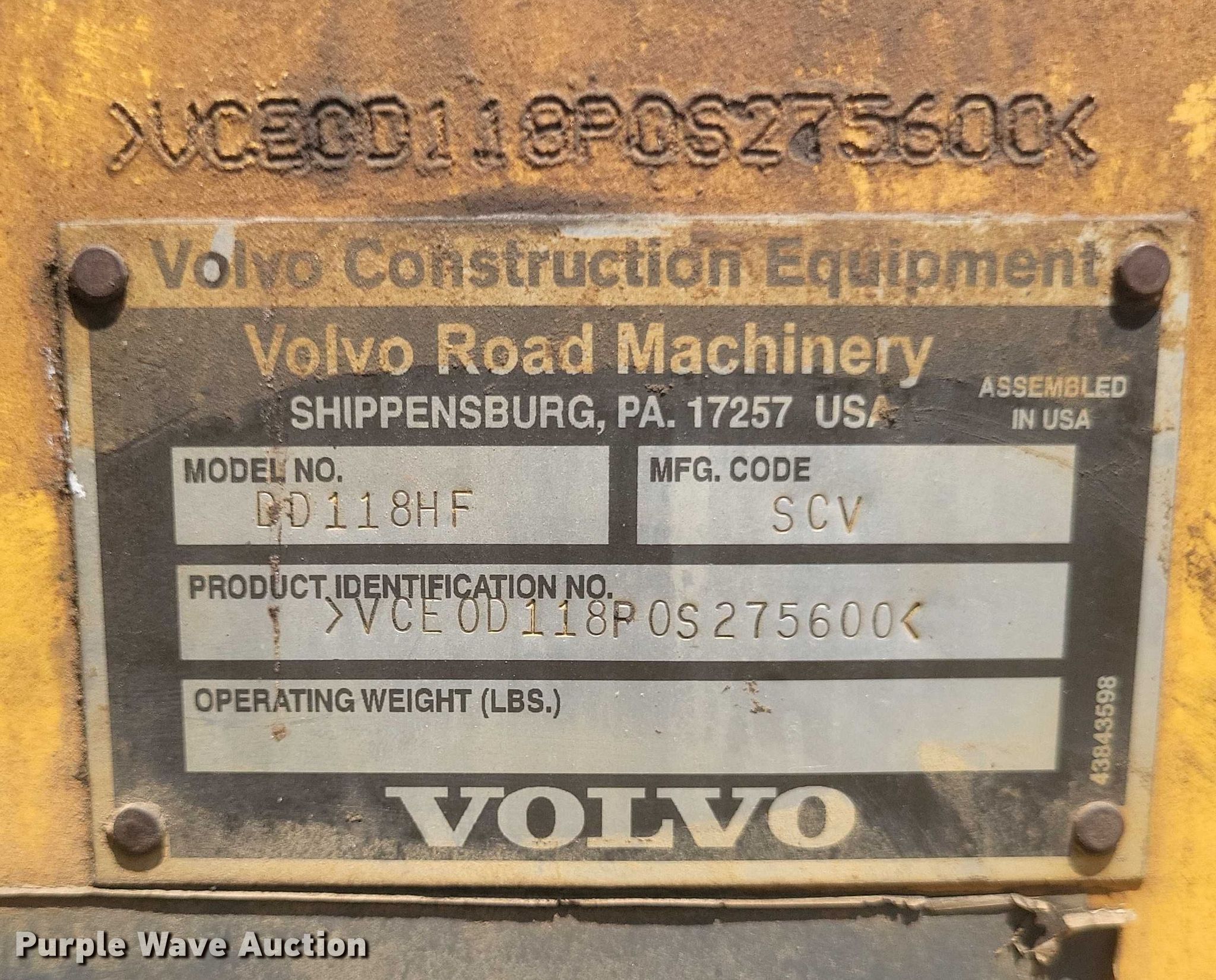 Purple Wave is selling a used Double Drum Roller Compactor in Missouri. This item is a 2011 Volvo DD118HF double drum vibratory roller with the following: Hours: 6,834 on meter, Serial: VCE0D118P0S275600, Unit #: 324297