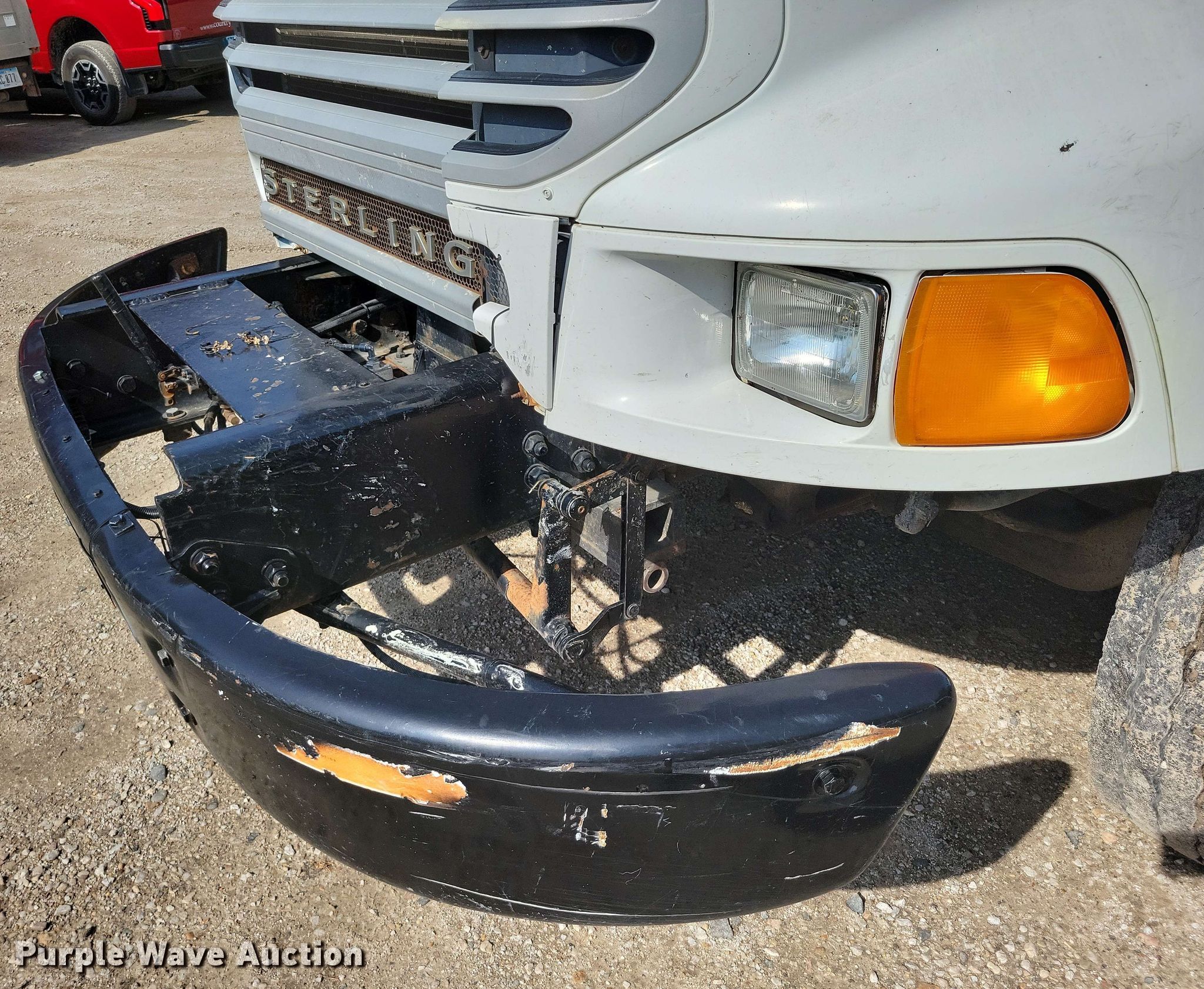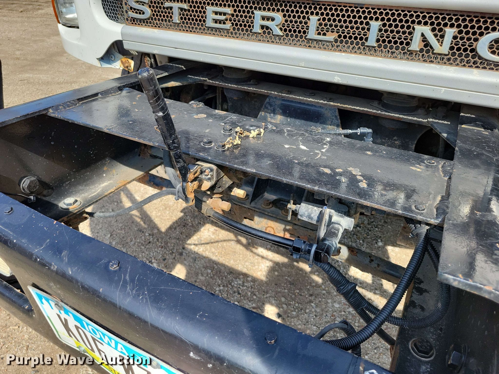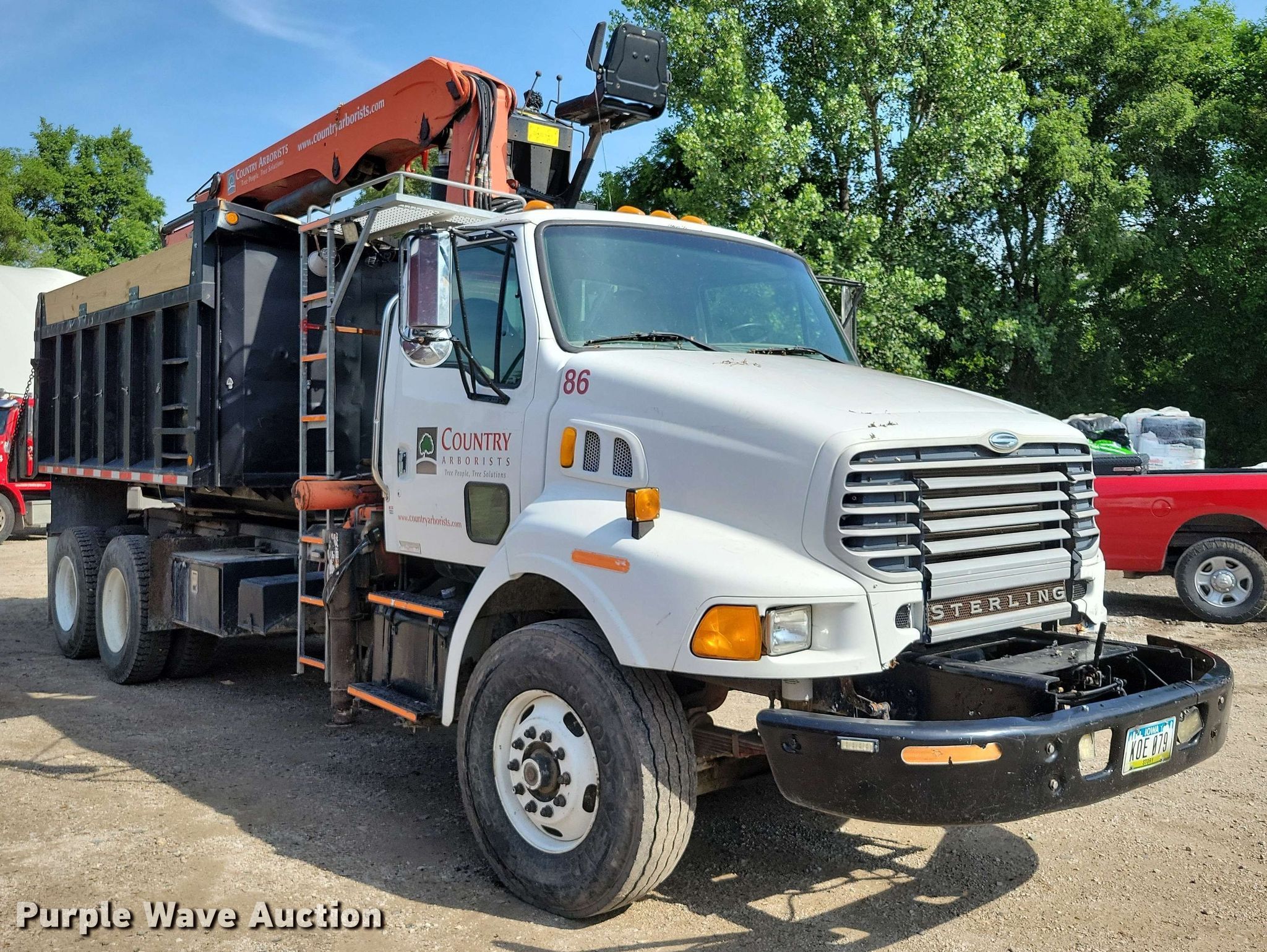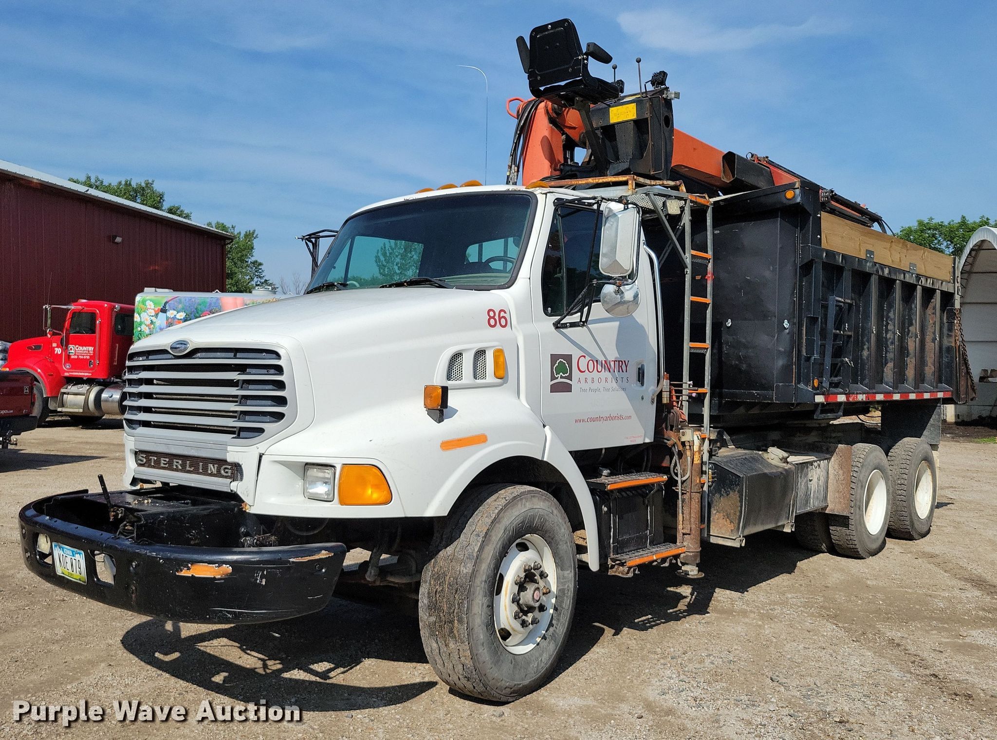 2003 Sterling LT8500 grapple crane truck. Miles: 287,810 on odometer, VIN: 2FZHAWAK63AL84641. Engine Caterpillar 3126E, Serial: 64116G009, Displacement: 7.2L, Cylinders: 6, Fuel type: Diesel. Transmission Eaton Fuller Roadranger, Manual, Speed: 10. Chassis Axles: Tandem, Differential lock: Inter-axle, Suspension: Spring over walking beam, Brakes: Air, PTO, GVWR: 56,000 lbs FAWR: 16,000 lbs, IAWR: 20,000 lbs, RAWR: 20,000 lbs. Interior AC, Heat, Cruise control, Brake controller. Features Dump bed 14' L x 96" W, Rotating dump bed, Crane Boom Telescopic, Knuckle, Maximum boom length: 28' Sections: 3, Boom controls Platform/ basket, Outriggers. Tires Front: 315/80R22.5, Rear: 11R22.5. Notes Remanufactured engine, Crane tower hydraulic issues, leaks, Air tank issues, leaks. Iowa title. Title distribution may be delayed up to 14 days from verification of funds. Country Landscapes, Inc.. Ames, IA 50010