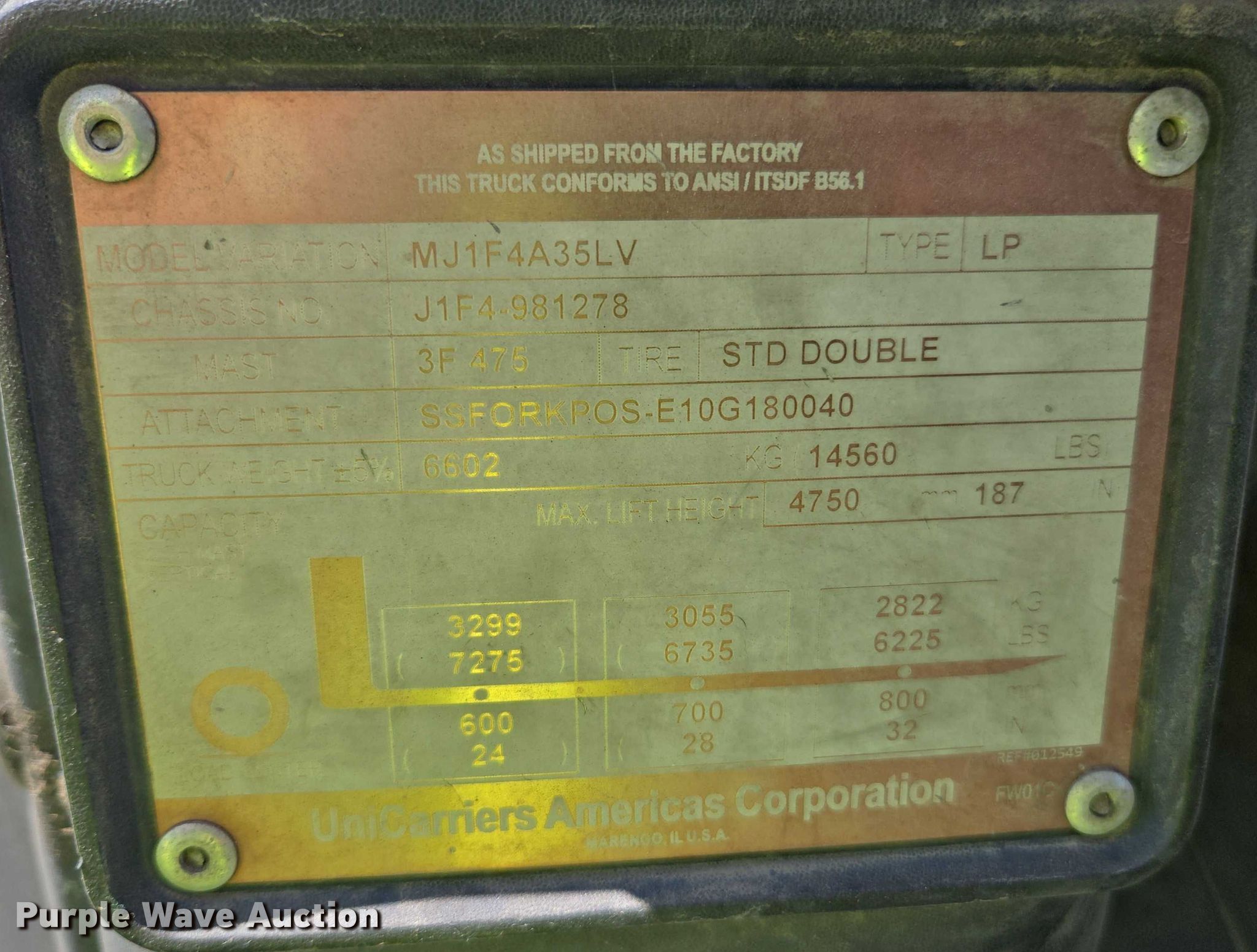 2015 Nissan PF80YLP forklift. Hours: 3,224 on meter, Serial: J1F4-981278. Engine GCT GNFXB04.546D, Displacement: 4.5L, Cylinders: 6, Fuel type: LPG. Transmission Automatic. Operators station OROPS. Features Maximum lift capacity: 7,275 lbs, Maximum lift height: 187", Collapsed mast height: 89", Mast stages: 3. Tires Front: 8.25-15/6.50, Rear: 7.00-12/5.00. Ferguson. Fresno, CA 93725