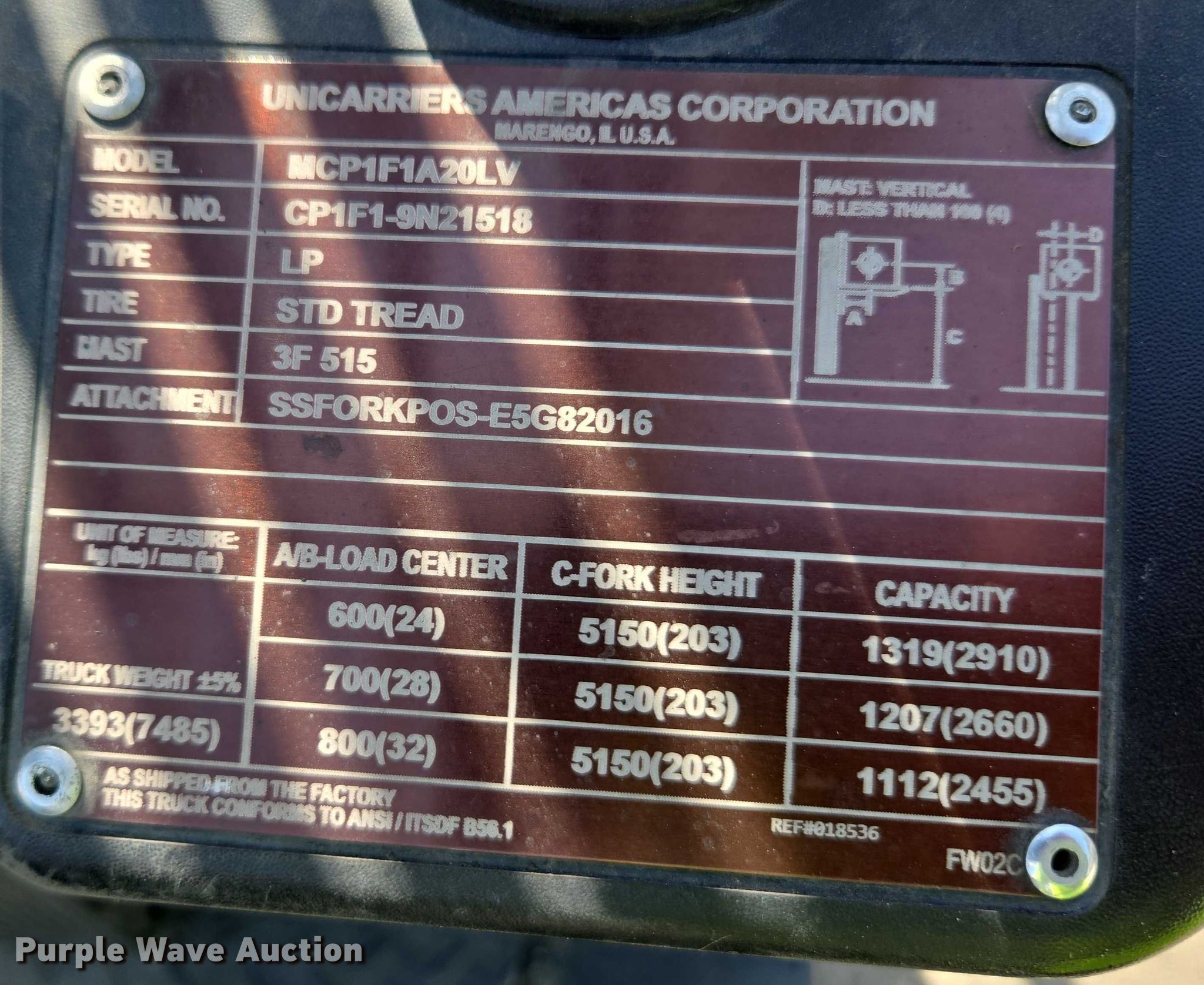 Purple Wave is selling a used Warehouse Forklift in California. This item is a 2017 UniCarriers CFS40 forklift with the following: Hours: 3,971 on meter, Serial: CP1F1-9N21518, Unit #: SFS2114